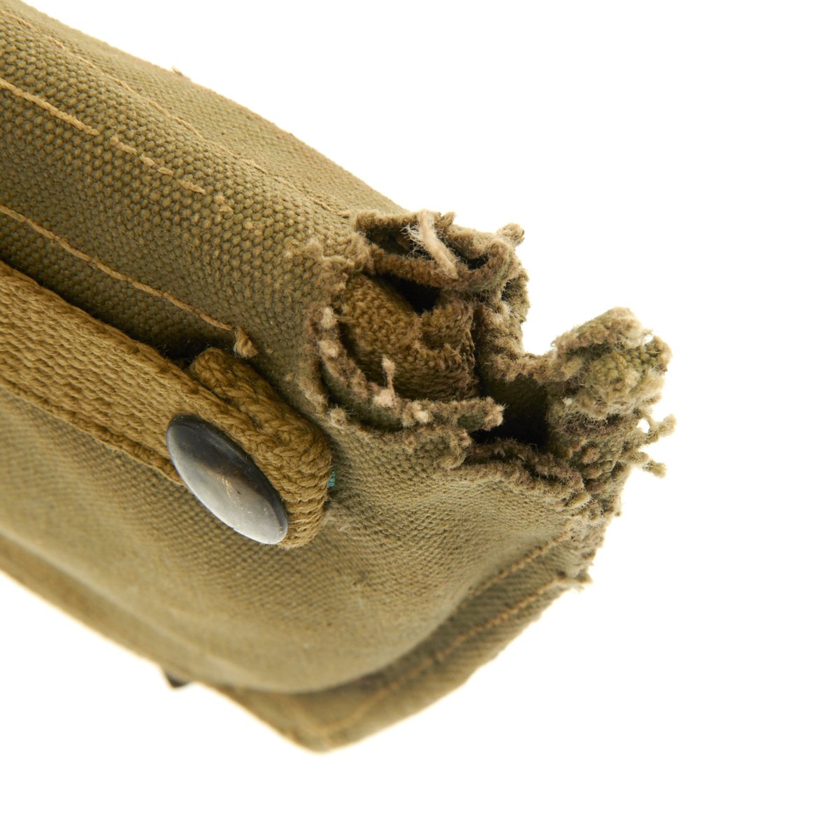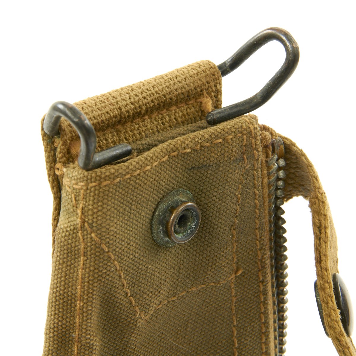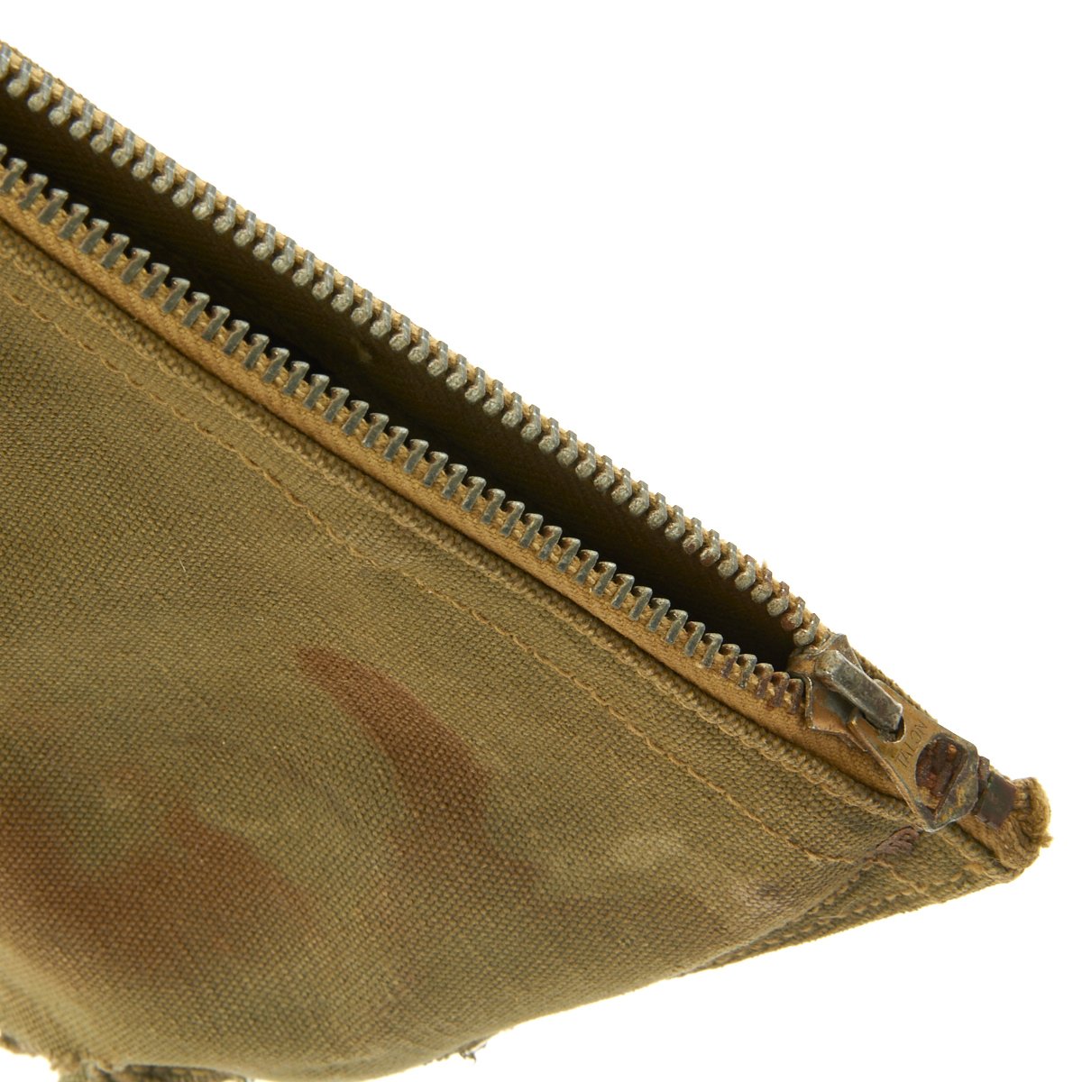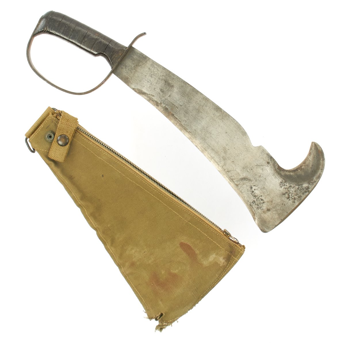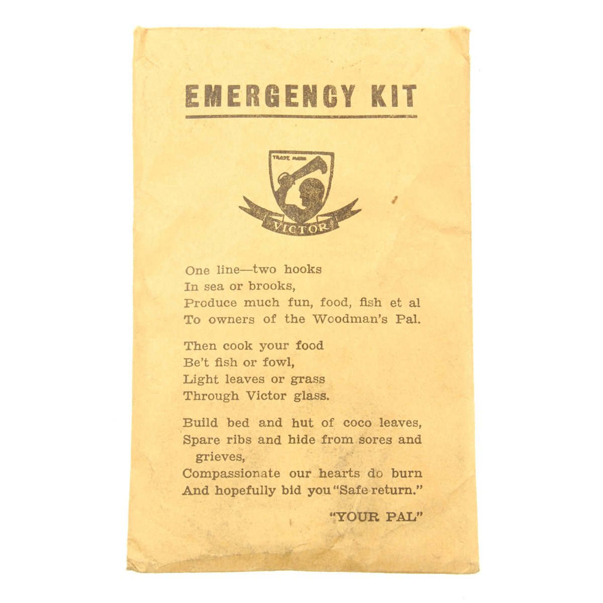 The scabbard is fully functional, with all snaps and the zipper still intact, and is quite nice. It does however have significant wear on the lower corner, which appears to be from service and use, as the scabbard would rub on the uniform and catch on brush. The zipper is intact and functional. The double-sided round whetstone is included in the correct pocket, however it is worn on both sides, indicating significant use with the tool. The other interior pocket contains a packet with the Victor Tool logo, which is marked EMERGENCY KIT. Inside is one fishing line with two hooks (still very sharp!!!), along with a small booklet called:LIVING IN THE JUNGLE WITH U.S. ARMY KNIFE LC-14-B (THE WOODMAN'S PAL), written by Frederick Ehrsam, C.E., and copyrighted 1943. The booklet, packet, and fishing line with hooks are all in great shape.