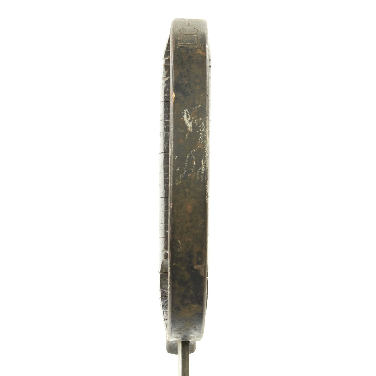 It is further marked on the outside of the handguard with LC-14-B. The absence of a patent number on the blade indicates production before 11-30-1943, when the patent was approved. The belt scabbard is also marked on the interior, though part of the scabbard patent number is obscured by dirt: