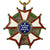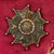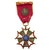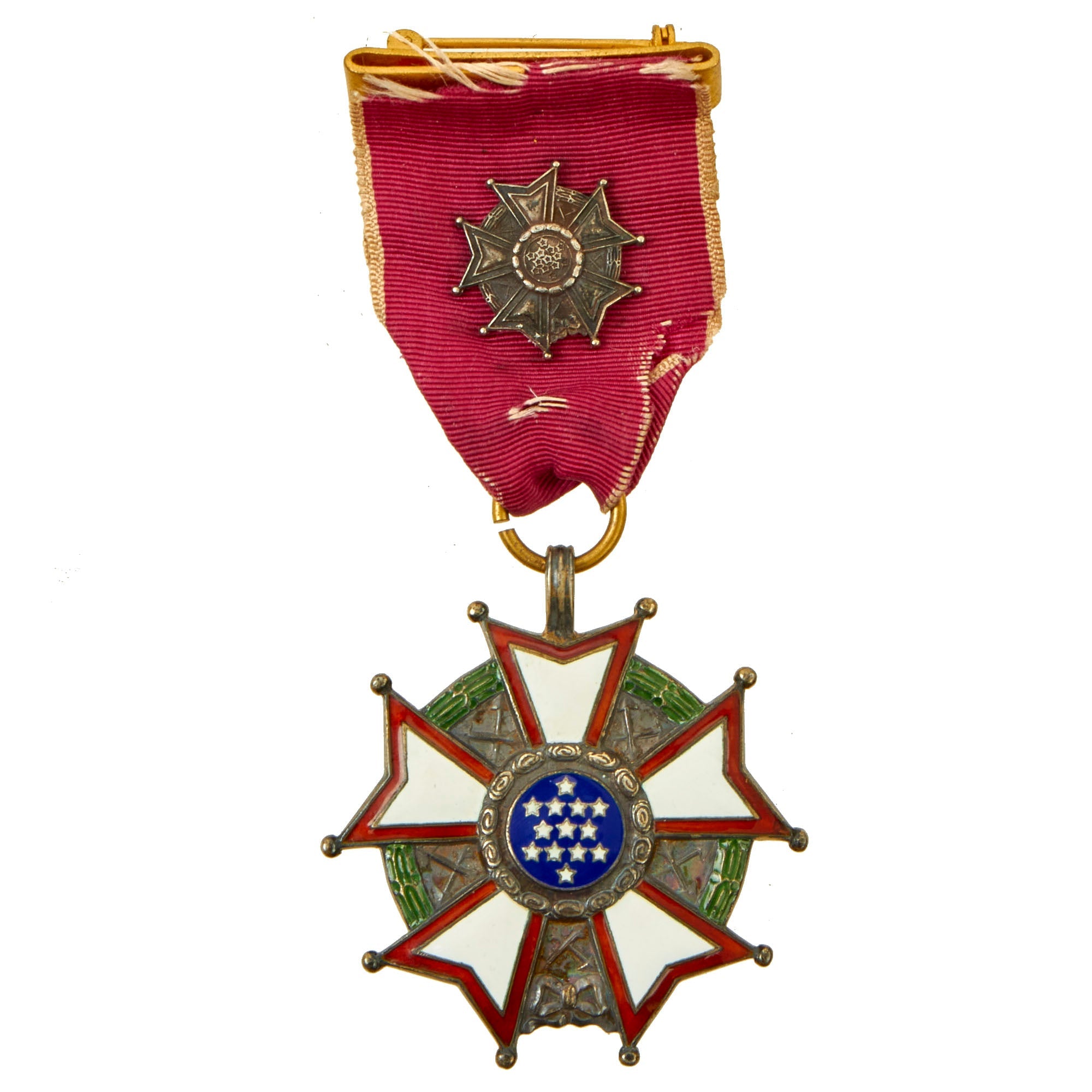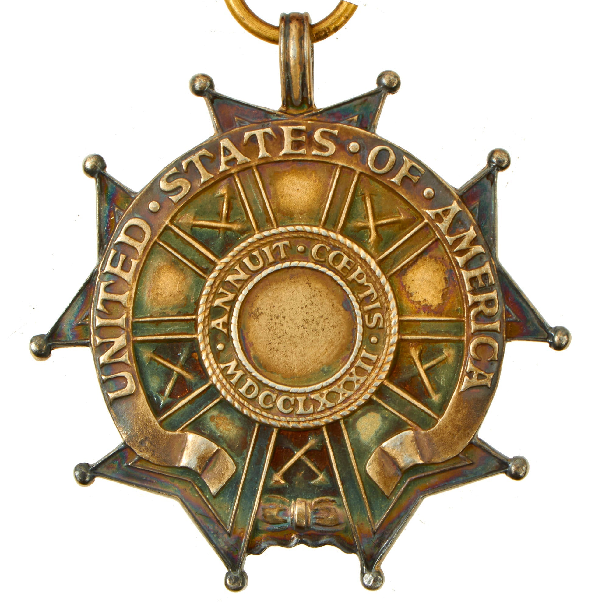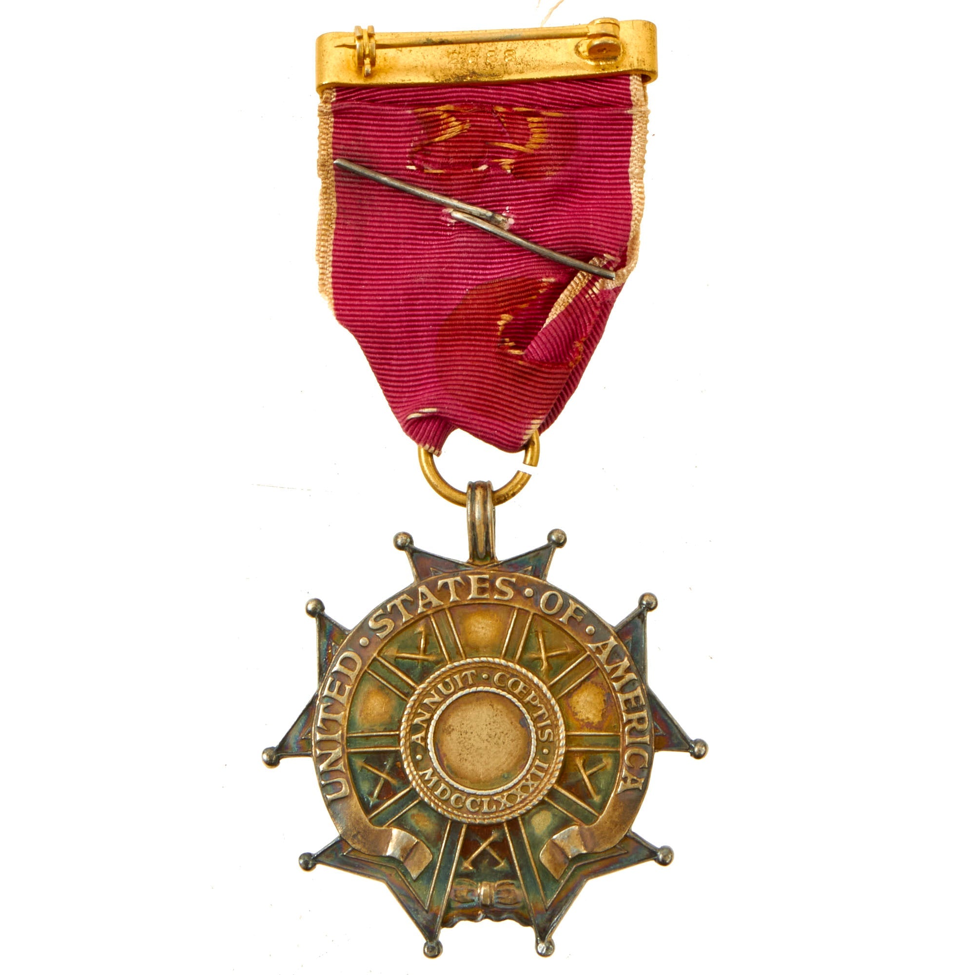 The Officer Degree of the Legion of Merit Medal is, on a wreath of green laurel joined at the bottom by a gold bow-knot (rosette), a five-pointed white star bordered crimson, points reversed with v-shaped extremities tipped with a gold ball. In the center, a blue disk encircled by gold clouds, with 13 white stars arranged in the pattern that appears on the Great Seal of the United States. Between each star point, within the wreath, are crossed war arrows pointing outwards, representing armed protection to the Nation. The overall width is is 1+7⁄8 inches (48 mm) and the pendant has a suspension ring instead of the wreath for attaching the ribbon. A gold replica of the medal, 3⁄4 inch (19 mm) wide, is centered on the suspension ribbon. In the center on the reverse, a disk for engraving the name (none present) of the recipient surrounded by the words "ANNUIT COEPTIS MDCCLXXXII": a combination of the motto from the Great Seal, "He [God] Has Favored Our Undertakings", with the date for the first award of a US decoration, the Purple Heart. An outer scroll contains the words "UNITED STATES OF AMERICA."