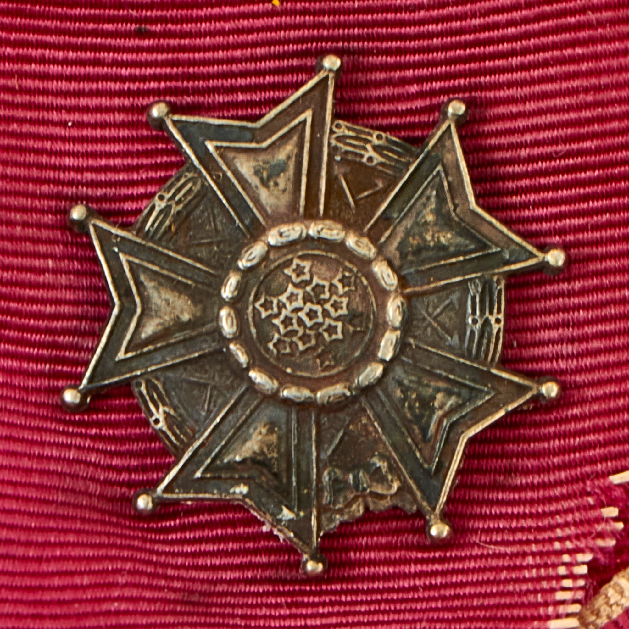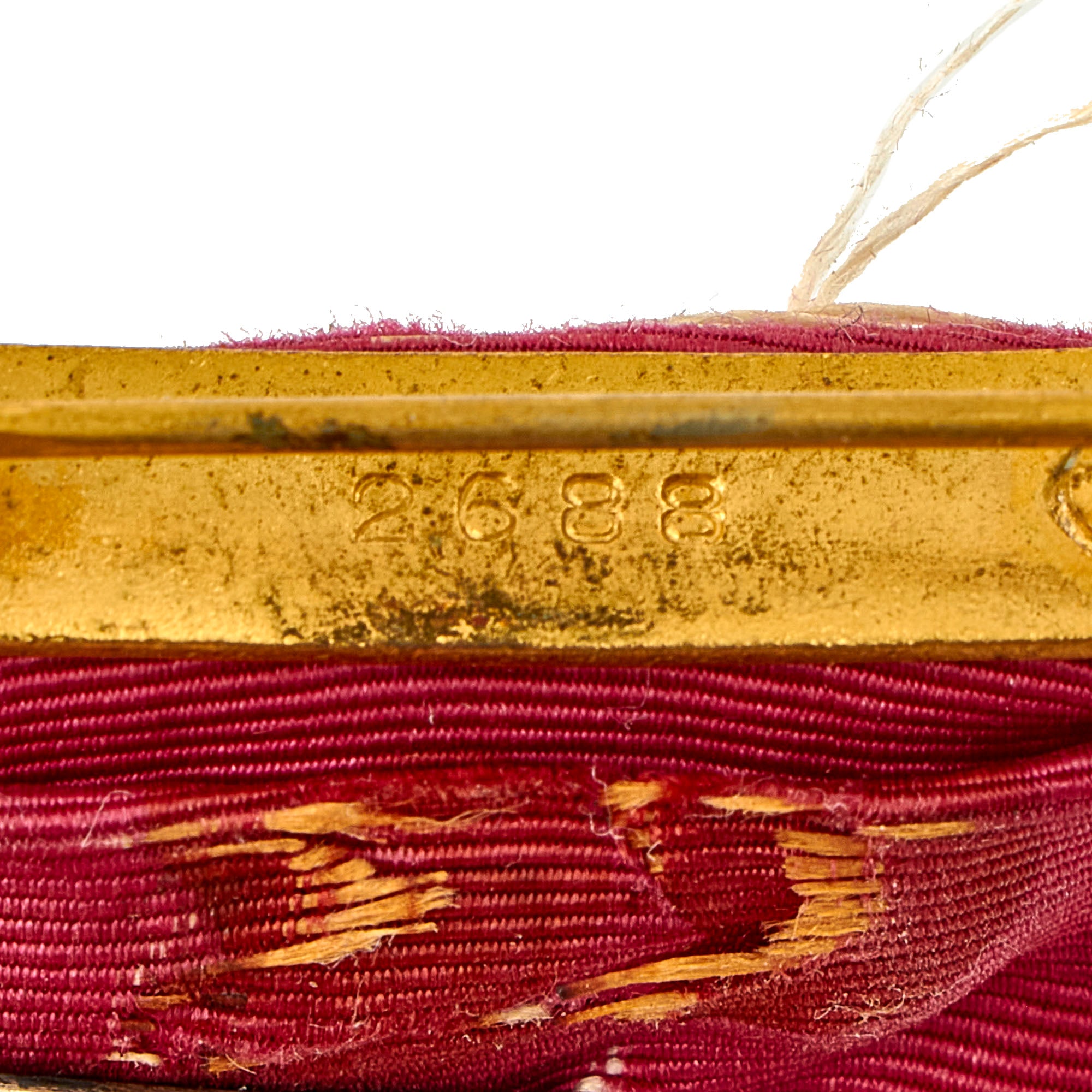 The overall condition is quite nice, especially for being an early issue example. The ribbon is a little worse for wear with tearing along the top portion where the cloth drapes over the brooch. There is scattered fraying present giving this decoration an overall aged and worn appearance. The enamel work on the face of the medallion appears to be 100 percent complete with little to no cracking present.