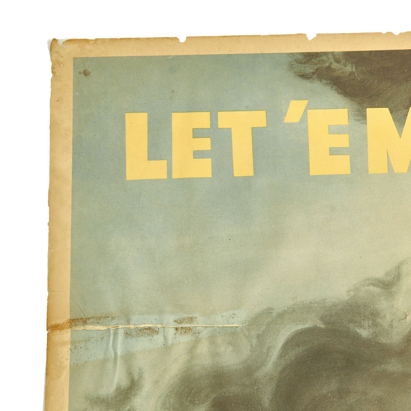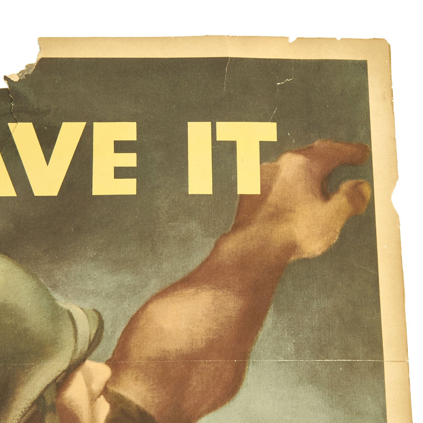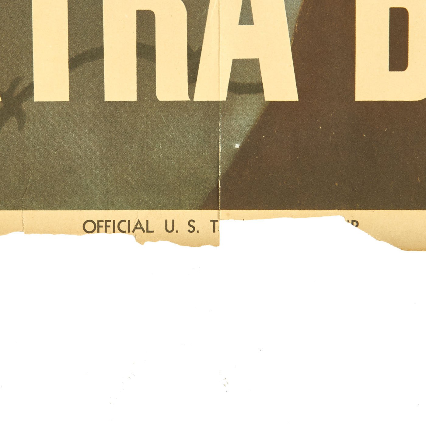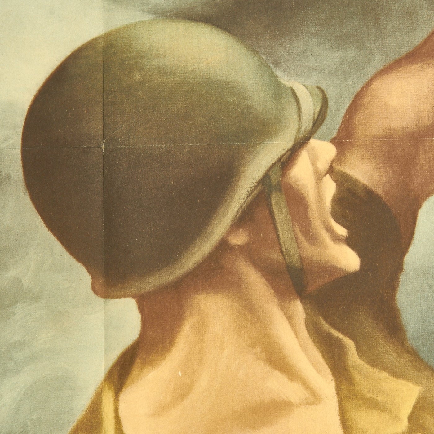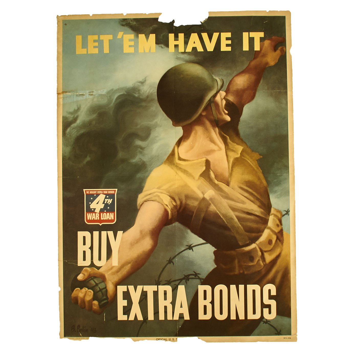 Original Item: Only One Available. Designed by artist Bernard Berlin in 1943. Color image of a soldier preparing to throw a hand grenade. He wears a helmet and his sleeves are rolled up. Smoke and barbed wire can be seen in the background. On the left side of the poster is a red, white, and blue shield logo which reads: "We bought extra war bonds, 4th War Loan". Poster measures 28" x 20.5" and is offered in good condition with some edge wear and los around the top and bottom borders. Original fold lines present, vibrant color, will make a great display, especially when framed.