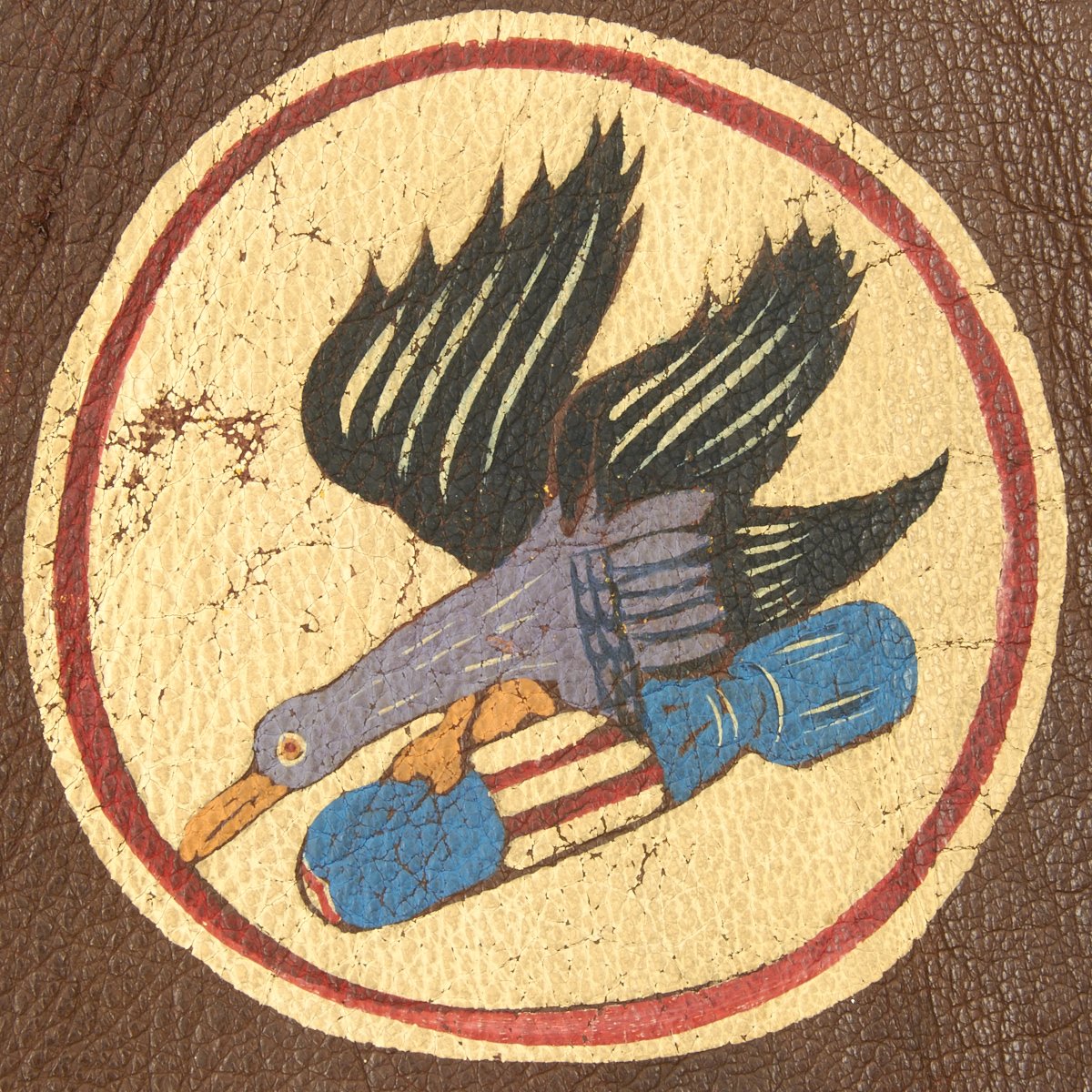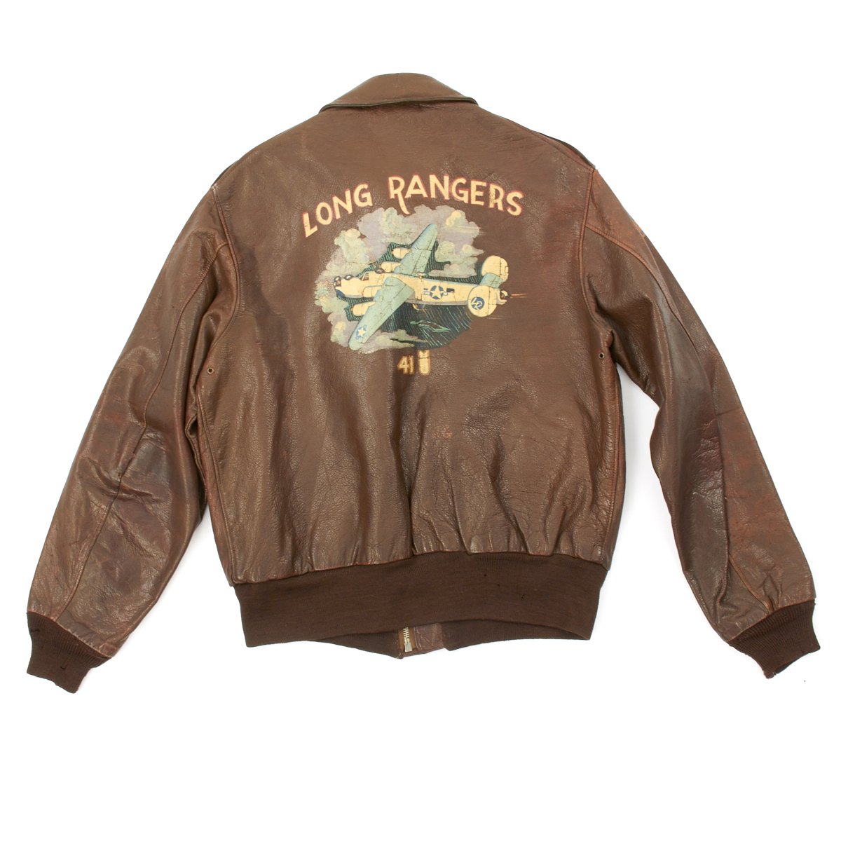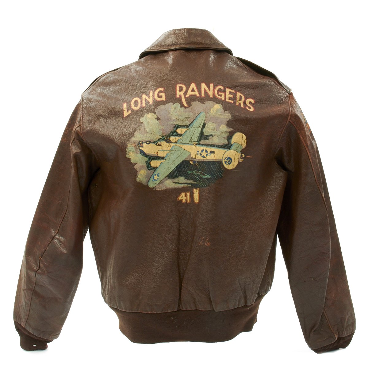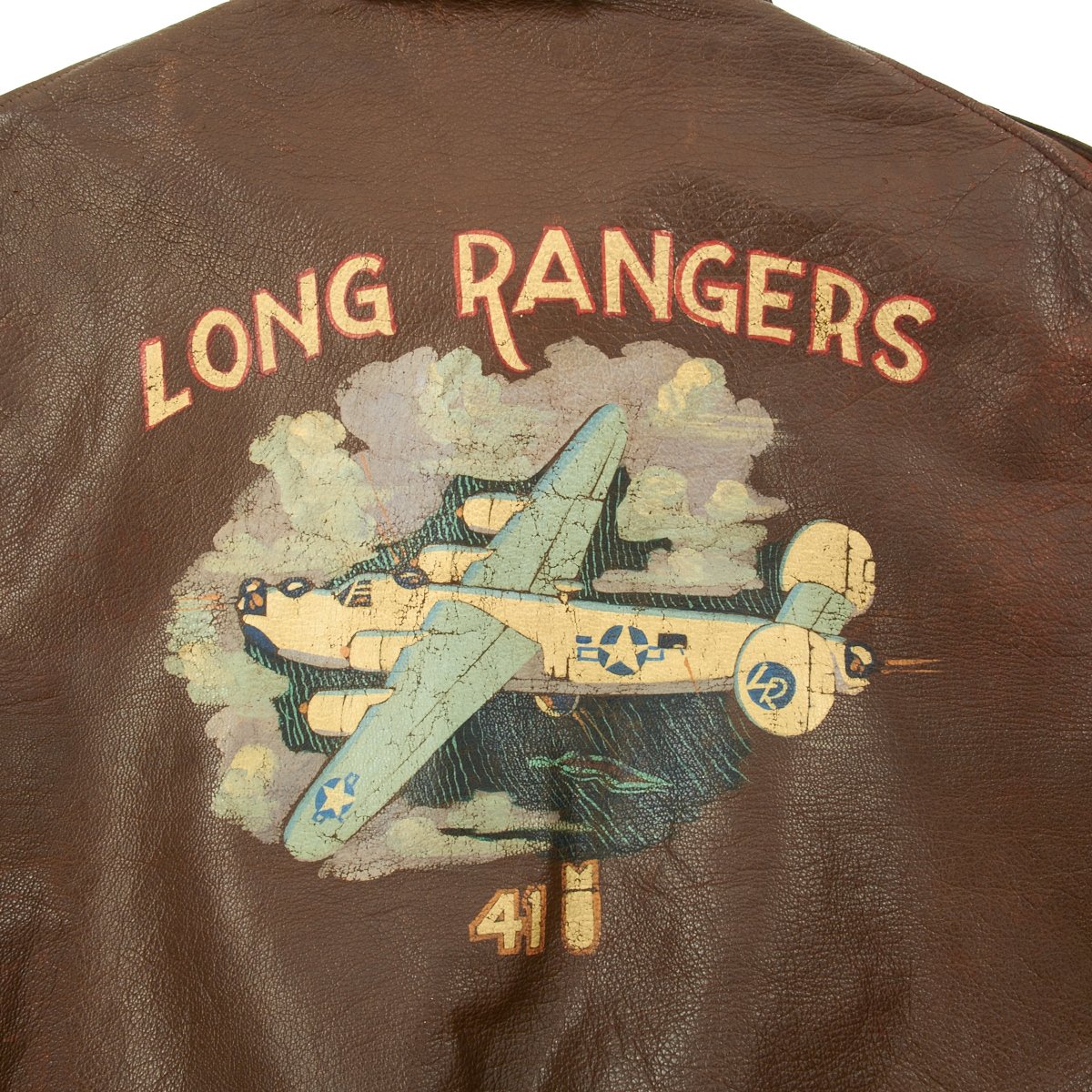 - Reverse of jacket features a hand painted design with "Long Rangers" in white and red paint above full color B-24 Liberator flying through the clouds. Below the plane is 41 next to a bomb, typically this denotes the number os successful bombing mission the owner completed. Often the bombs were not actually painted until the veteran had arrived home from overseas.