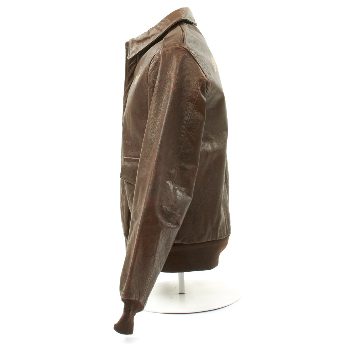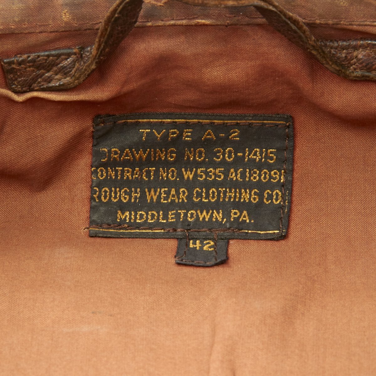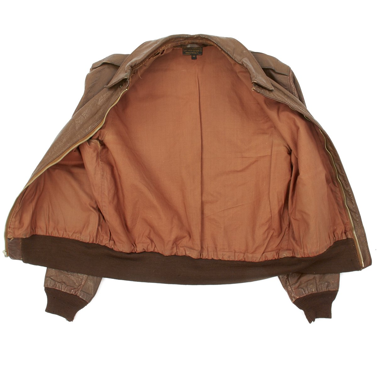 Overall condition of the jacket is excellent. Offered in a large size 42. The leather is still supple and does not have any major cracking or damage. The liner is original and the cuffs and waist band are also original with expected wear. The zipper is by Talon and fully functional. There is an original maker data tag by Rough Wear Clothing Co. The tag appears to have been restitched into the jacket, meaning its possible the lining was replaced, however, the lining does appear to be original due to the wear. The knit cuffs and waist band may be period correct replacements and show minor wear.