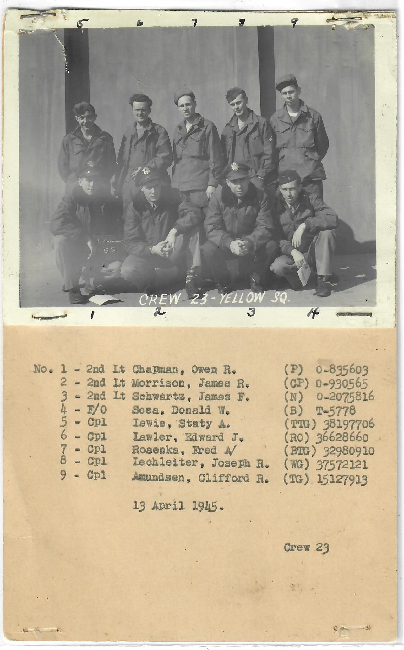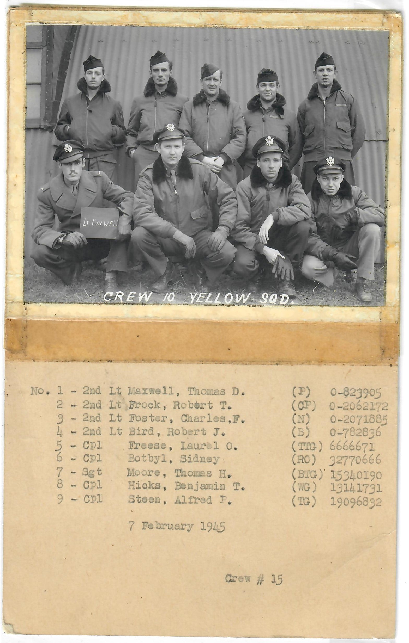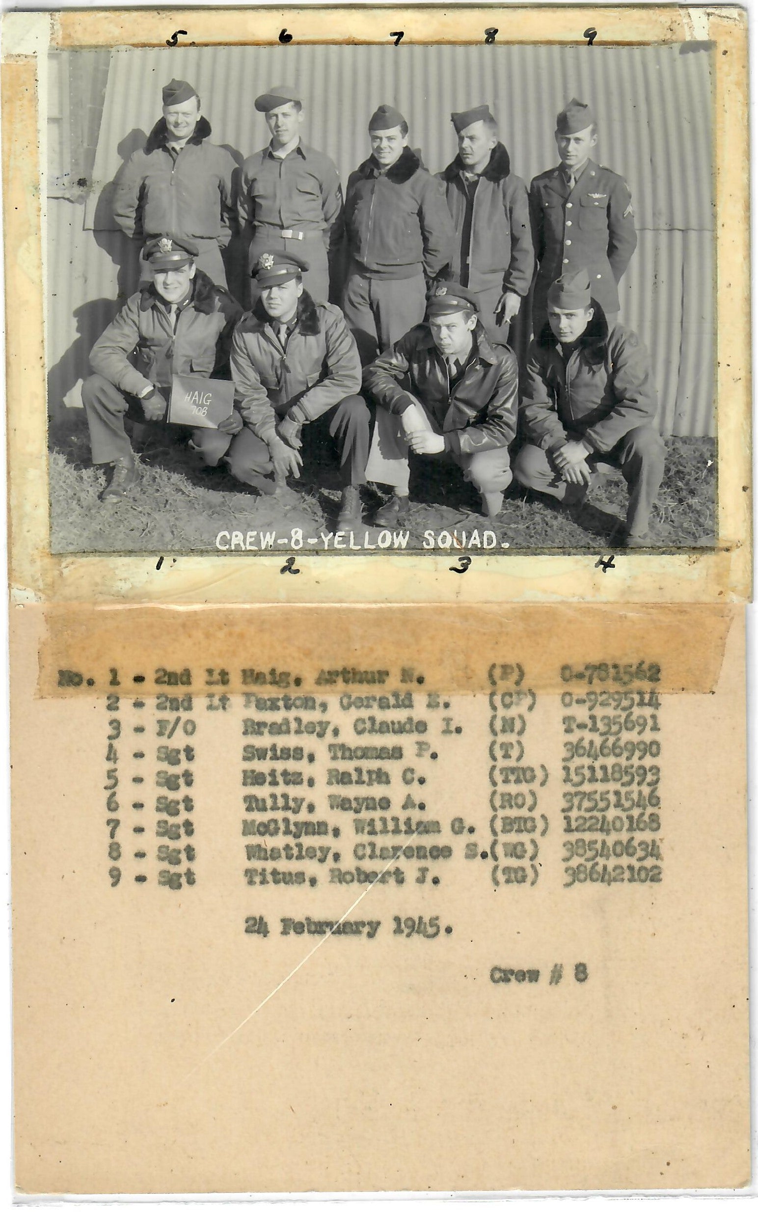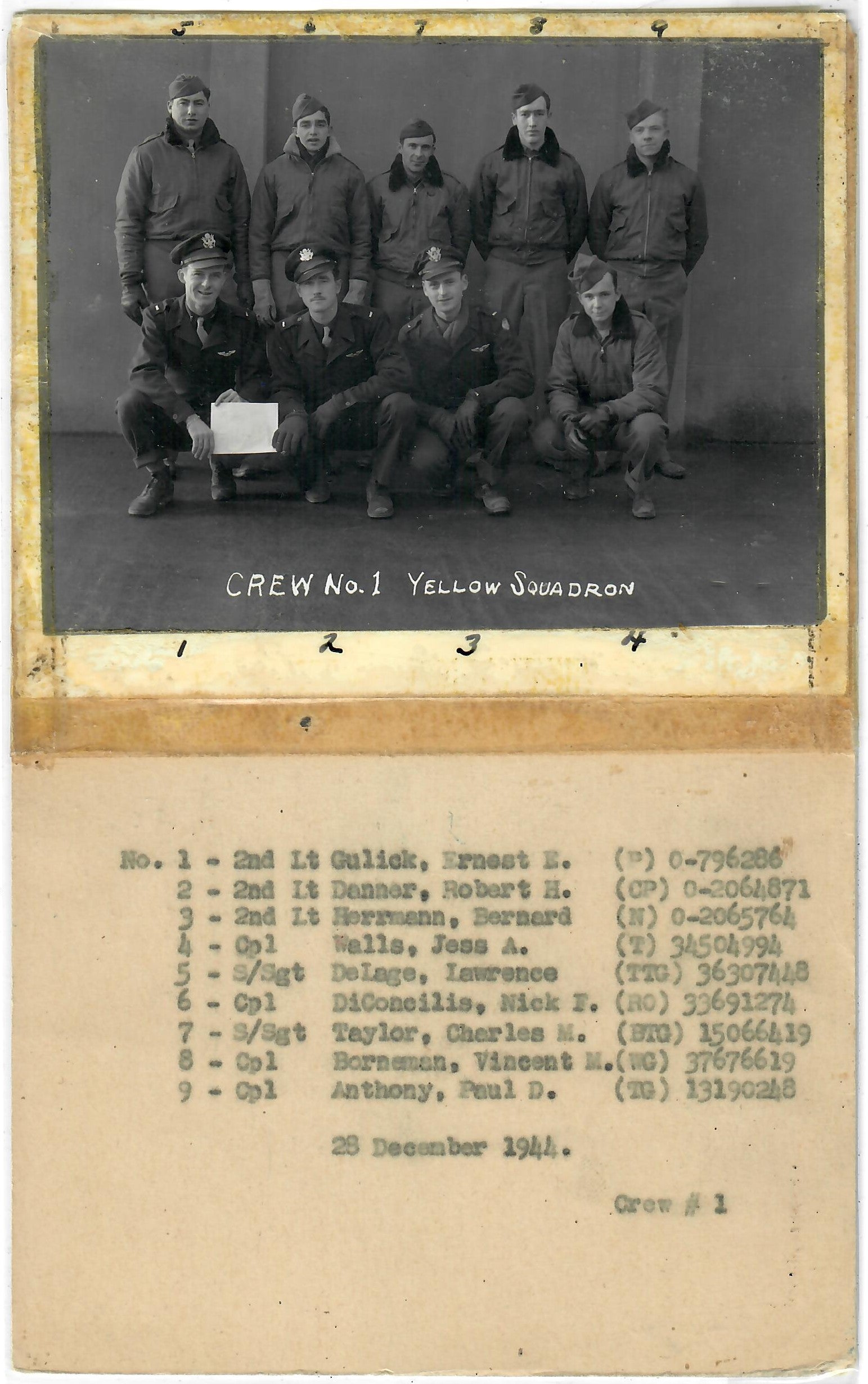 Original Item. One-of-a-Kind. This is a strikingly rare set of thirteen (13) photographs and rosters of different crews of the 708th “Yellow” Bombardment Squadron, part of the 447th Bombardment Group, 8th Air Force, all being taken between 1944 and 1945. The list includes Crews 1, 2, 3, 4, 7, 8, 9, 10, 13, 14, 15, 20, and 23.