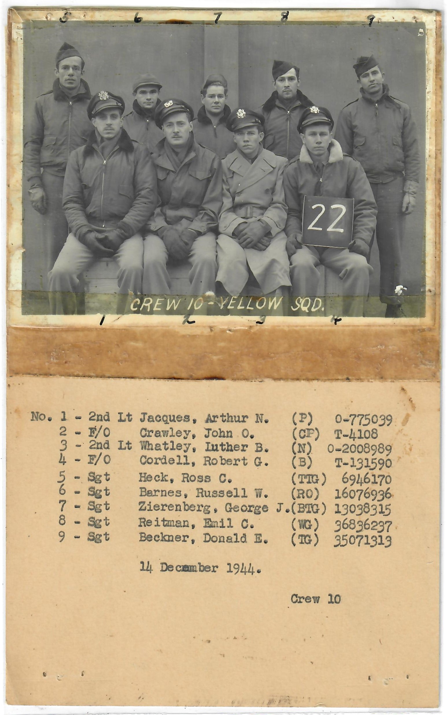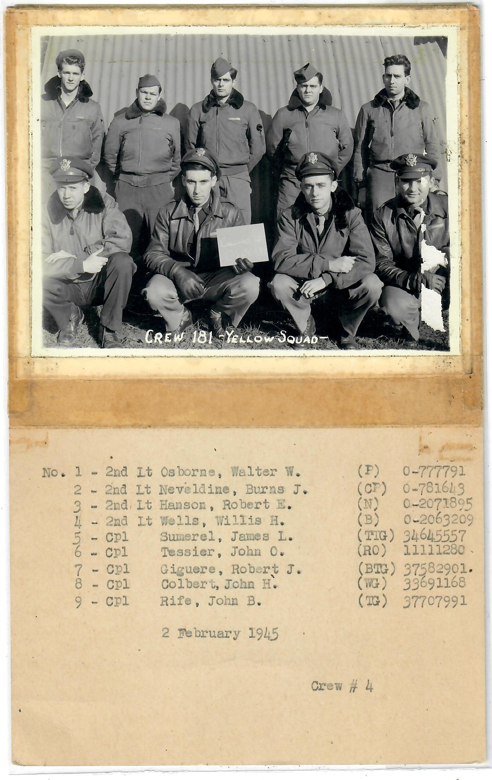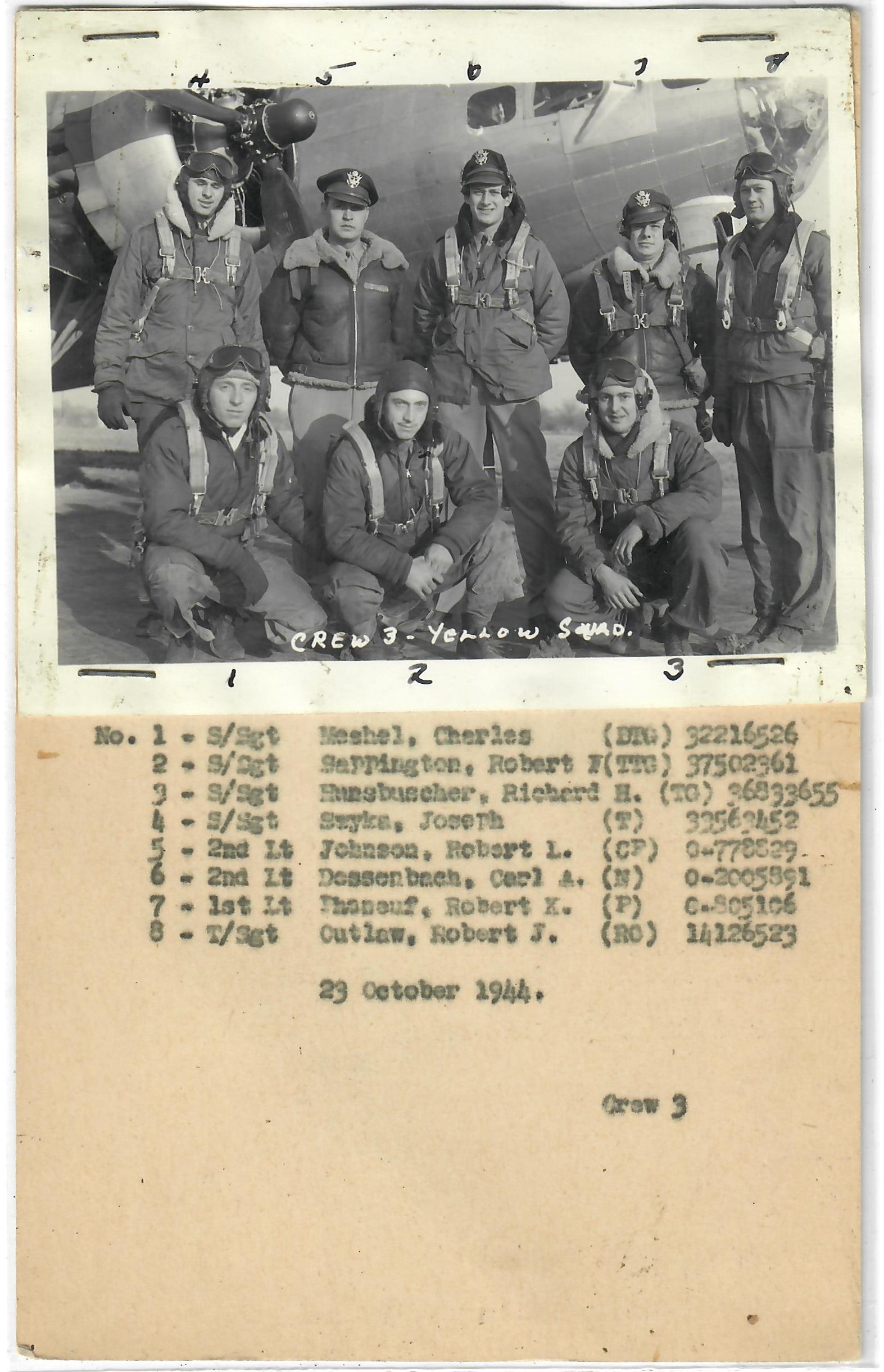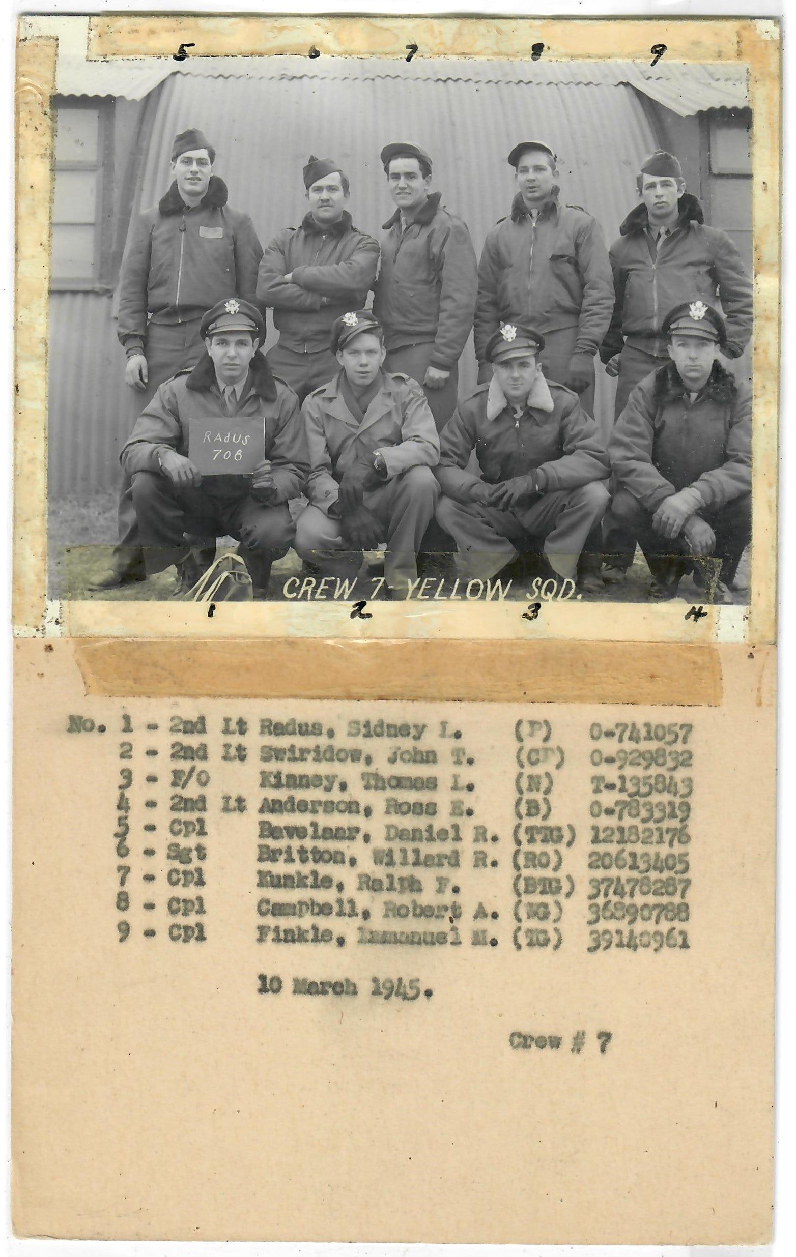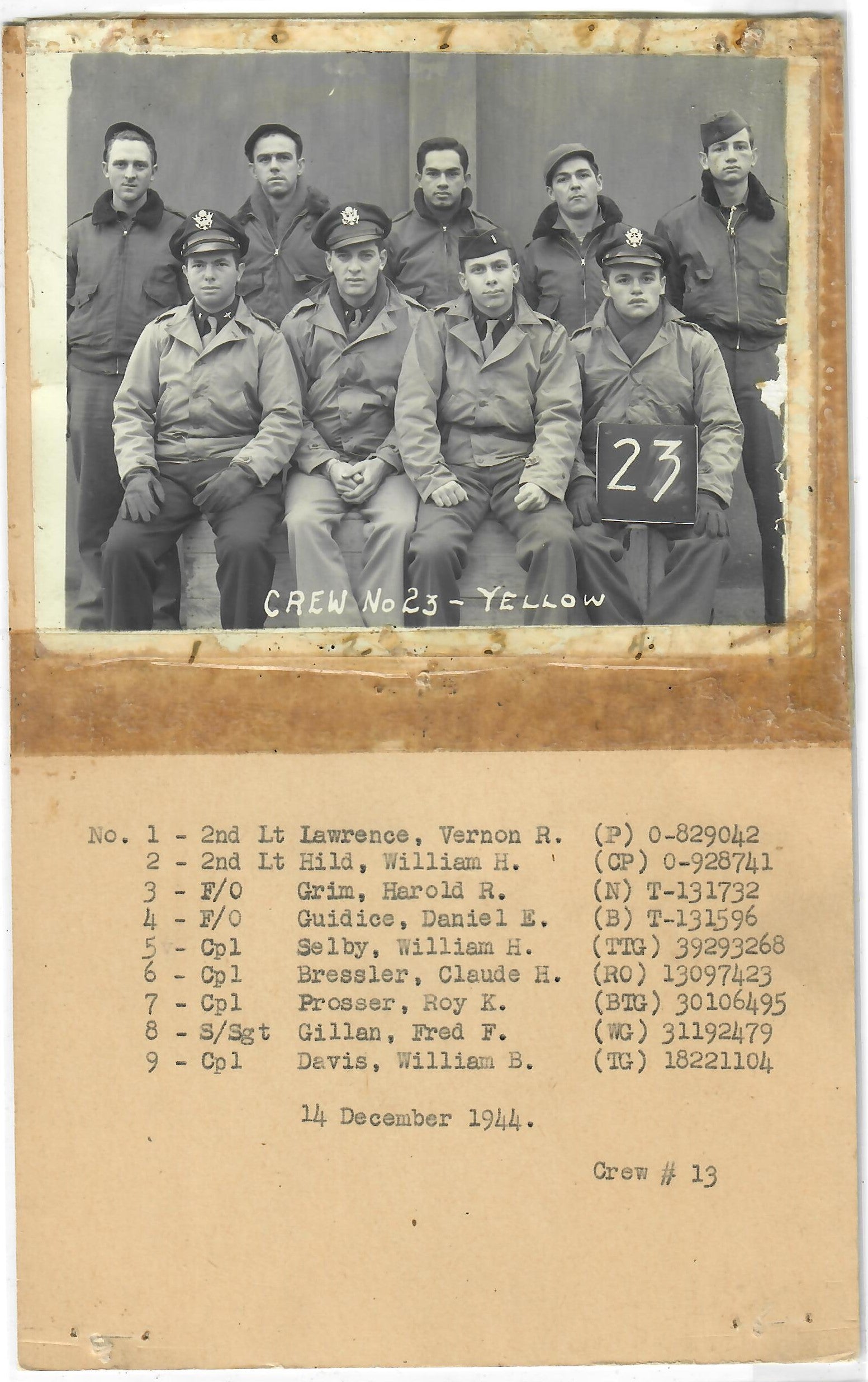 Original Item. One-of-a-Kind. This is a strikingly rare set of thirteen (13) photographs and rosters of different crews of the 708th “Yellow” Bombardment Squadron, part of the 447th Bombardment Group, 8th Air Force, all being taken between 1944 and 1945. The list includes Crews 1, 2, 3, 4, 7, 8, 9, 10, 13, 14, 15, 20, and 23.