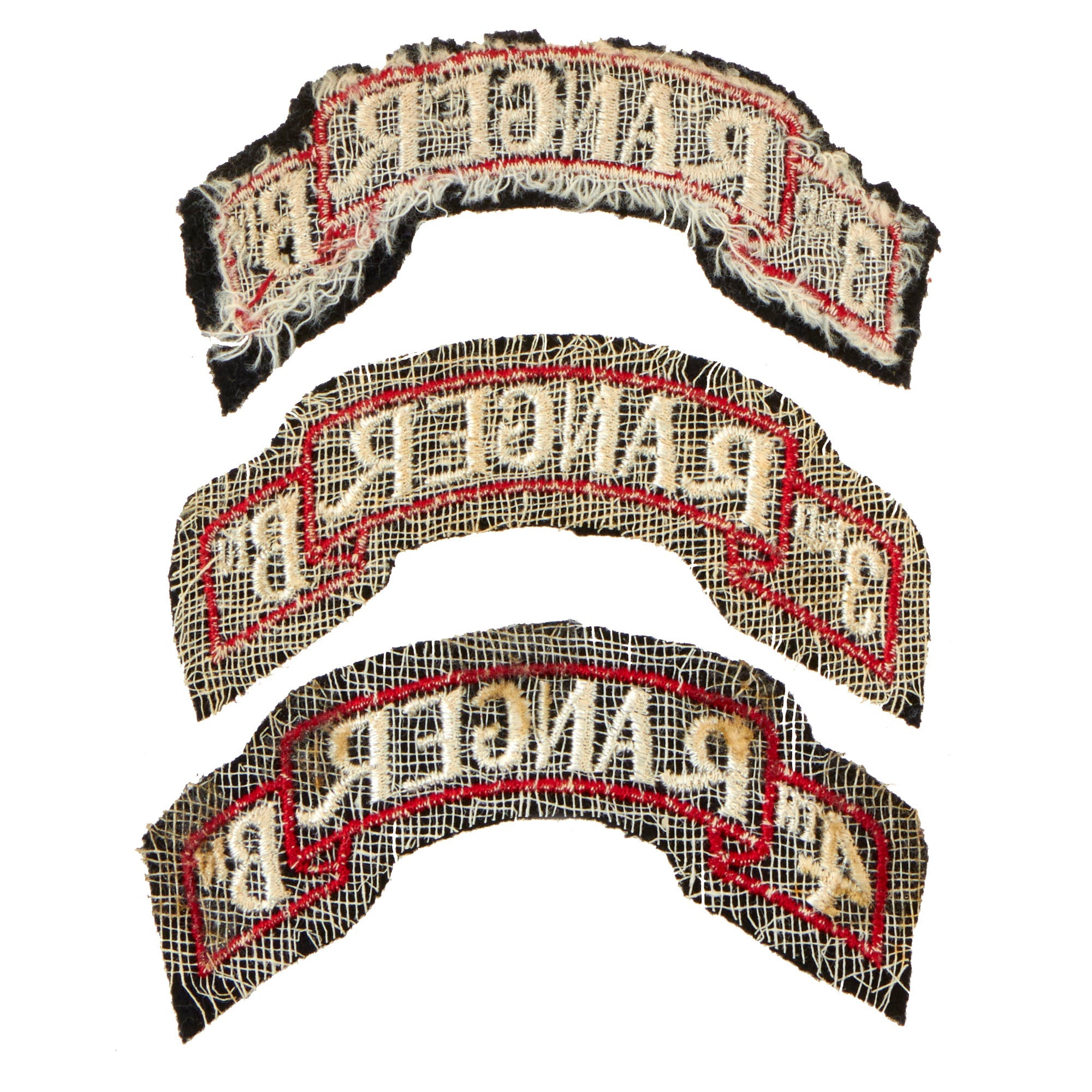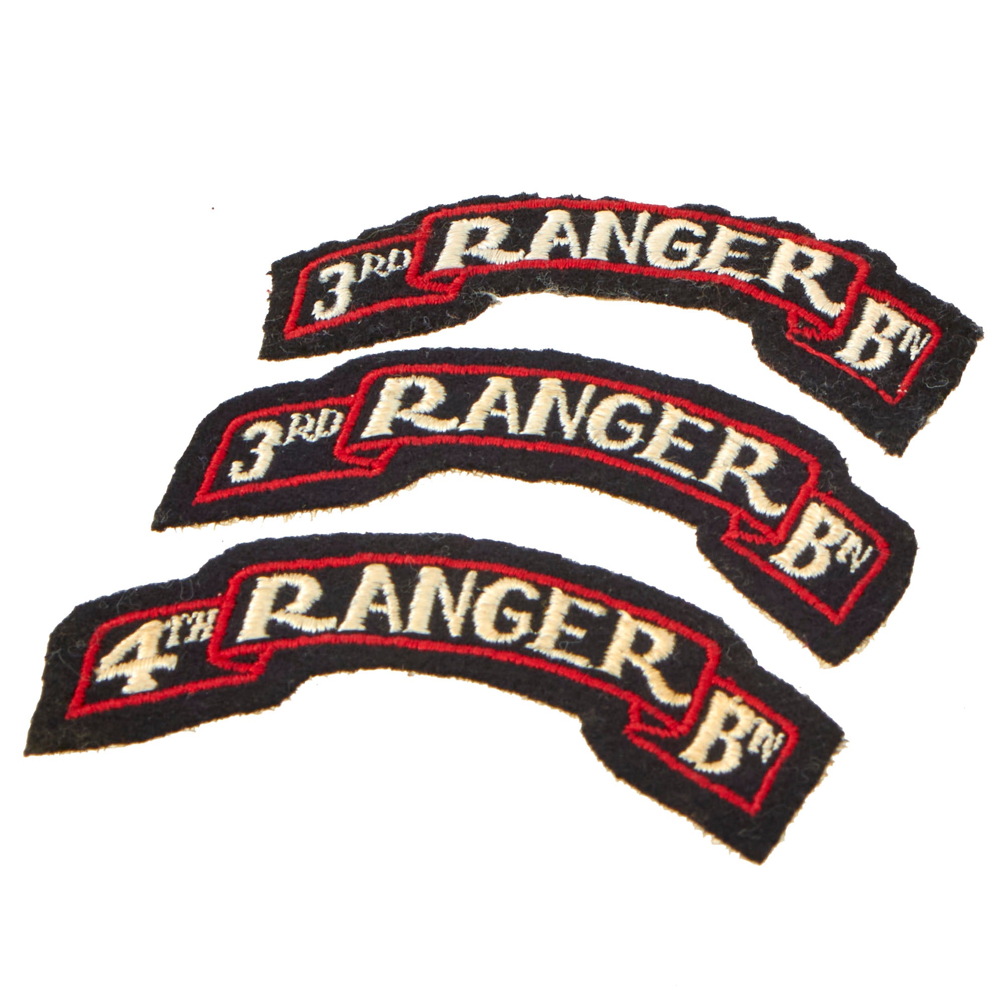 This is a great lot of three WWII Ranger Battalion scrolls, two for the 3rd Ranger Battalion and one for the 4th Ranger Battalion. They each measure roughly 1⅞ x 3¾”. One of the 3rd Battalion scrolls has some material loss along the edges, but the others are in good condition.