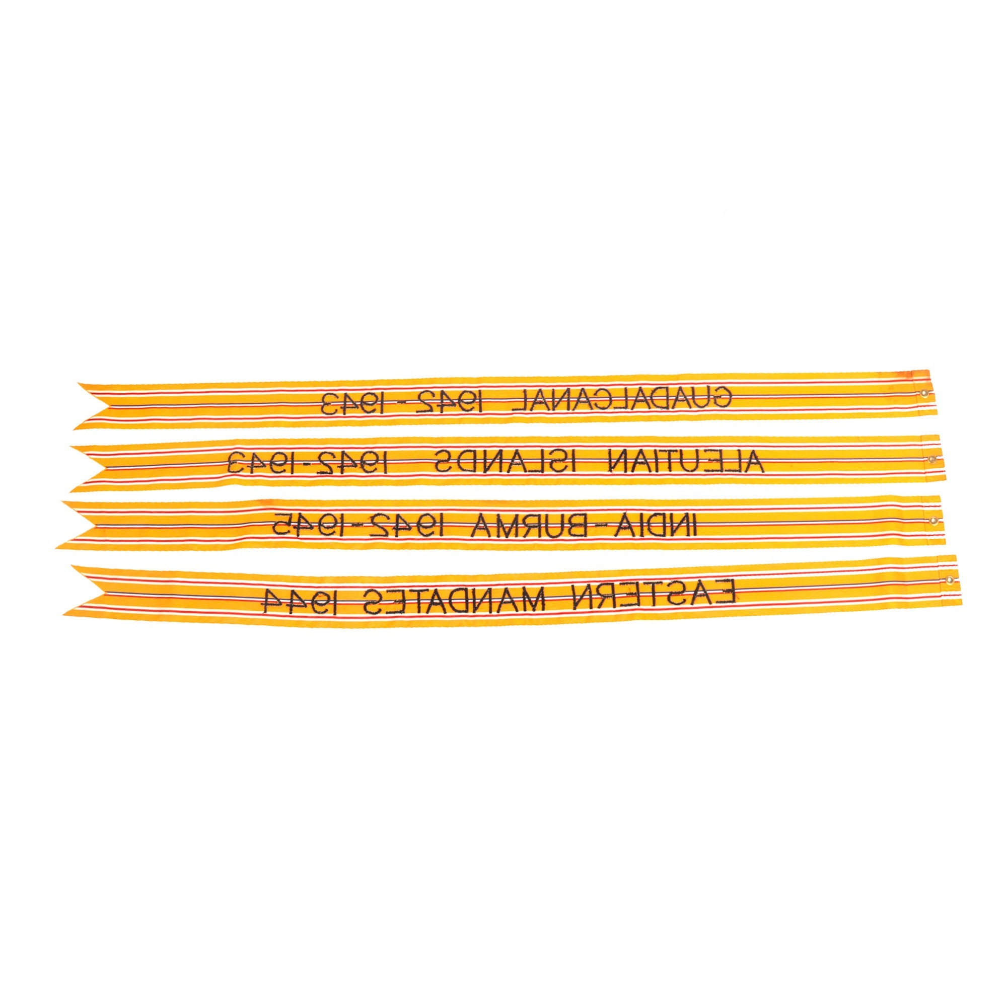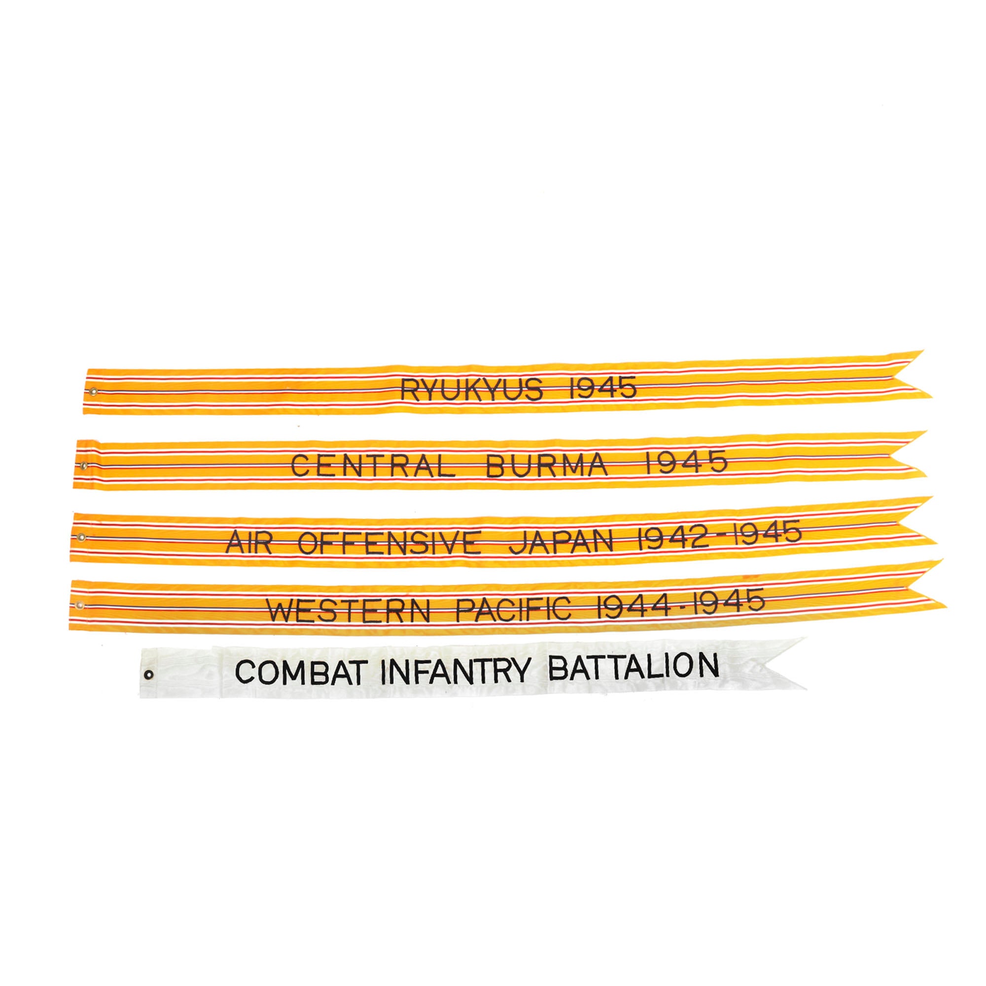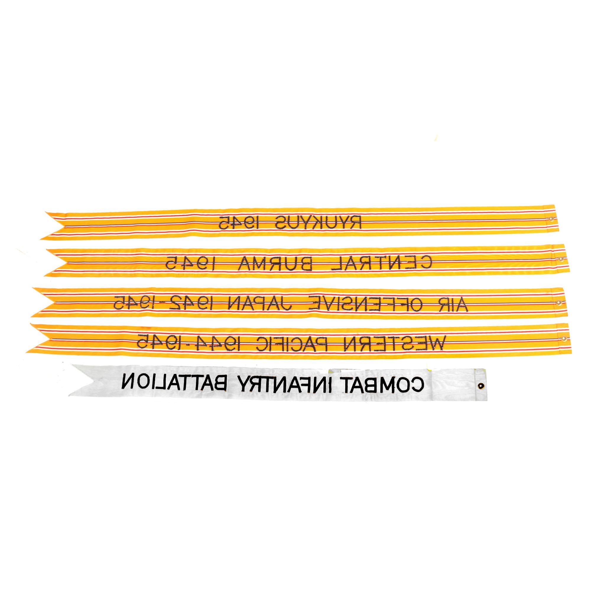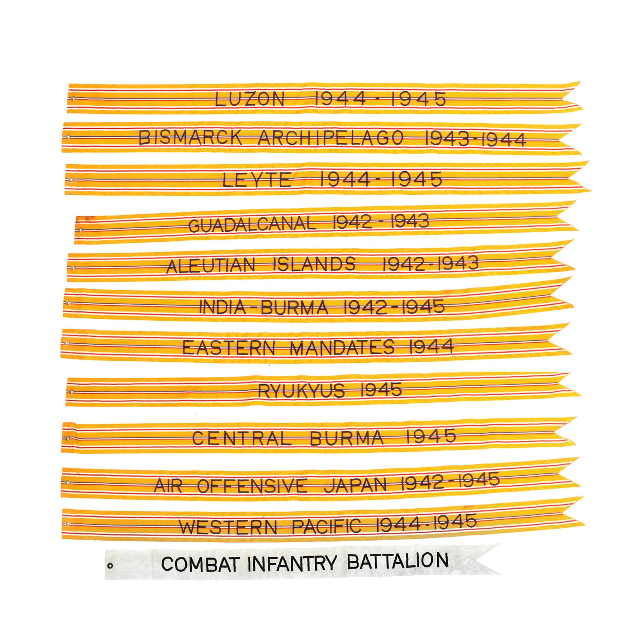 Original Items. Only One Lot Available. This is a tremendously scarce lot of WWII Era Battle streamers, 11 for Asiatic–Pacific Campaigns and one for a Combat Infantry Battalion. All streamers are in great shape with grommets that date them to the immediate post-war period.