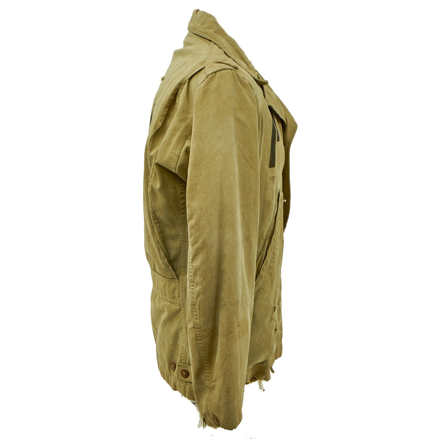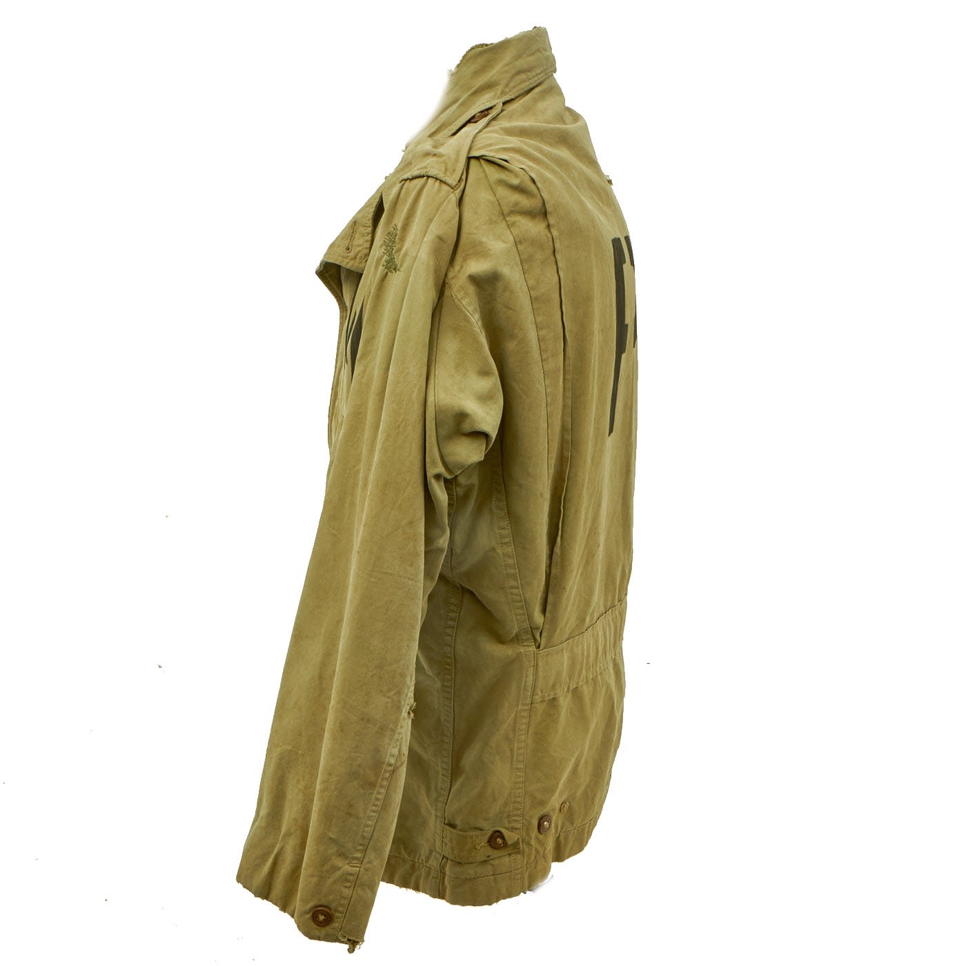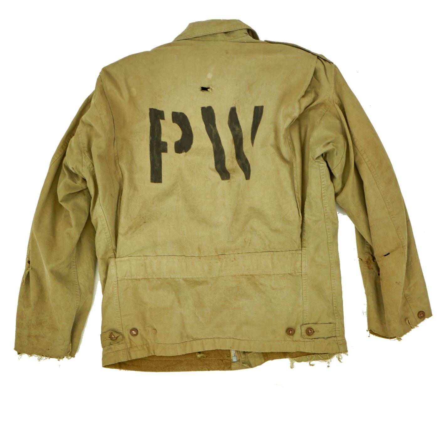 Original Item: One-of-a-Kind. WWII Military Issue Model 1941 Field Jacket, as issued to American troops during the war. This jacket was reissued to an Axis Prisoner of War, most likely on the American Homefront.