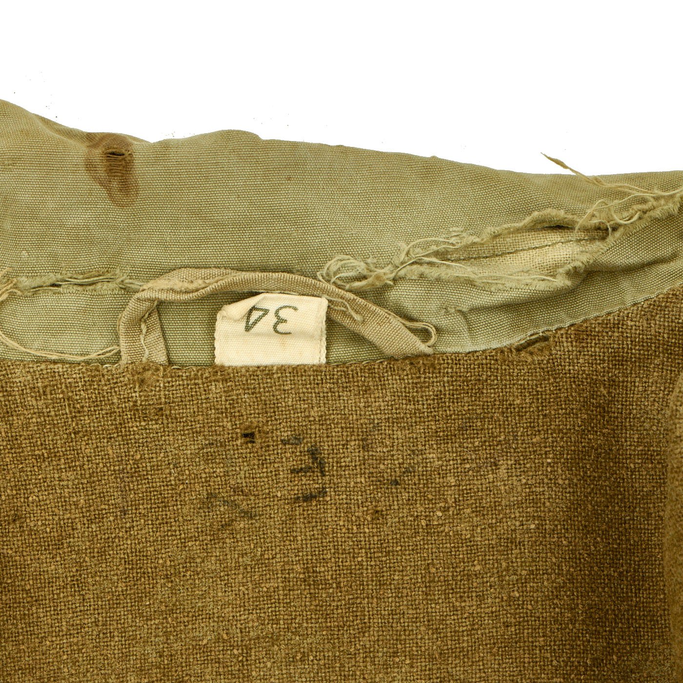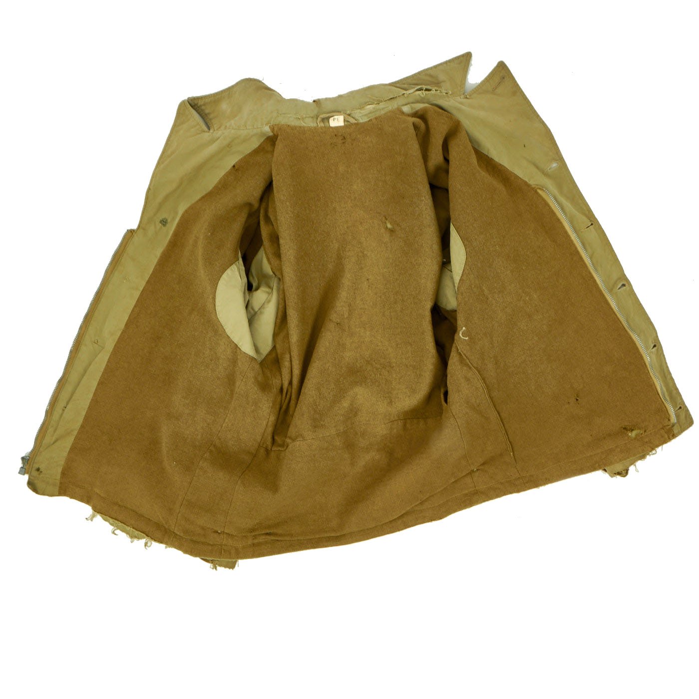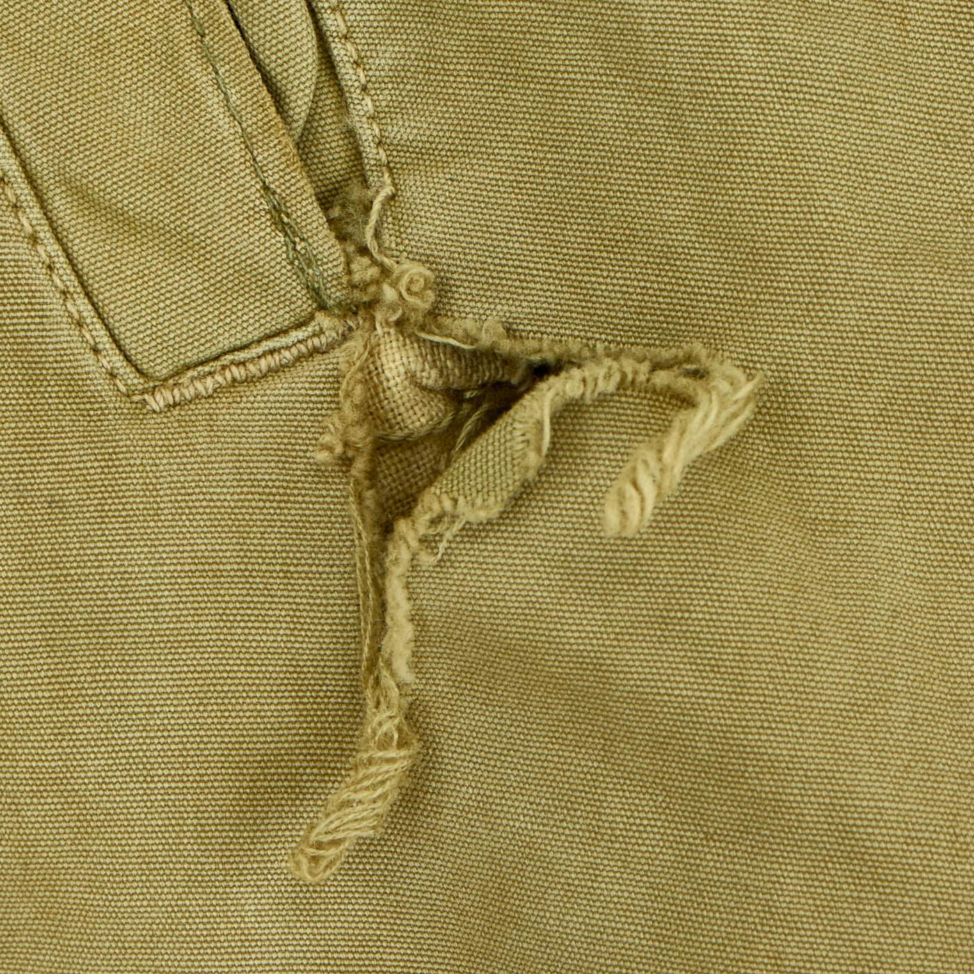 This particular garment is a GI issue M-1941 Field Jacket reissued to an Axis Prisoner of War. The Jacket exhibits heavy wear from heavy use and features a black-stenciled “PW” on both the front and back. Size is approximately a US 38. These are seldom found items today, as most were destroyed at the end of WWII following the release of the prisoners.