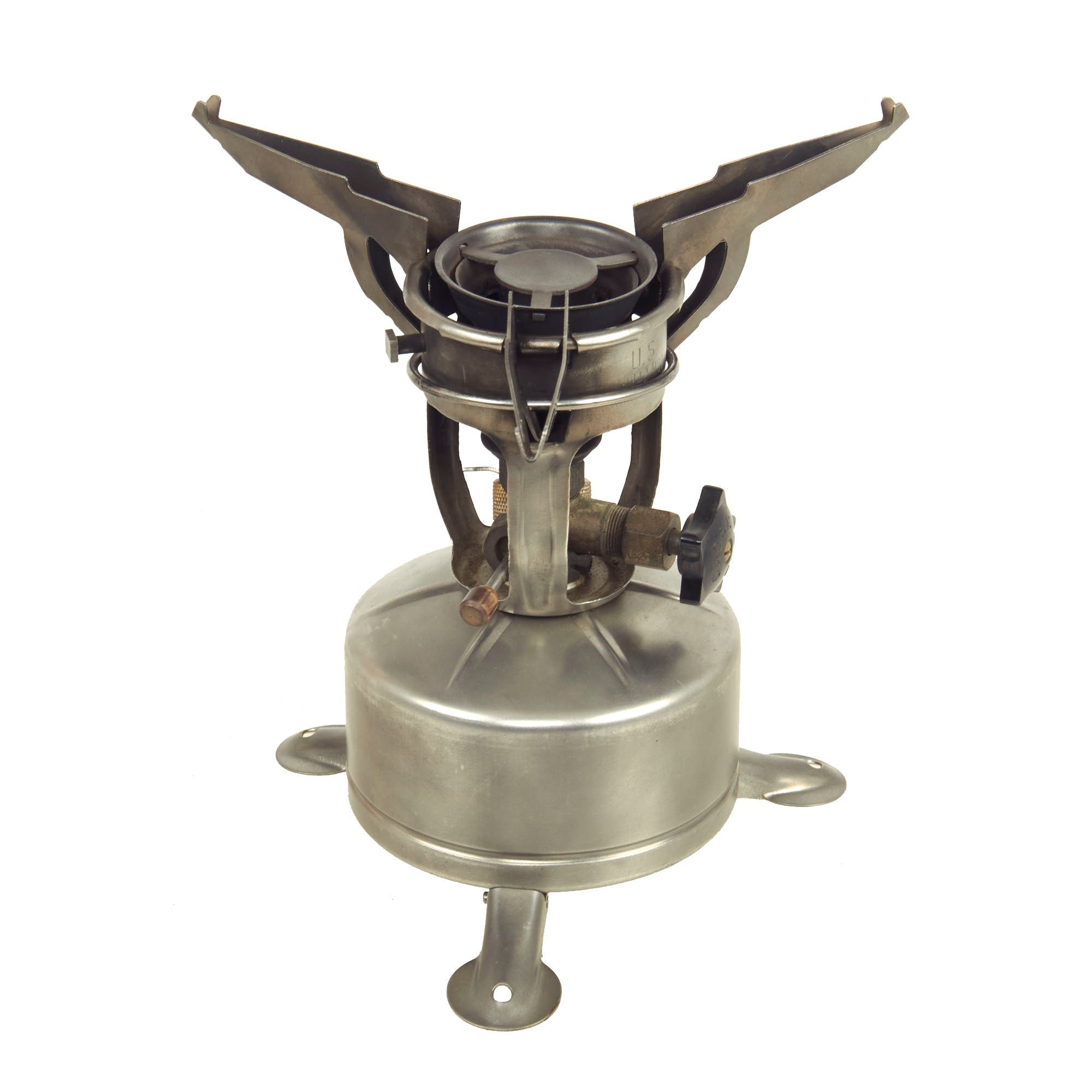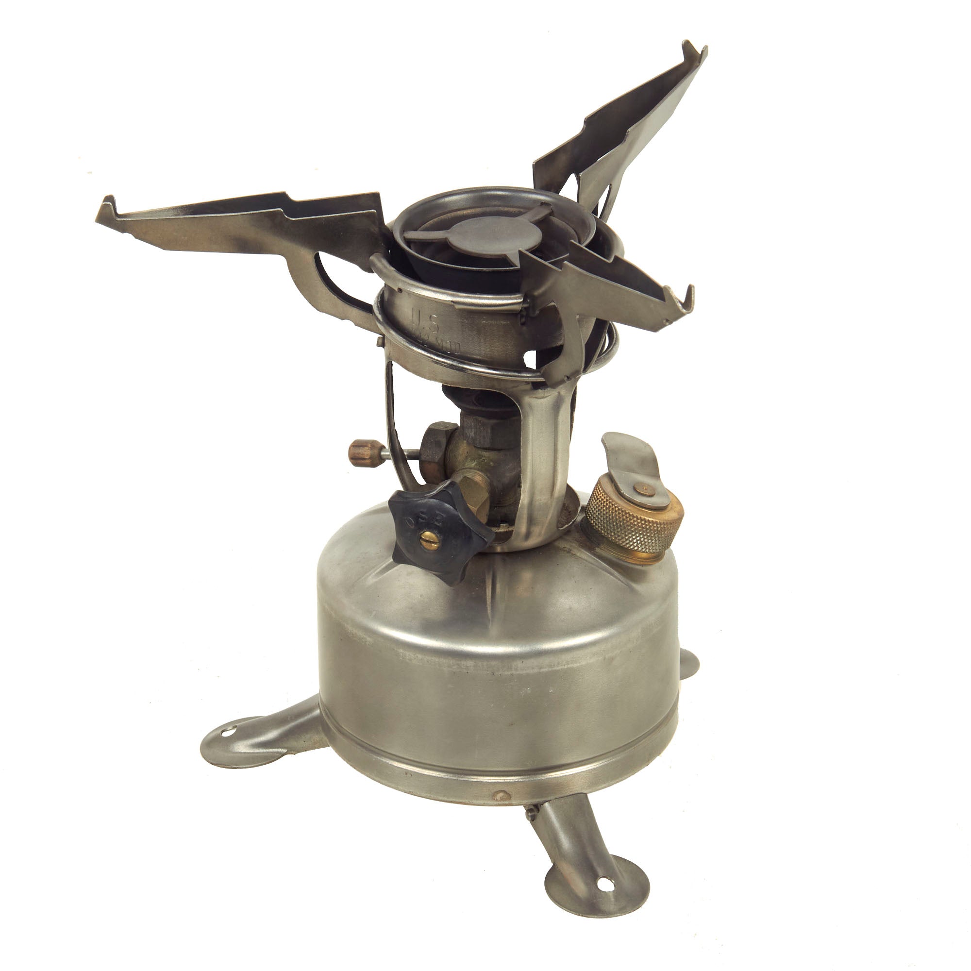 At the same time this was happening, several experienced mountaineers were brought in by the U.S. Quartermaster General to help improve clothing and equipment for the U.S. Army’s mountain divisions. One of these was Bestor Robinson, who received several patents for his design of a "compact" camp stove, usually called the "mountain stove", which was a bit shorter than the Coleman design. The original design resulted in the M-1942 "Wheel" stove, which had a large wheel at the bottom to control the fuel flow. This was supposed to be easy to use with gloved hands in the cold. However the design was changed soon after, resulting in the M-1942 MOD (modified), which had a traditional fuel control setup. These were manufactured by Aladdin, Prentiss Wabers, and Coleman during the war. Made of stainless steel and brass, they are extremely resilient to any type of weather conditions.