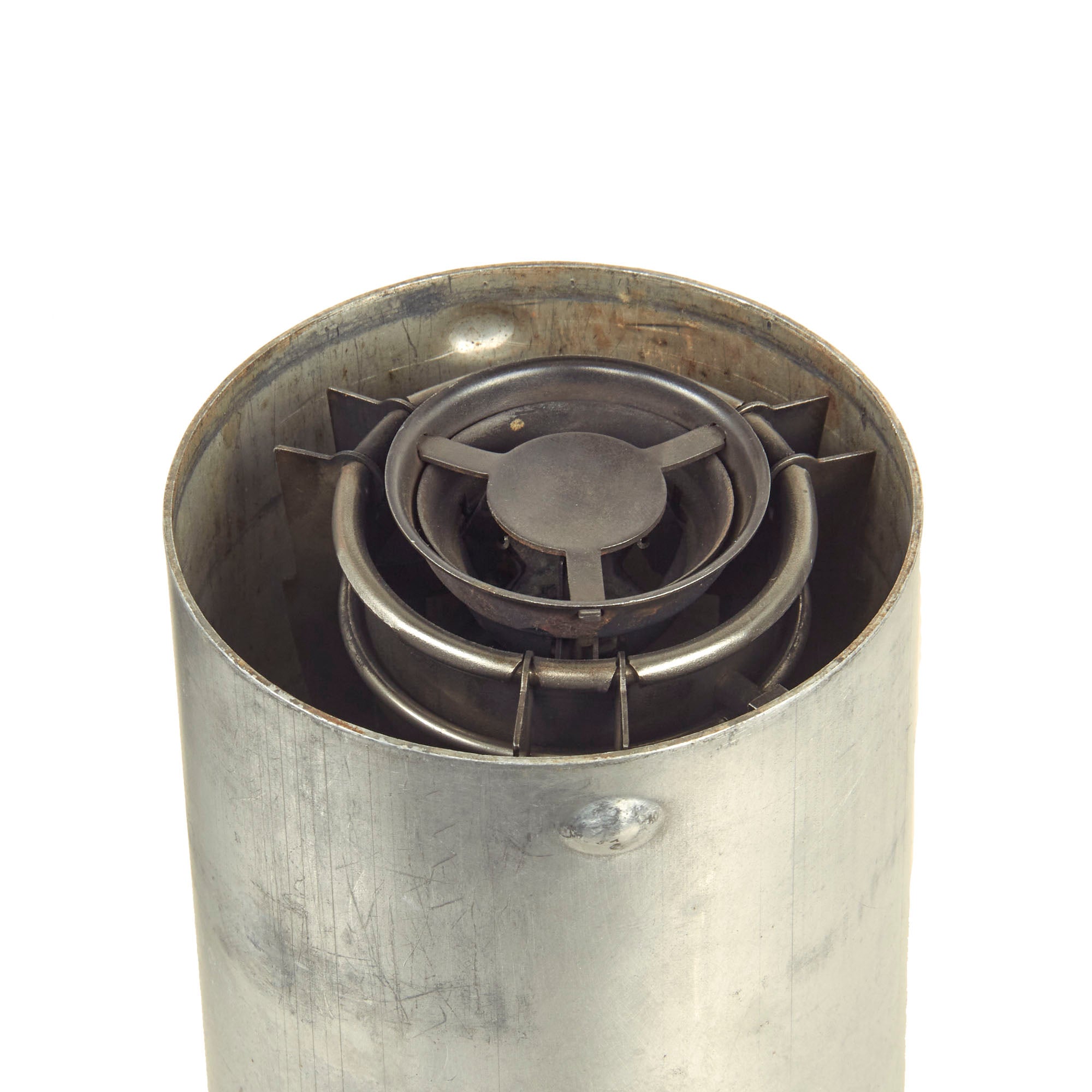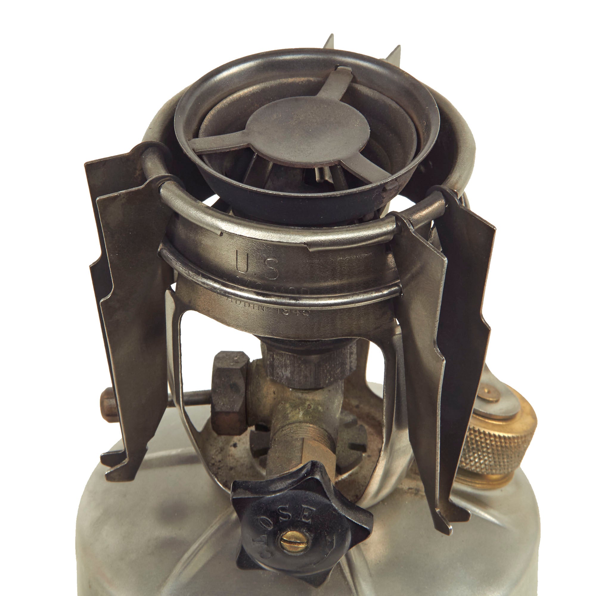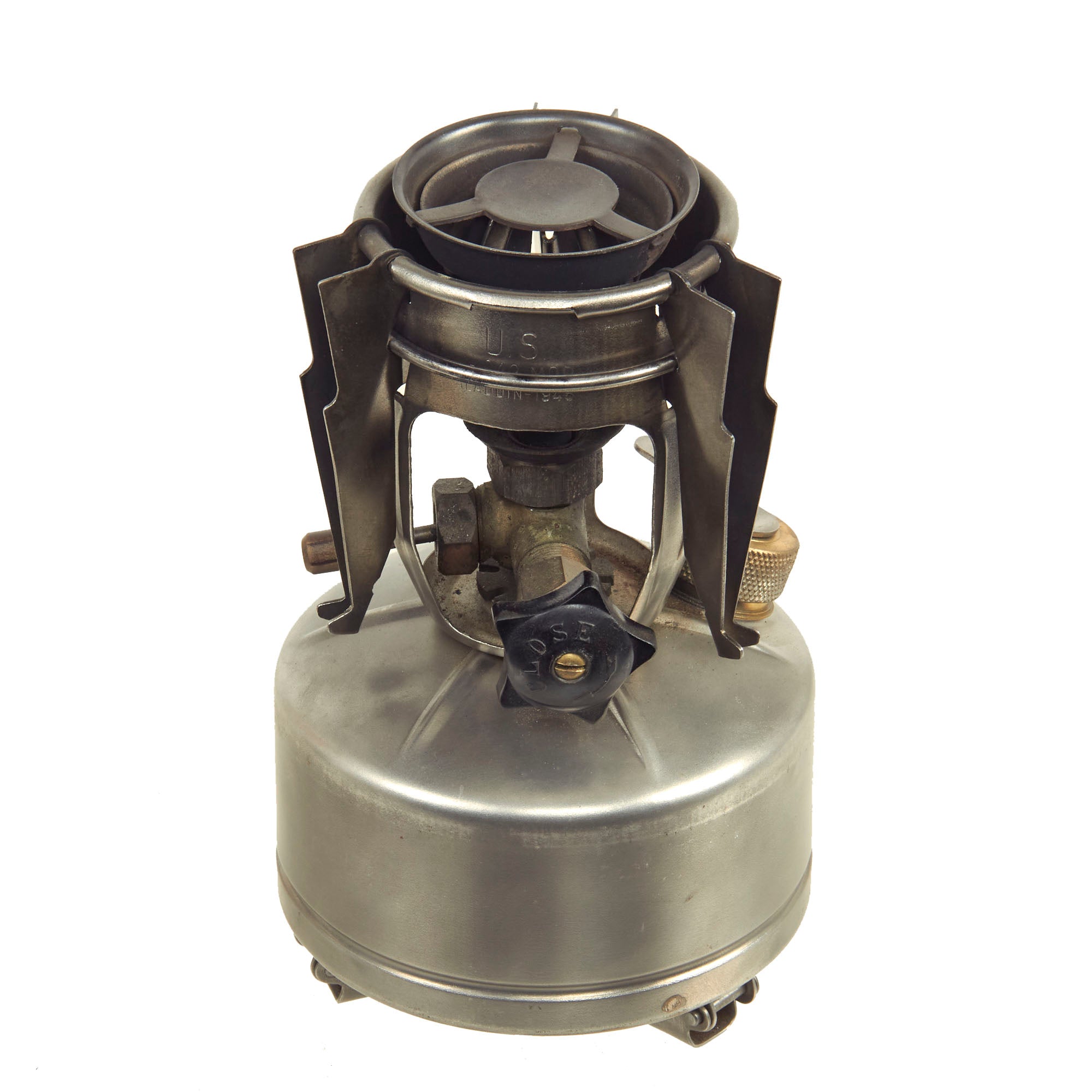 This is a very nice example of the M-1942 MOD, made by Aladdin, complete with the original aluminum bayonet "F" canister. Collapsed, it measures 6 1/2 inches tall, with a width of 3 3/4 inches. Like the M-1941, it is designed to run off gasoline, either leaded or more preferably white, which did not have any additives. The stoves had no need for the lubricating properties of leaded gas, and it was also safer for the soldiers. The stove features fold out feet on the bottom and fold out burner supports on the top to increase the stability.