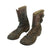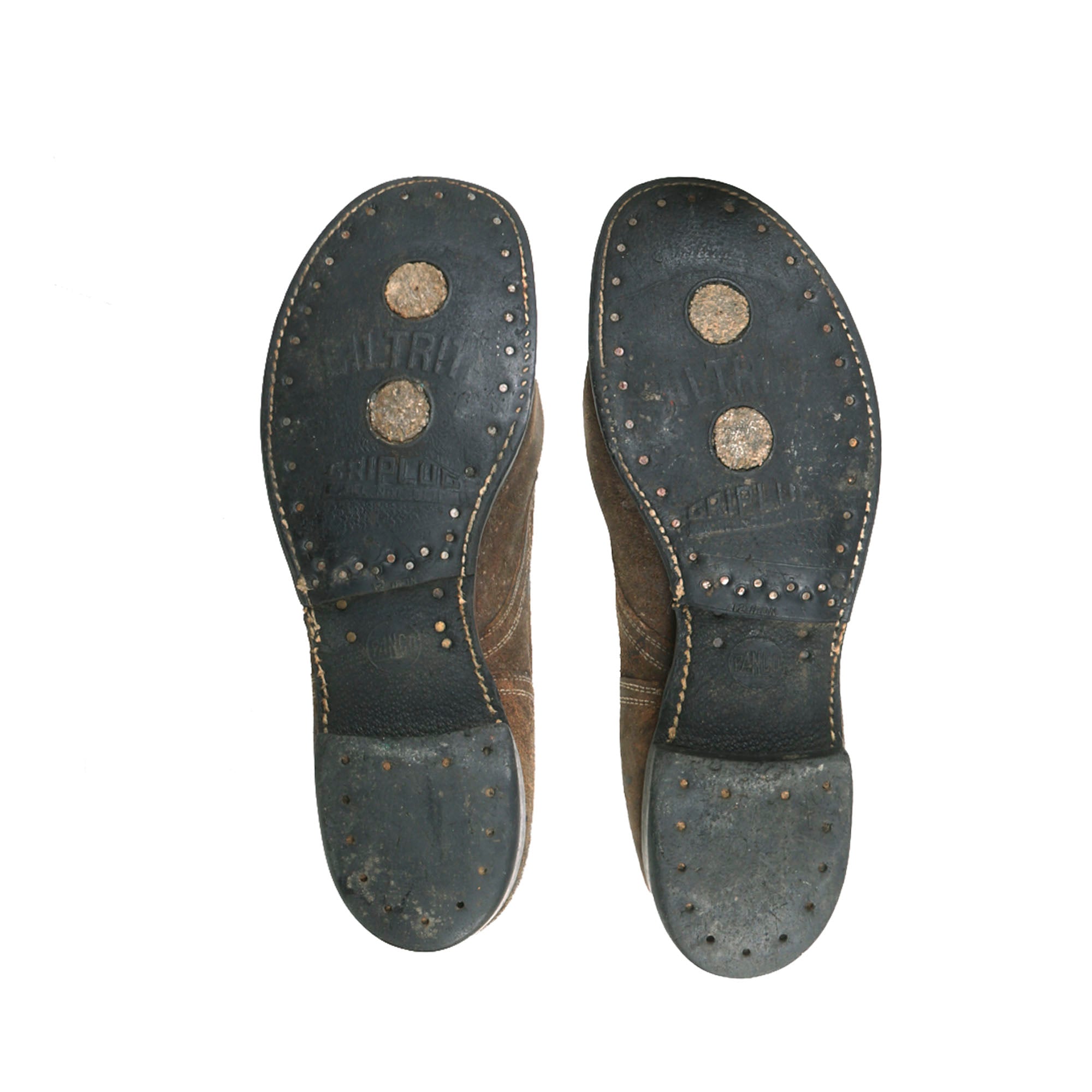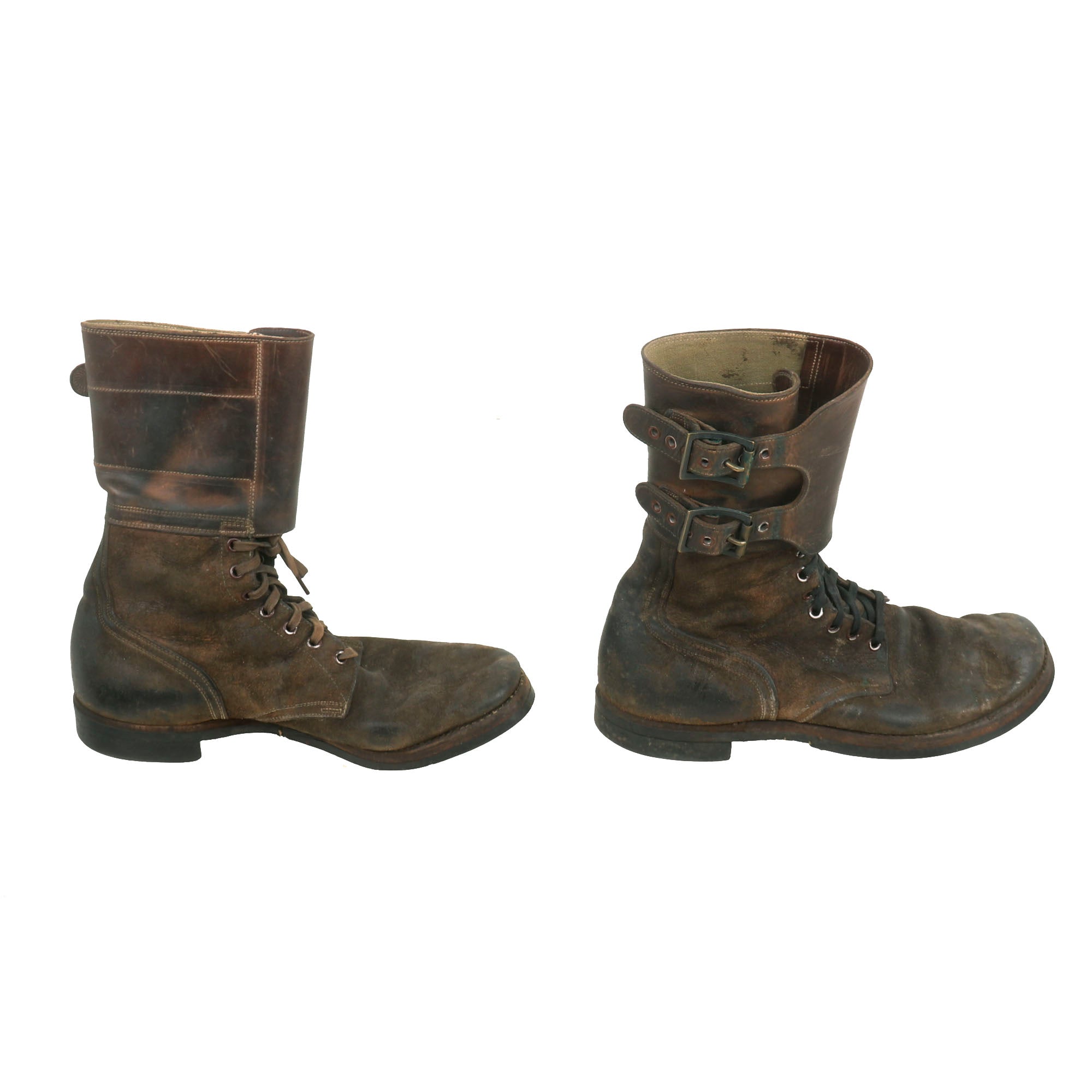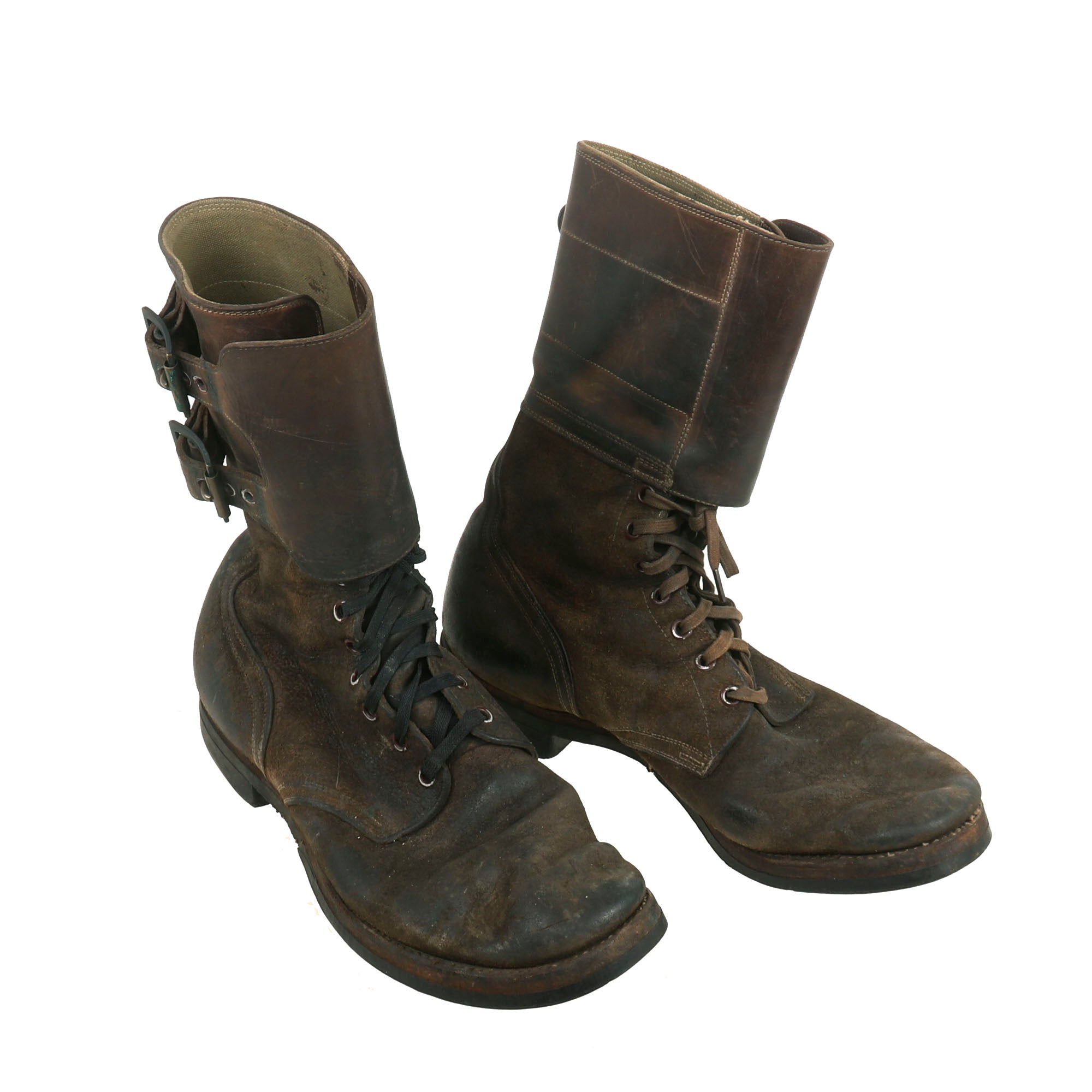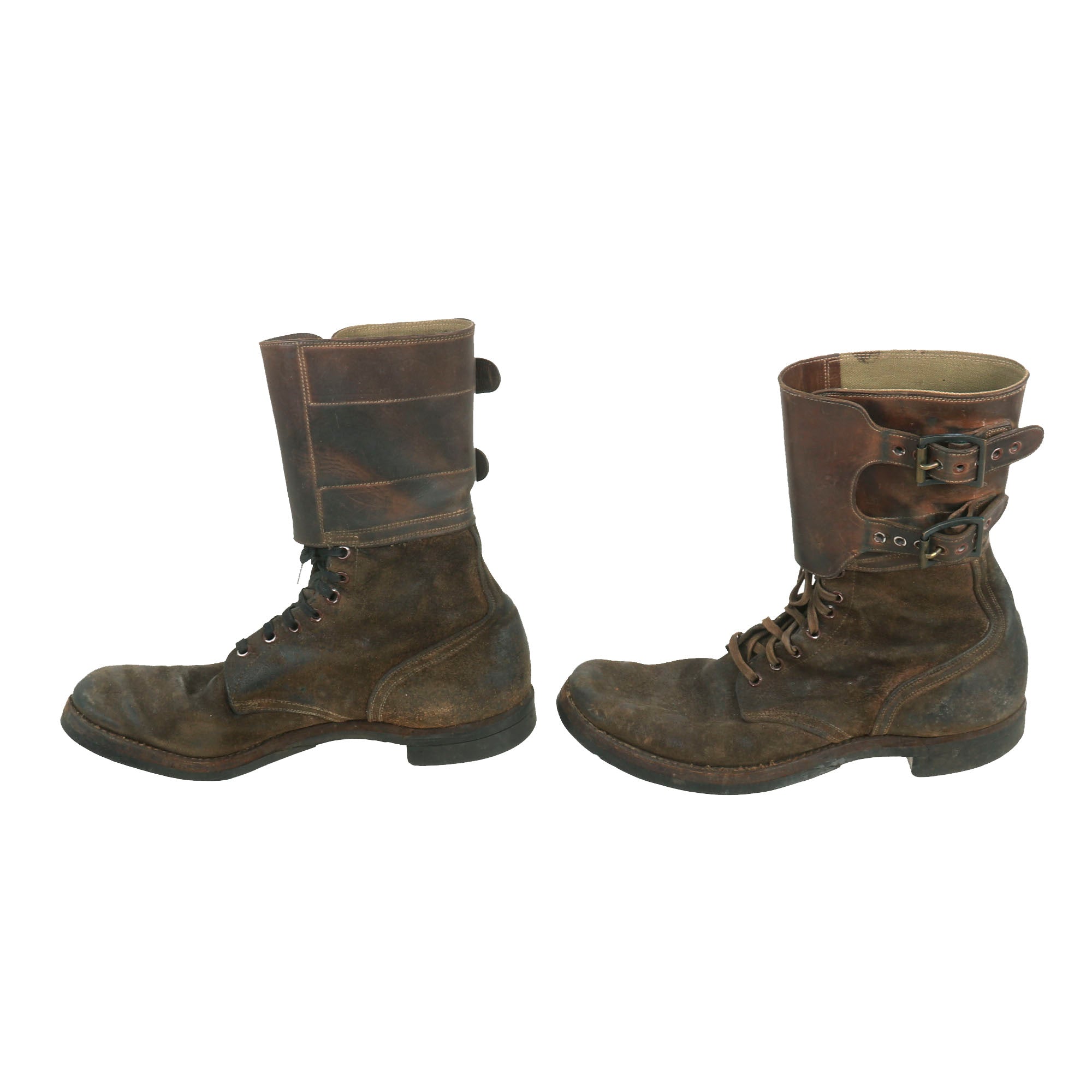 The composition sole combat service boot, or "double buckle boot" as it is commonly known, originated as part of a project to create a universal combat uniform. Revised footwear was included in this project that was hoped to provide improved performance in the field while at the same time reducing the number of items the Quartermaster had to supply. In fact, a major impetus to bring the combat boot to fruition was the result of the poor performance of existing footwear during the early stages of the North African campaign. Though early combat boot experimentation looked at new designs and special purposes, the end result was a universal issue boot that was formed by combining the latest service shoe development with a simple and economical double buckle cuff. Approved by the Army Service Forces in 1943, the boot was being mass produced during the latter stages of the war, and by late 1944/early 1945 was being issued in quantity to troops overseas. These boots were also seen being issued during the Korean War alongside the M48 service boots.