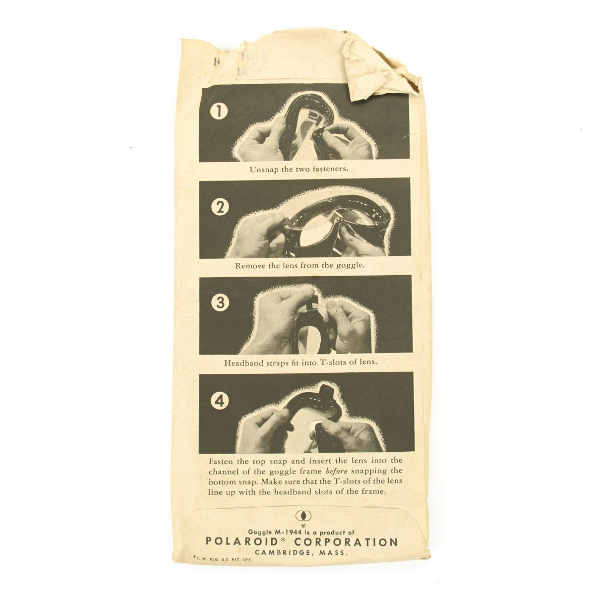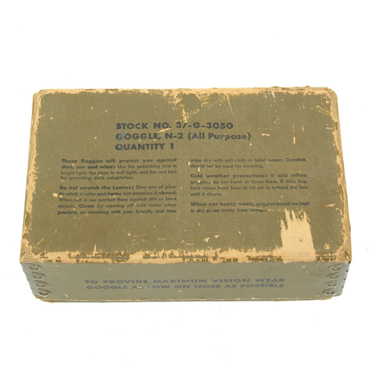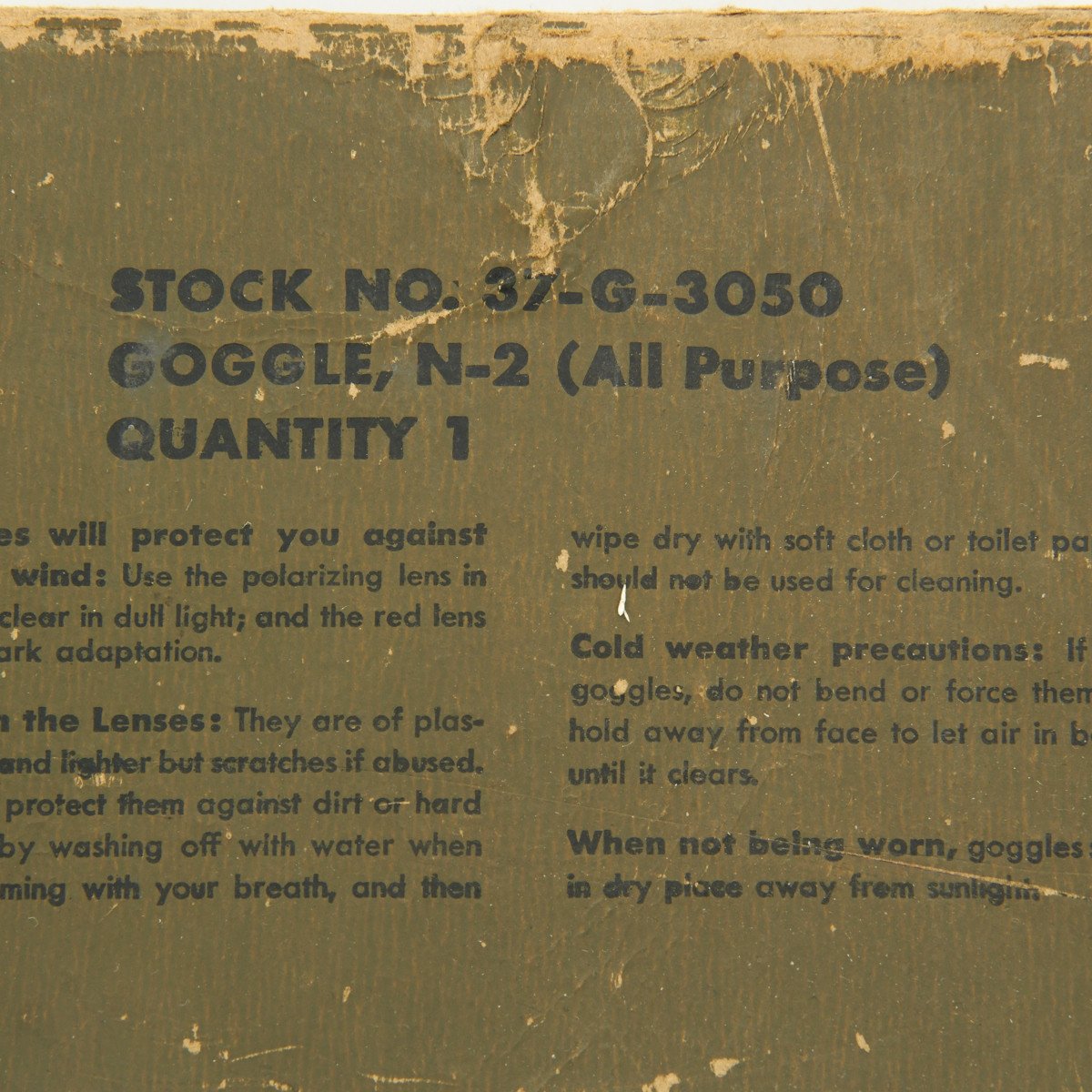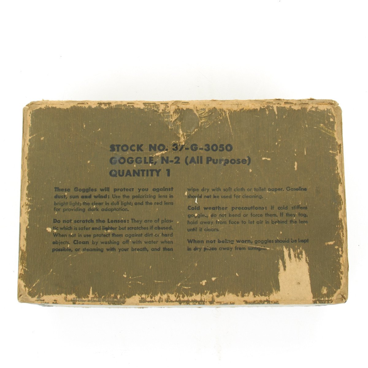 Original Item: Only One Available. Known as N-2 all purpose goggles or M-1944 with metal reinforced, cardboard box. Original M-1944 goggle sets were developed by Polaroid and delivered with three lenses (clear, polarizing, red) for dust, wind, night adaptation, as well as sun protection. "Goggle, M1944" is stamped into the one-piece rubber frame.