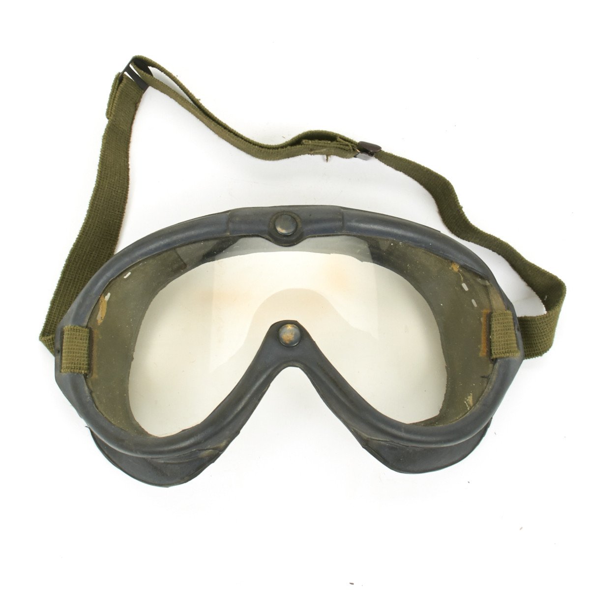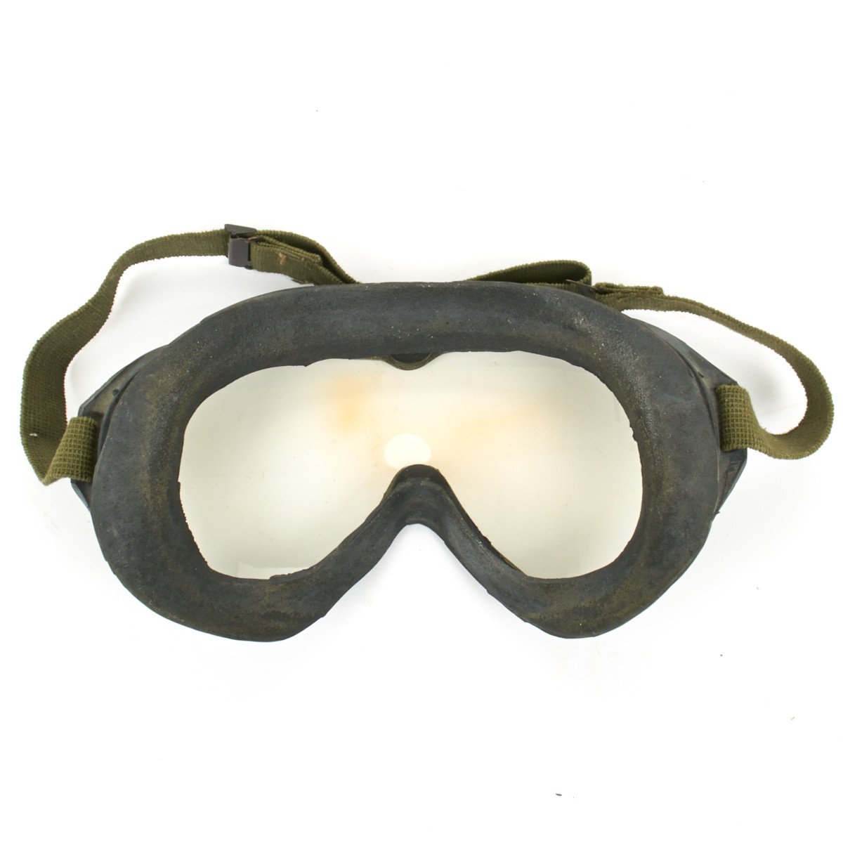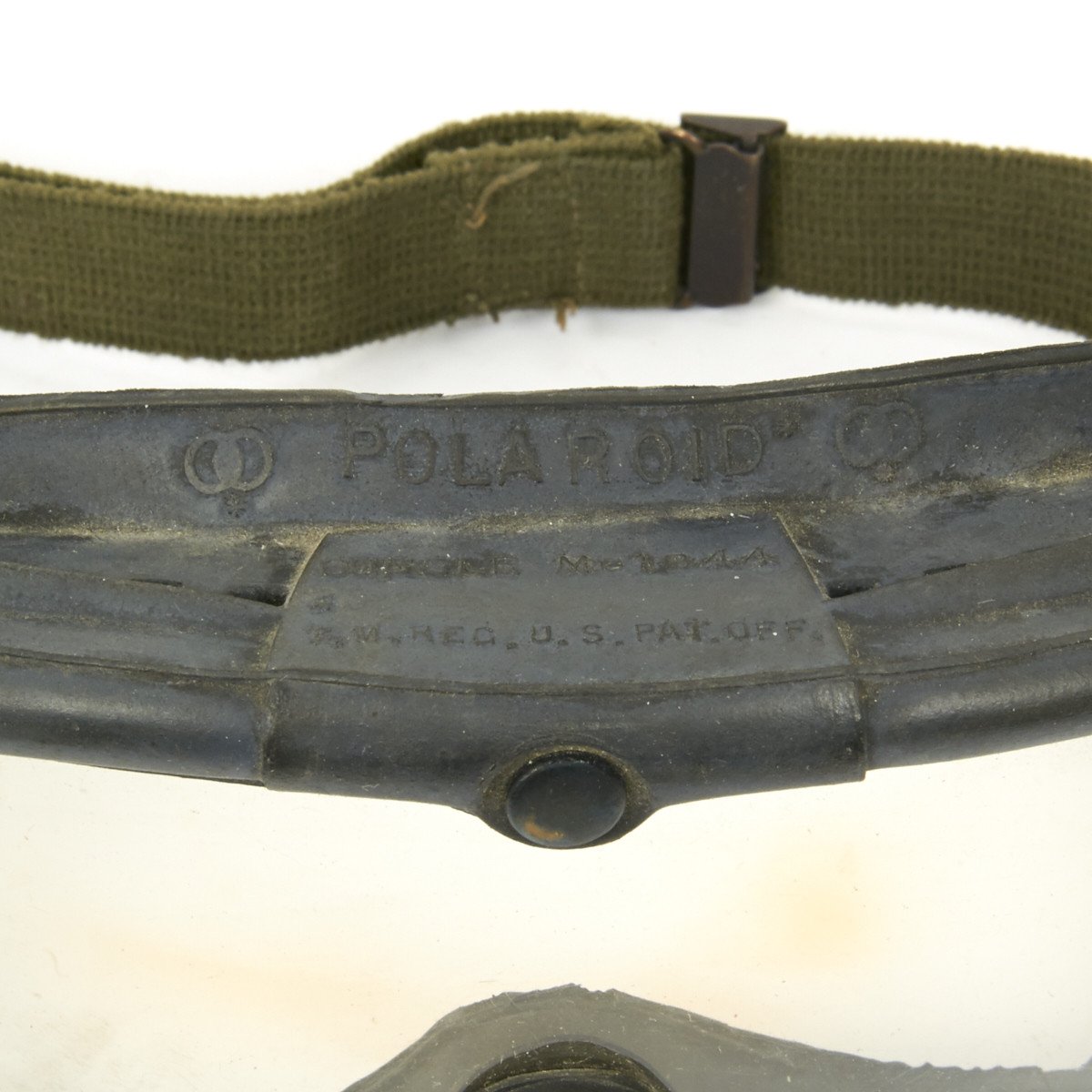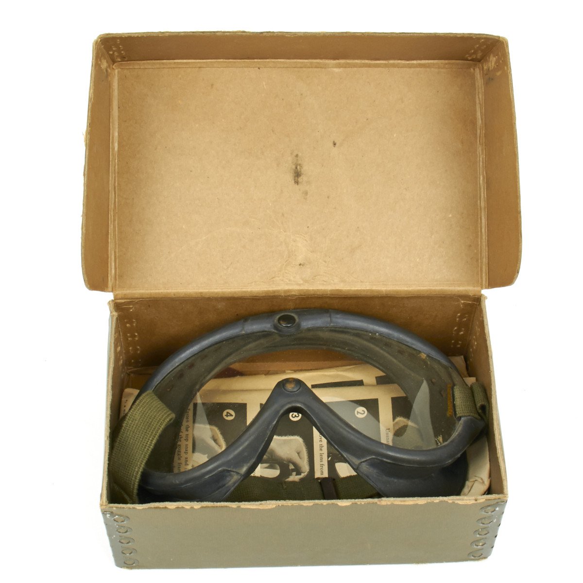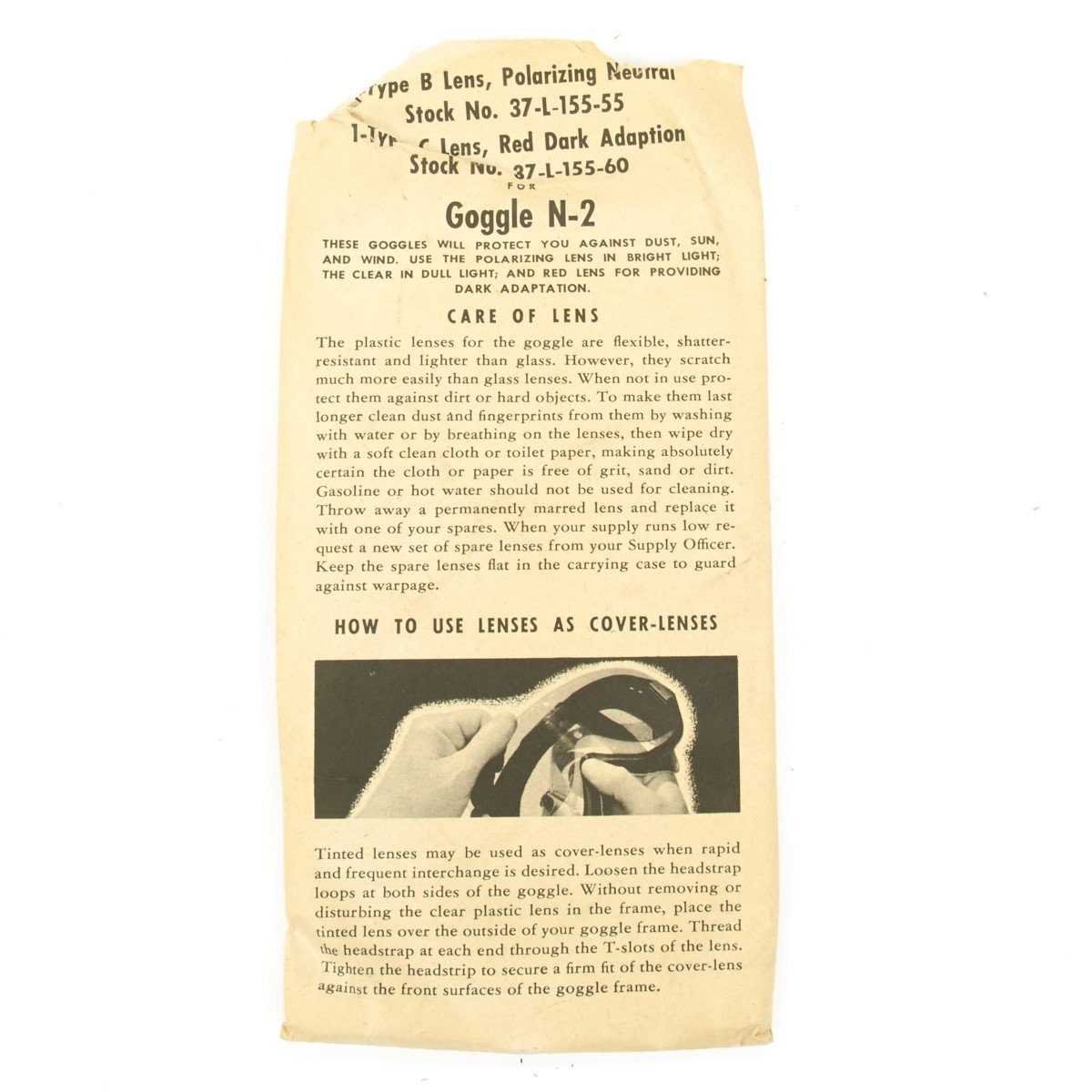 Original Item: Only One Available. Known as N-2 all purpose goggles or M-1944 with metal reinforced, cardboard box. Original M-1944 goggle sets were developed by Polaroid and delivered with three lenses (clear, polarizing, red) for dust, wind, night adaptation, as well as sun protection. "Goggle, M1944" is stamped into the one-piece rubber frame.