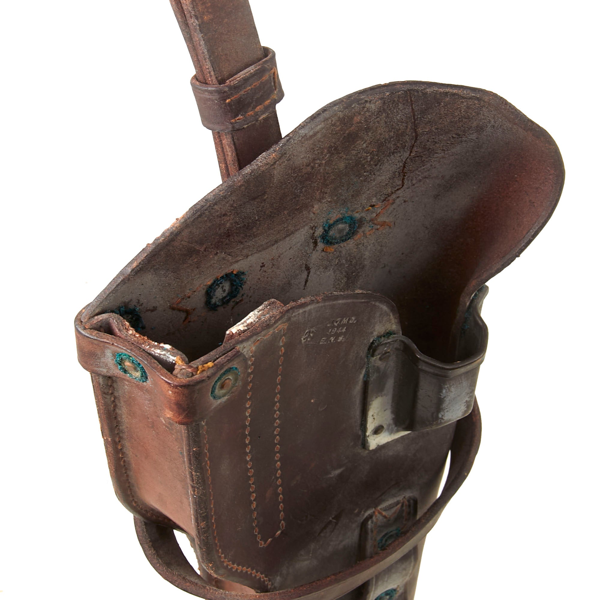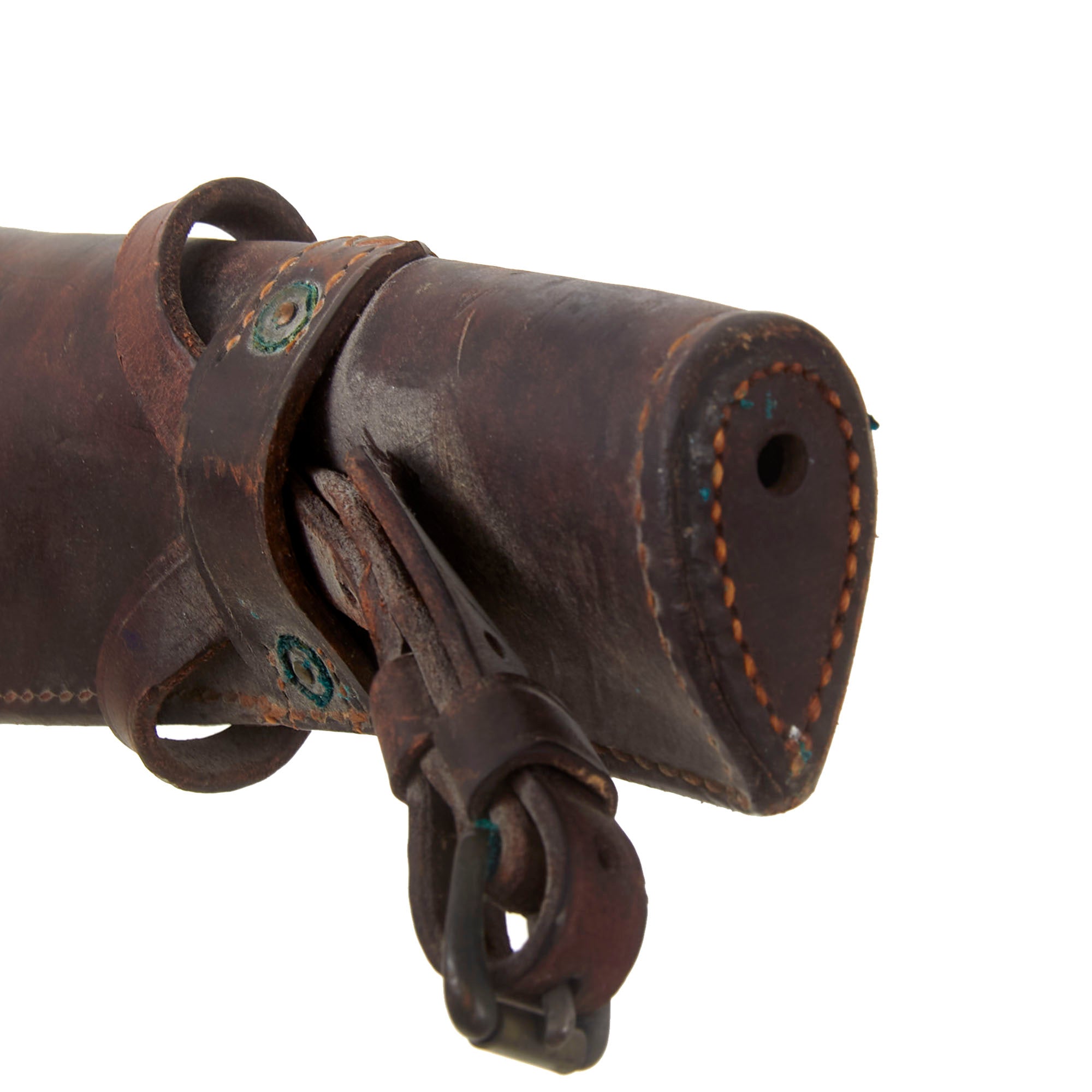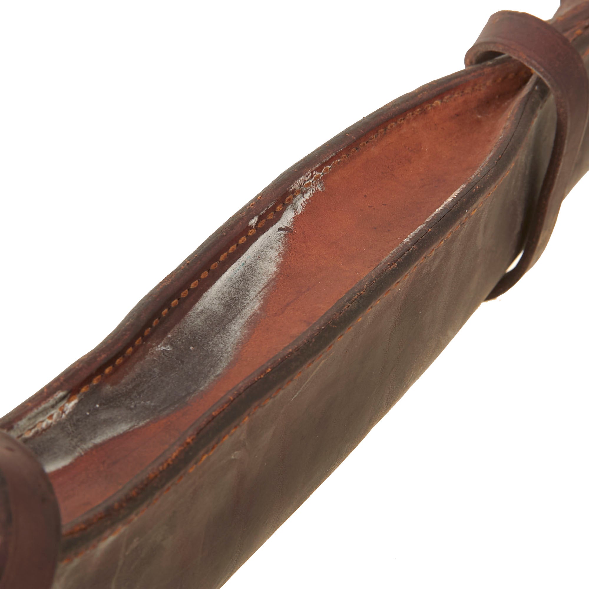 Original Item: Only One Available. This is a fair example of the rare WWII Vehicle Scabbard for the U.S. M1 Carbine that is in a wonderful state of preservation. The scabbard shows signs of being honestly used, the leather is still light tan throughout and the deep black finish is mostly worn on all metal parts. This example shows some expected wear to the exterior of the leather, as expected after decades in storage, but the leather has become rather stiff from dry rot. It still has the top original securing strap intact and unbroken, with a functional snap hook though very rusty. Solid markings are present on the back to the right of the U.S. marking: