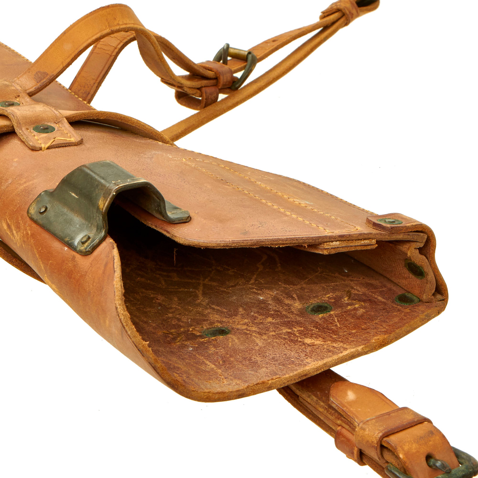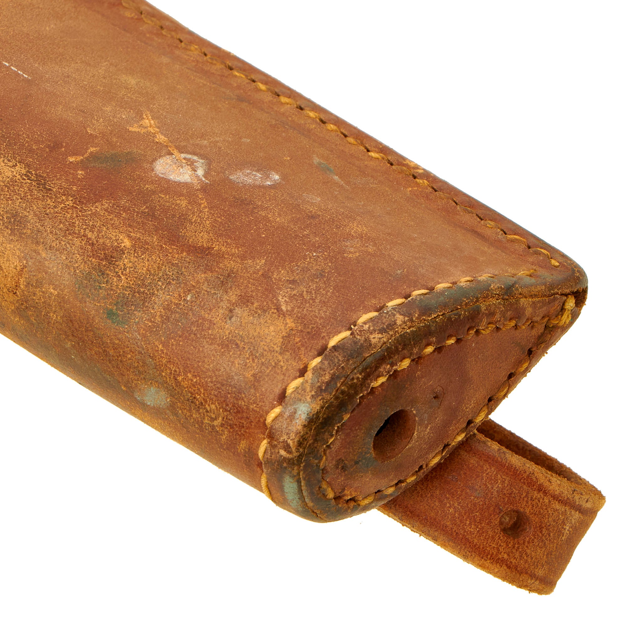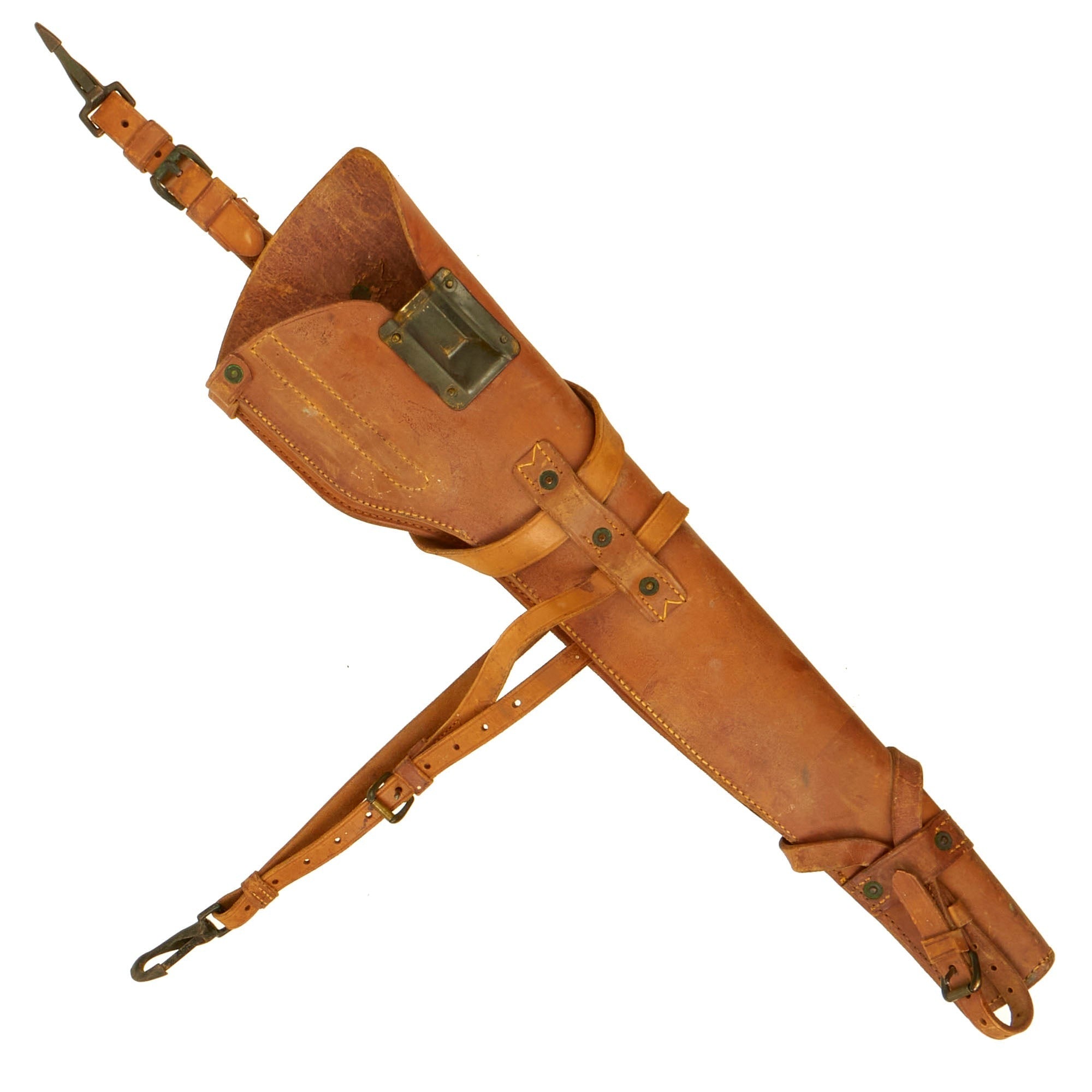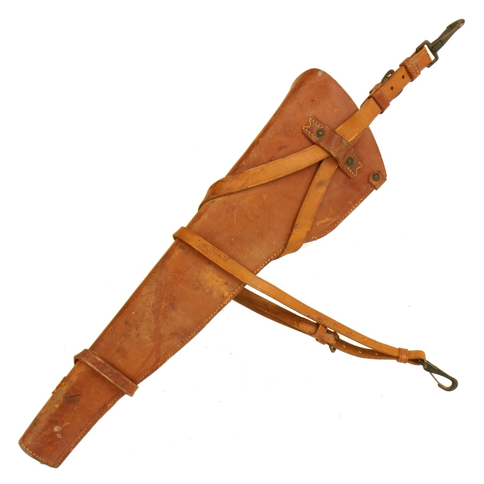 Original Item: Only One Available. This is a nice example of the rare WWII Vehicle Scabbard for the U.S. M1 Carbine that is in a remarkable state of preservation. The scabbard shows signs of being honestly used, the leather is still light tan throughout and the deep black finish is still mostly worn on all metal parts. This example shows some expected light wear to the exterior of the leather, as expected after decades in storage, The original securing straps are still intact and unbroken, and are complete with the original snap hooks. Very faint markings are present on the back and the date 1944 can still be somewhat seen.