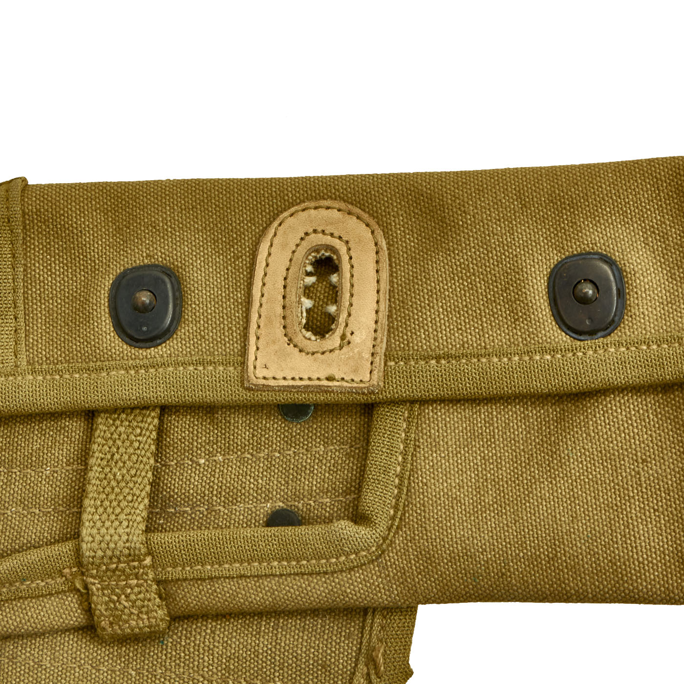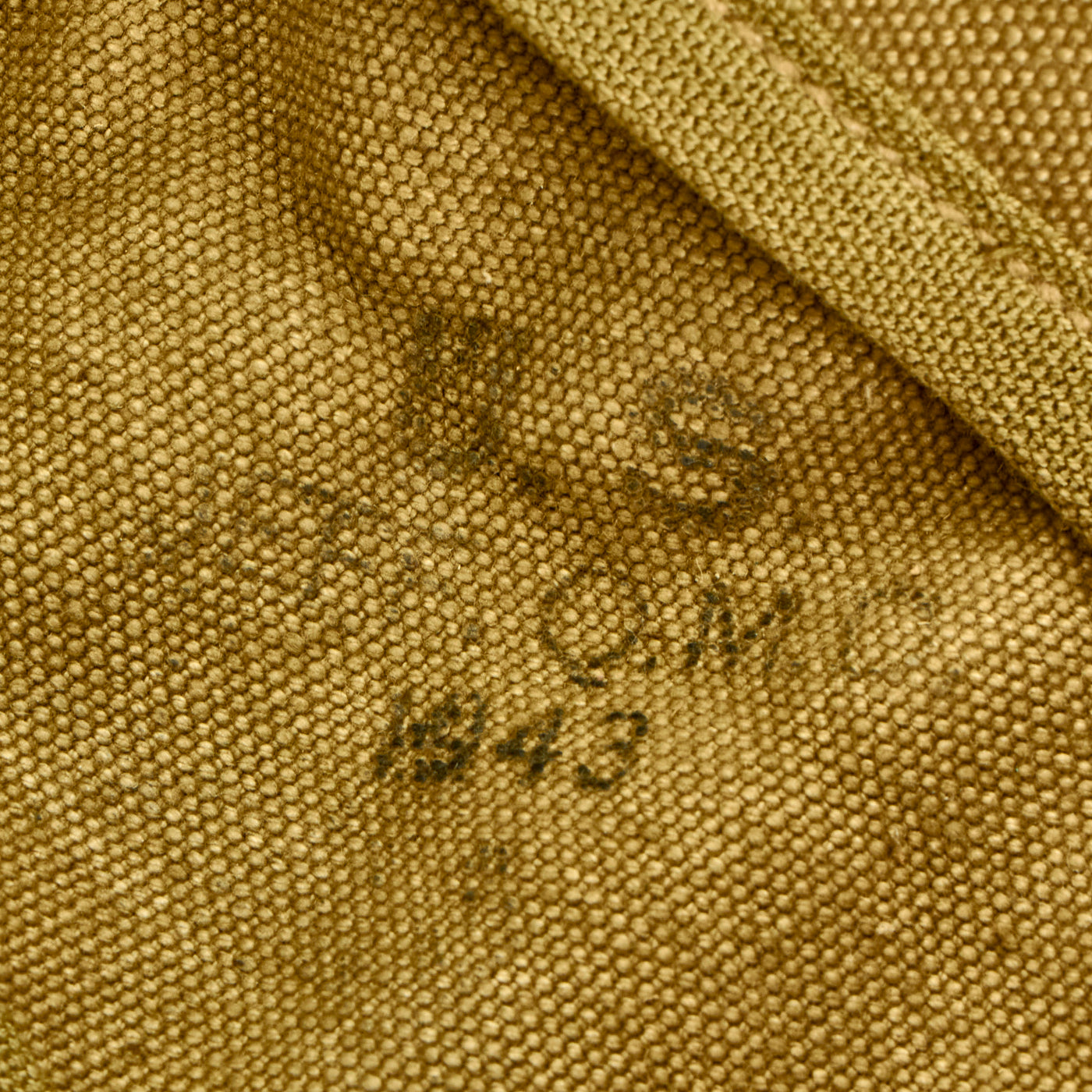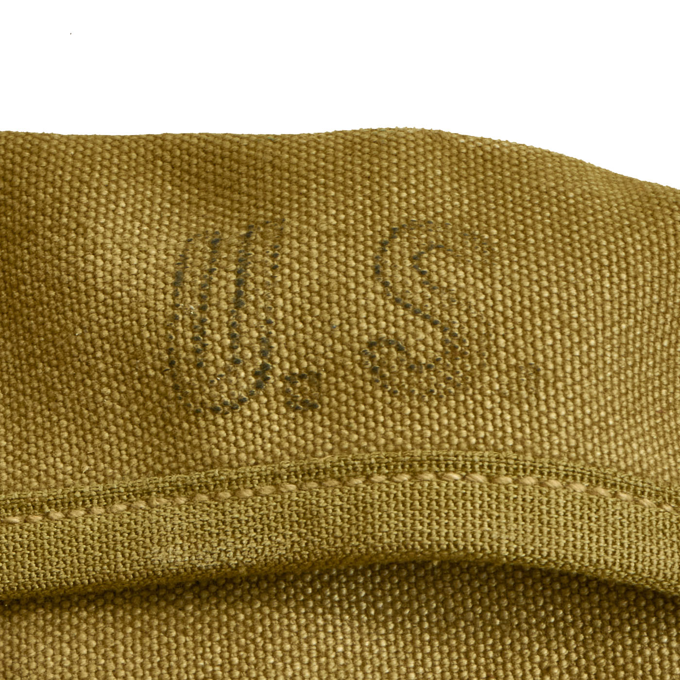 This example is unissued, made of OD Green #3 canvas, with OD #7 trim. It is maker marked and dated US. JEFF. QMC. / 1943, which is the same marking found on most original examples. This is definitely an ORIGINAL, not a reproduction, most of which bear the same marking. The snaps and rivets are all the correct blacked brass, with some oxidation on the hardware, typical of long storage, and there are some light stains as well. The canvas is also quite thick, far more sturdy than most reproductions.