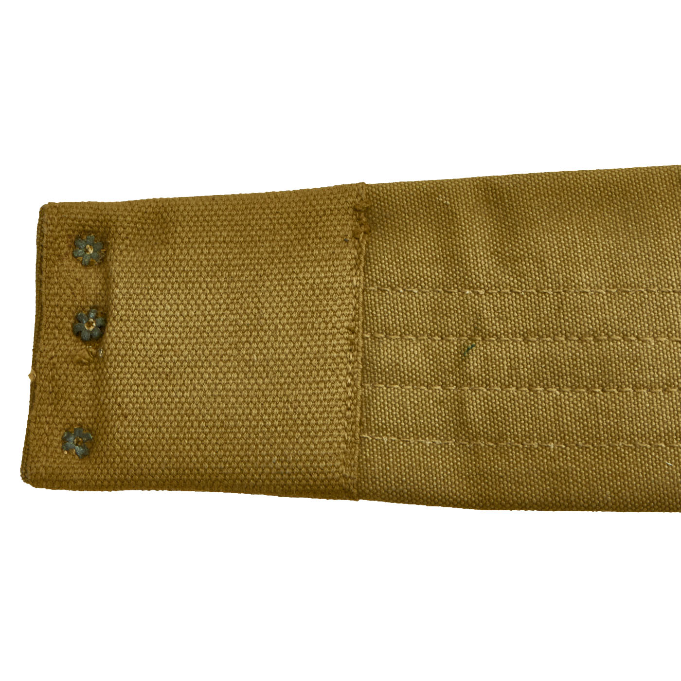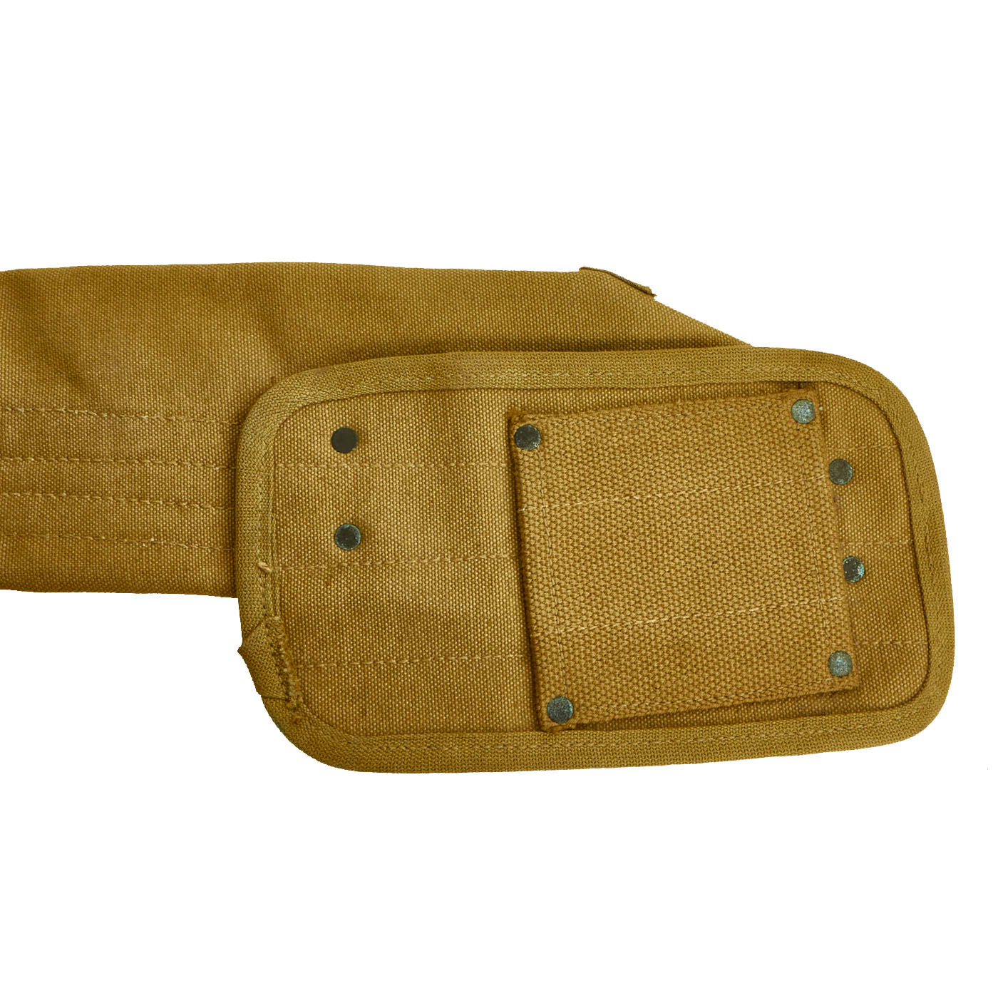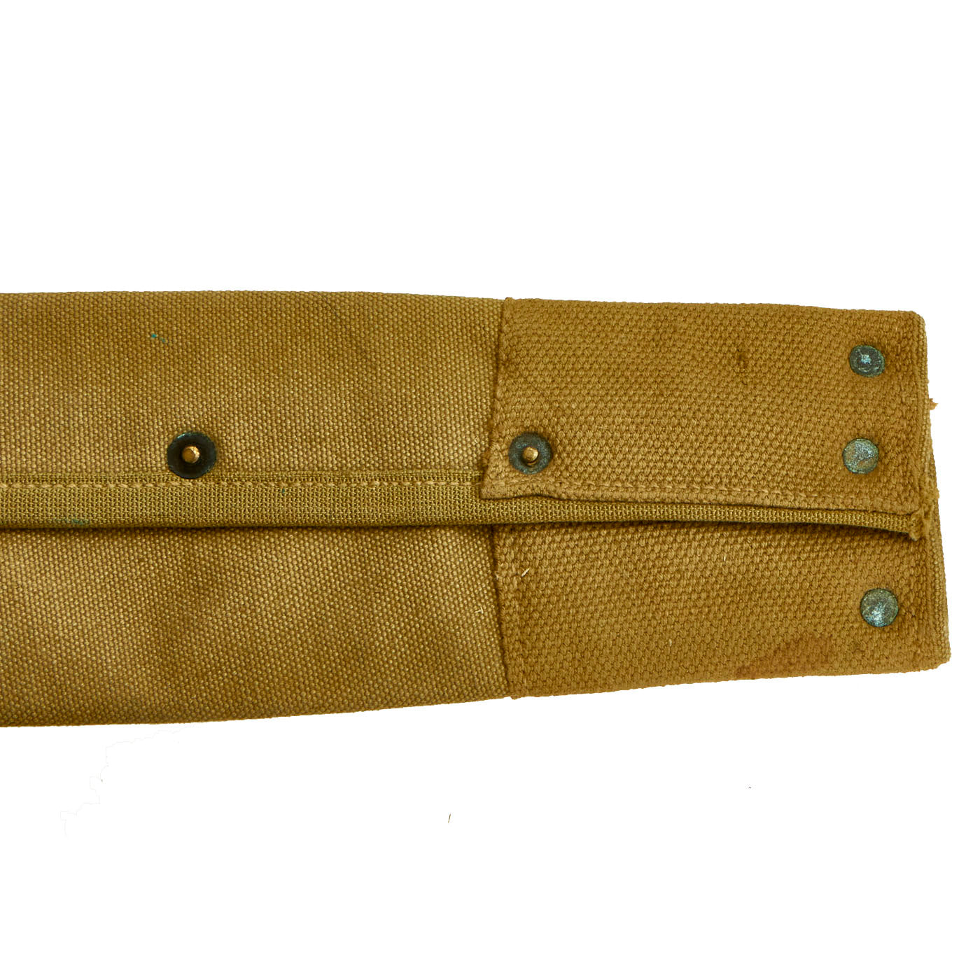 This example is unissued, made of OD Green #3 canvas, with OD #7 trim. It is maker marked and dated US. JEFF. QMC. / 1943, which is the same marking found on most original examples. This is definitely an ORIGINAL, not a reproduction, most of which bear the same marking. The snaps and rivets are all the correct blacked brass, with some oxidation on the hardware, typical of long storage, and there are some light stains as well. The canvas is also quite thick, far more sturdy than most reproductions.