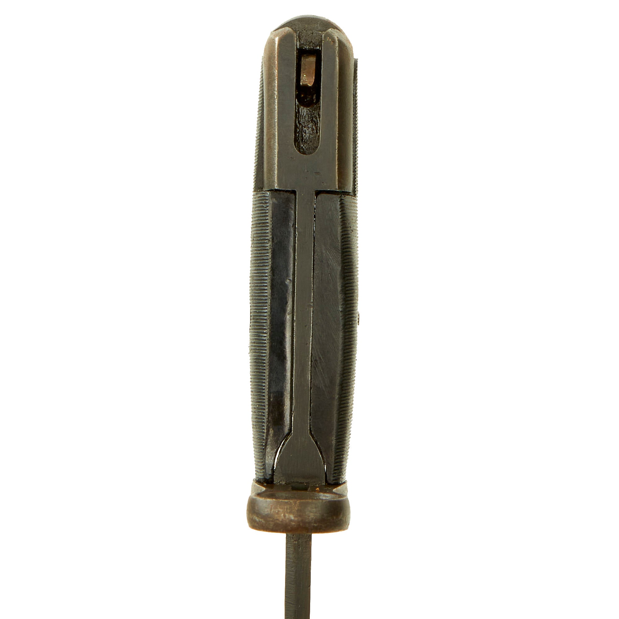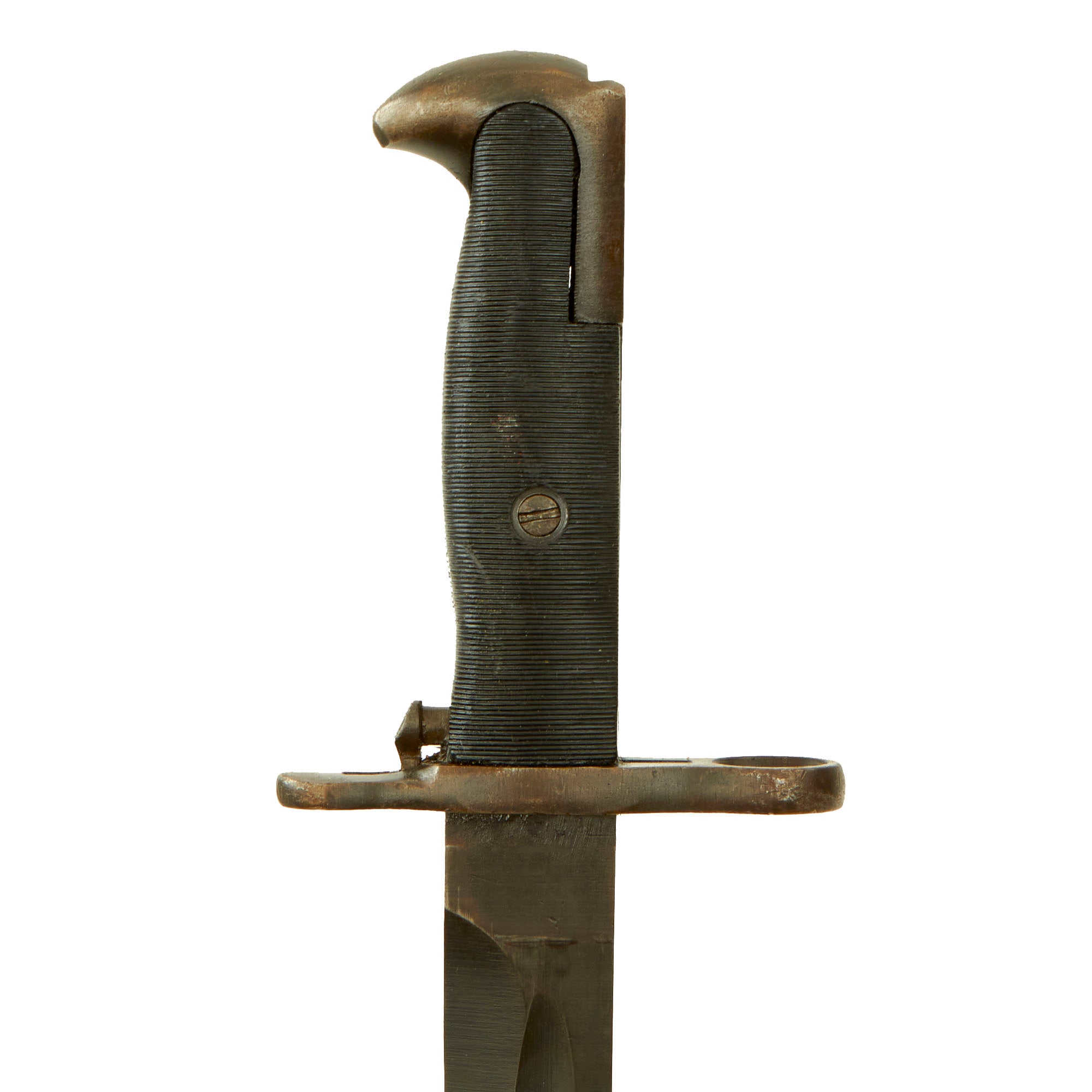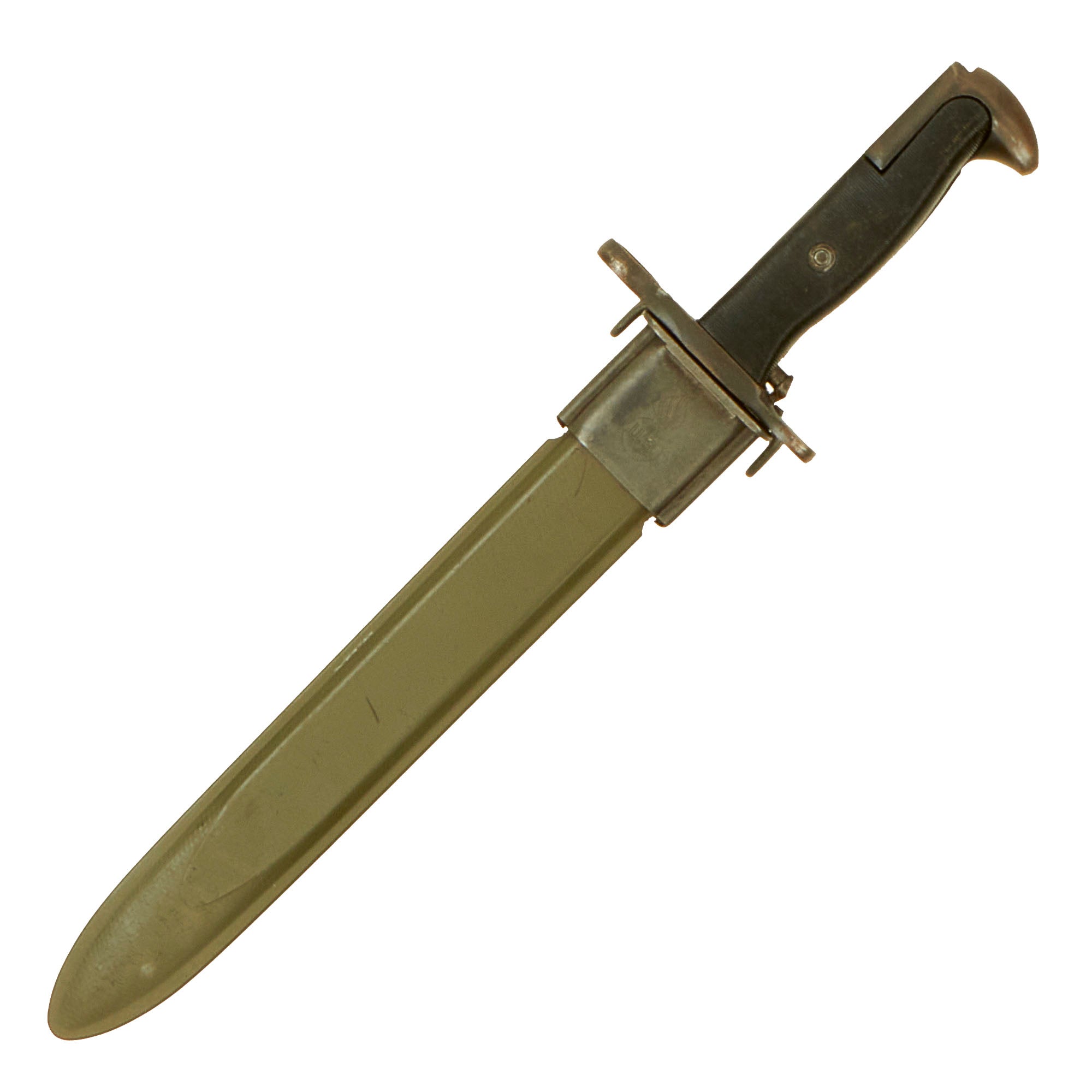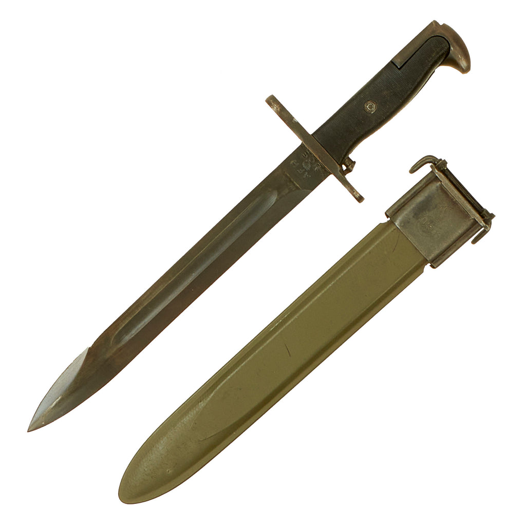 Original Item: Only One Available. This is a very nice condition M1905/1942 U.S. bayonet with a 10 inch cut-down blade for the M1 Garand Rifle, complete with the correct WWII Issue M7 scabbard. In 1943, the U.S. Army made the decision to shorten the M1905 bayonet's blade to 10 inches (25.4 cm) and as many of the M1905 and M1942 bayonets as possible were recalled, their blades were cut down to size, and were reissued. These shortened M1905 bayonets were re-designated as M1905E1.
