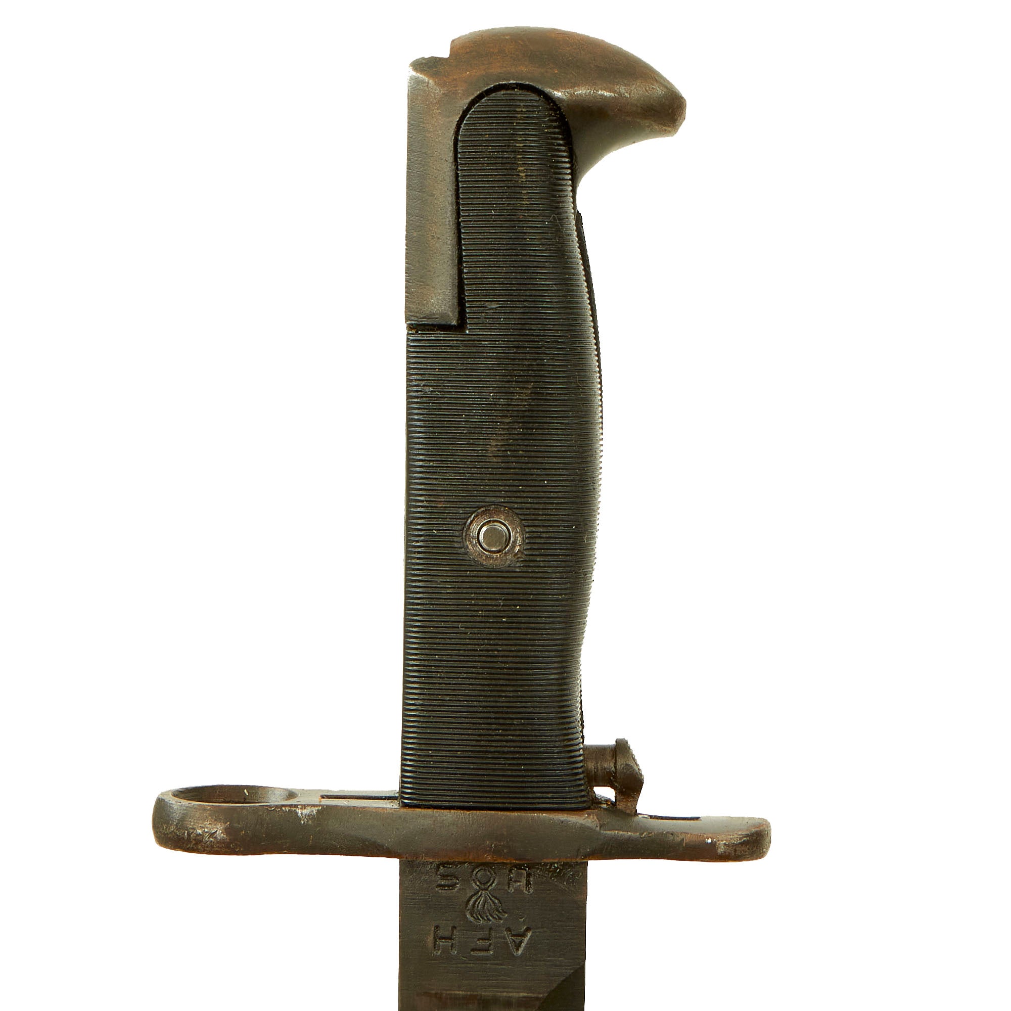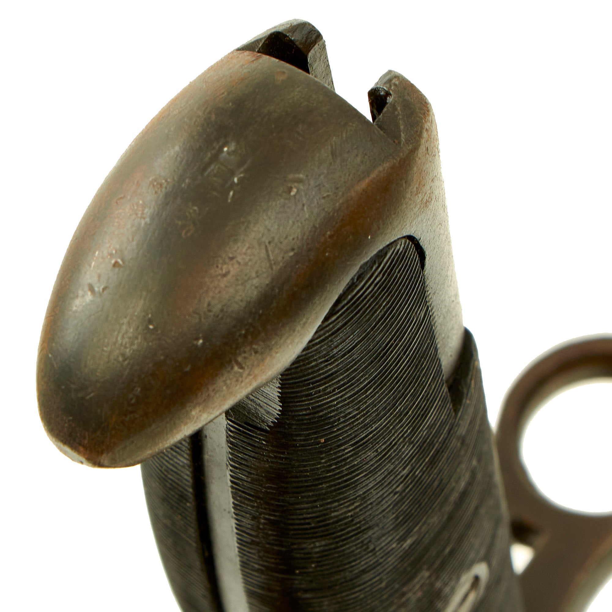 This example is in very good shape, but does show wear from use and cleaning. The blade ricasso is marked with maker A. F. H. (American Fork & Hoe of Geneva, Ohio) above U.S. around the Ordnance flaming bomb. Below this is the manufacture date but as per the pattern of AFH, it is not visible due to the crossguard. The original parkerized finish on the blade is partly worn away, showing use and wear after being cut down. The tip area has the mostly worn finish, while the ricasso has almost full finish, and the hilt has a good amount of finish as well. The original plastic grips are present and in good condition, showing light scratches and scrapes from service.