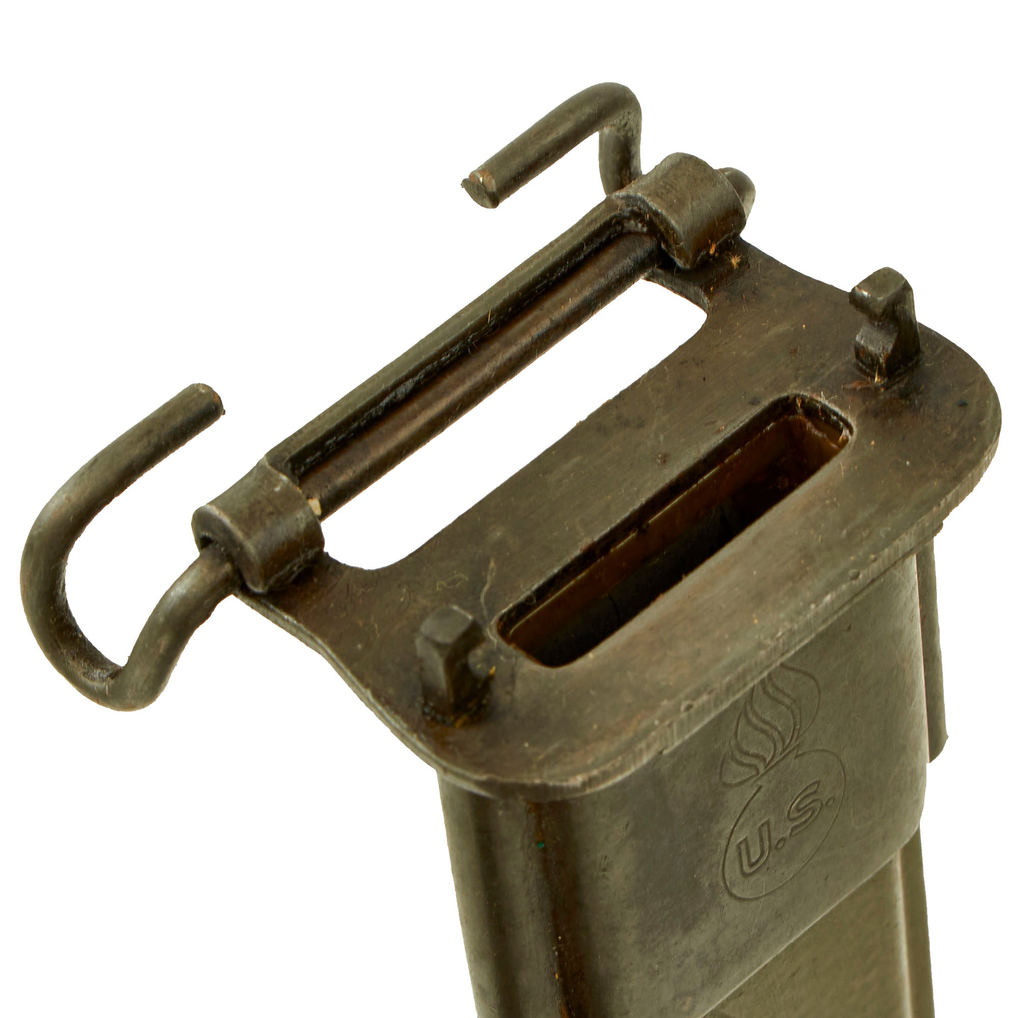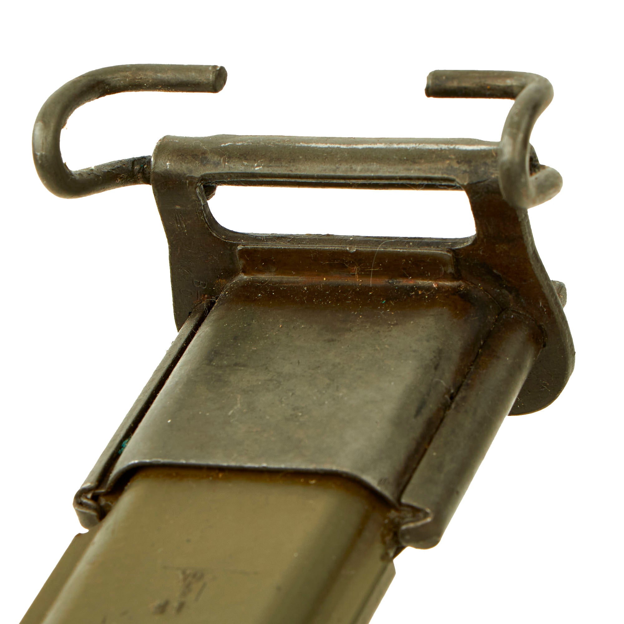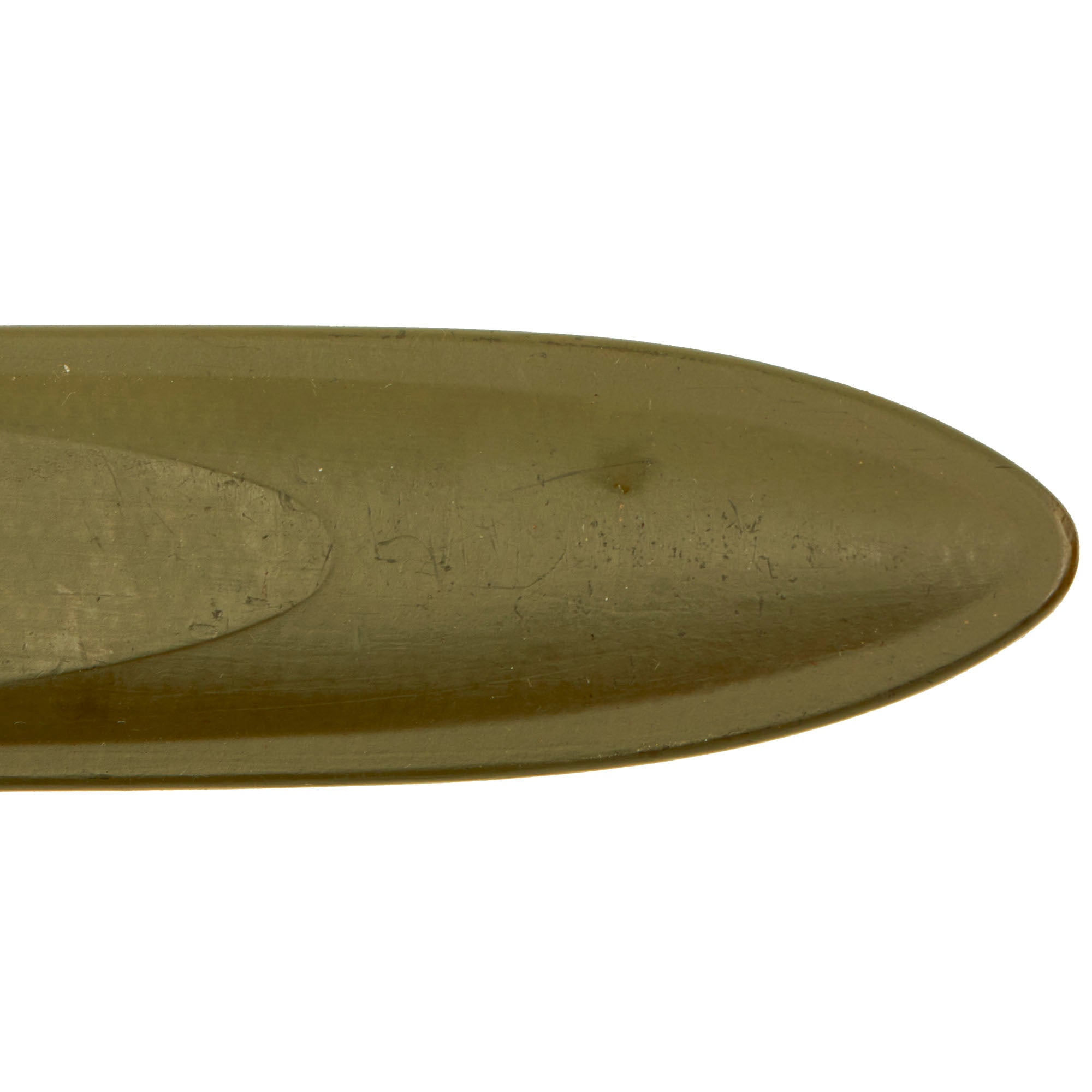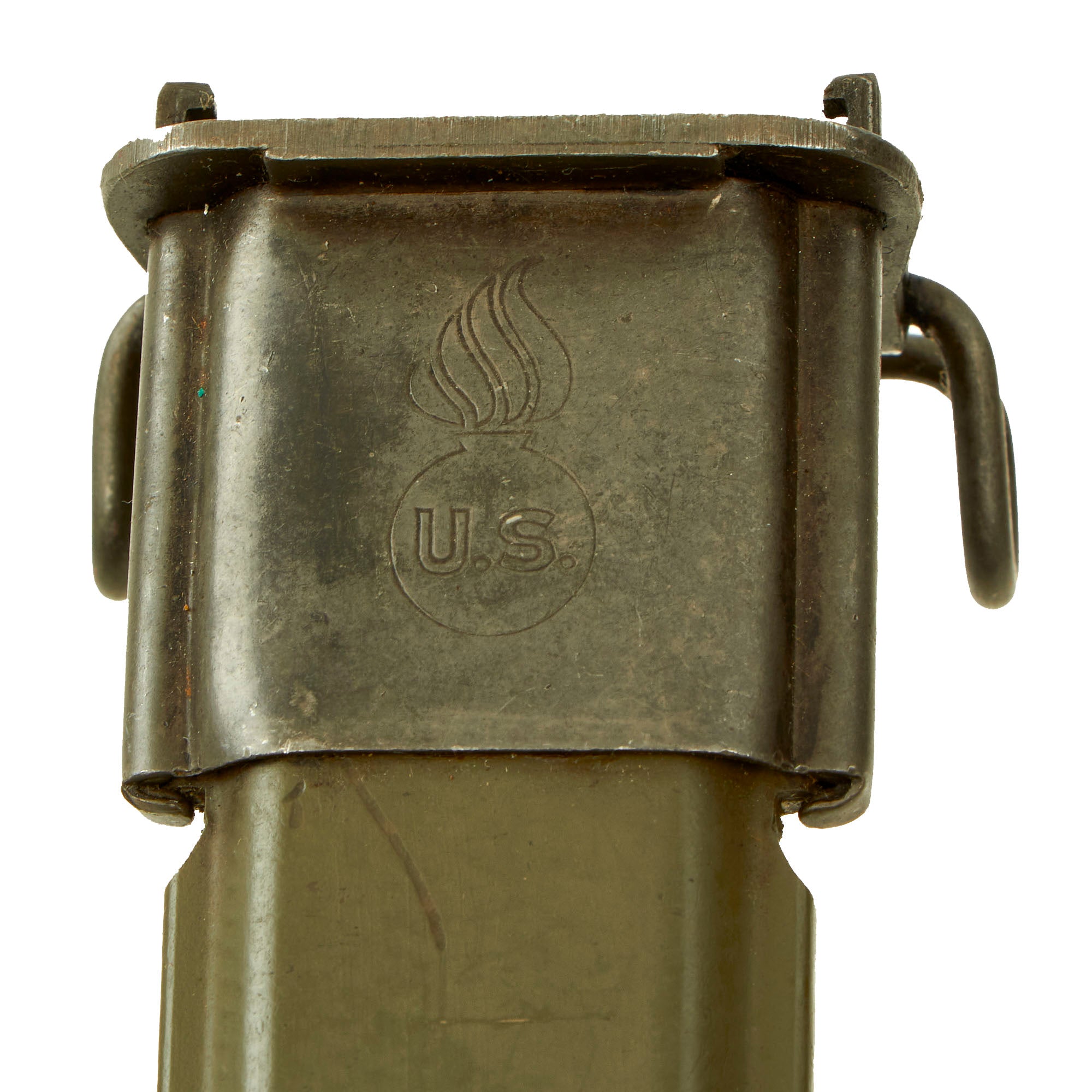 The original M7 scabbard is marked U.S. on the parkerized steel throat over the "Flaming Bomb", and is in good condition. The VP marking on the underside of the metal throat lip indicates manufacture by Victory Plastics, who produced a variety of thermoplastic impregnated cotton fabric scabbards during the war. The scabbard body has no cracks or major chips, and looks to have a late or post war refinished body. There is just a bit of wear through to the original finish, and no sign of major damage.