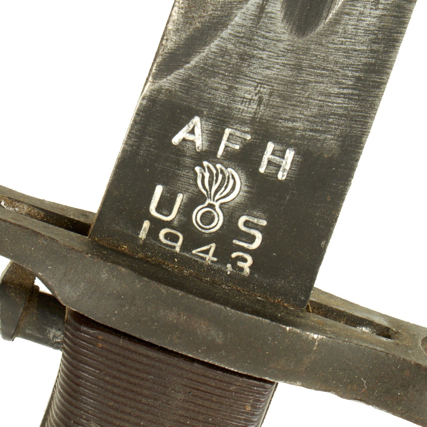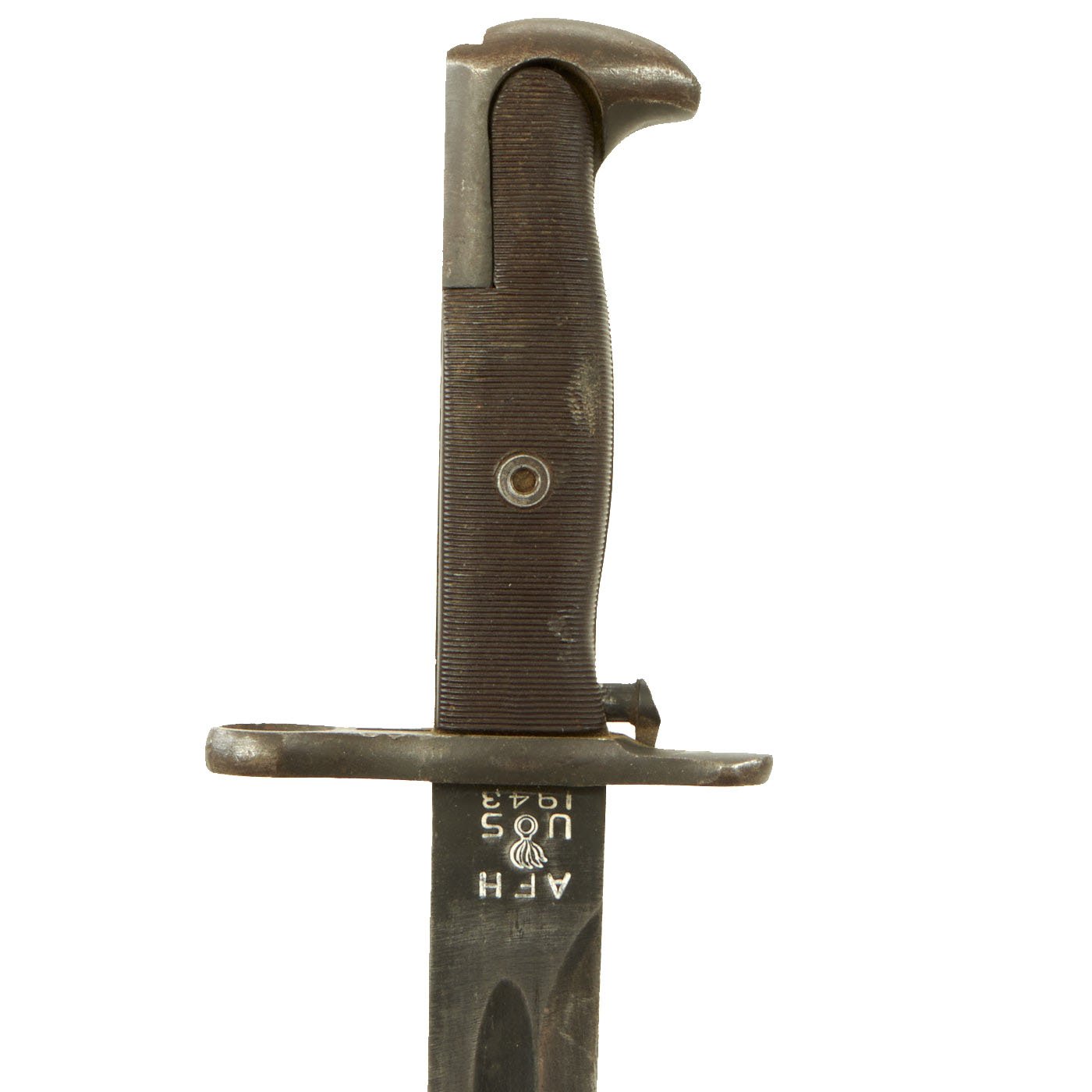 This example is in very good shape, but does show wear from use and cleaning. The blade ricasso is marked with maker A. F. H. (American Fork & Hoe of Geneva, Ohio) above U.S. around the Ordnance flaming bomb. Below this is the manufacture date of 1943. The original parkerized finish on the blade is partly worn away, showing use and wear after being cut down. The tip area is almost completely devoid of finish, while the ricasso has almost full finish, and the hilt has a good amount of finish as well. The original plastic grips are present and in good condition, showing light scratches and scrapes from service.