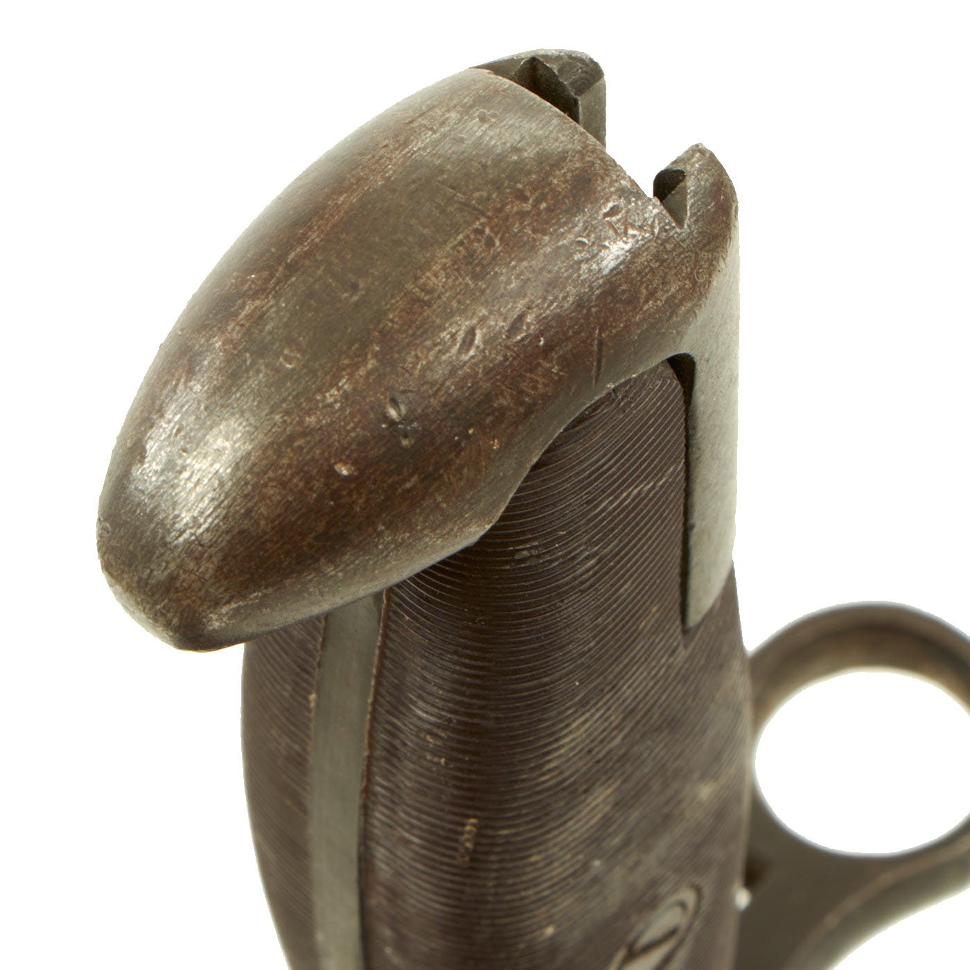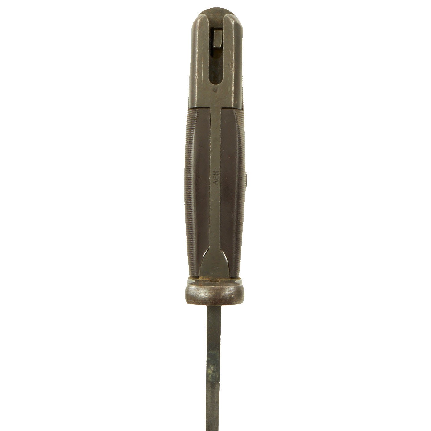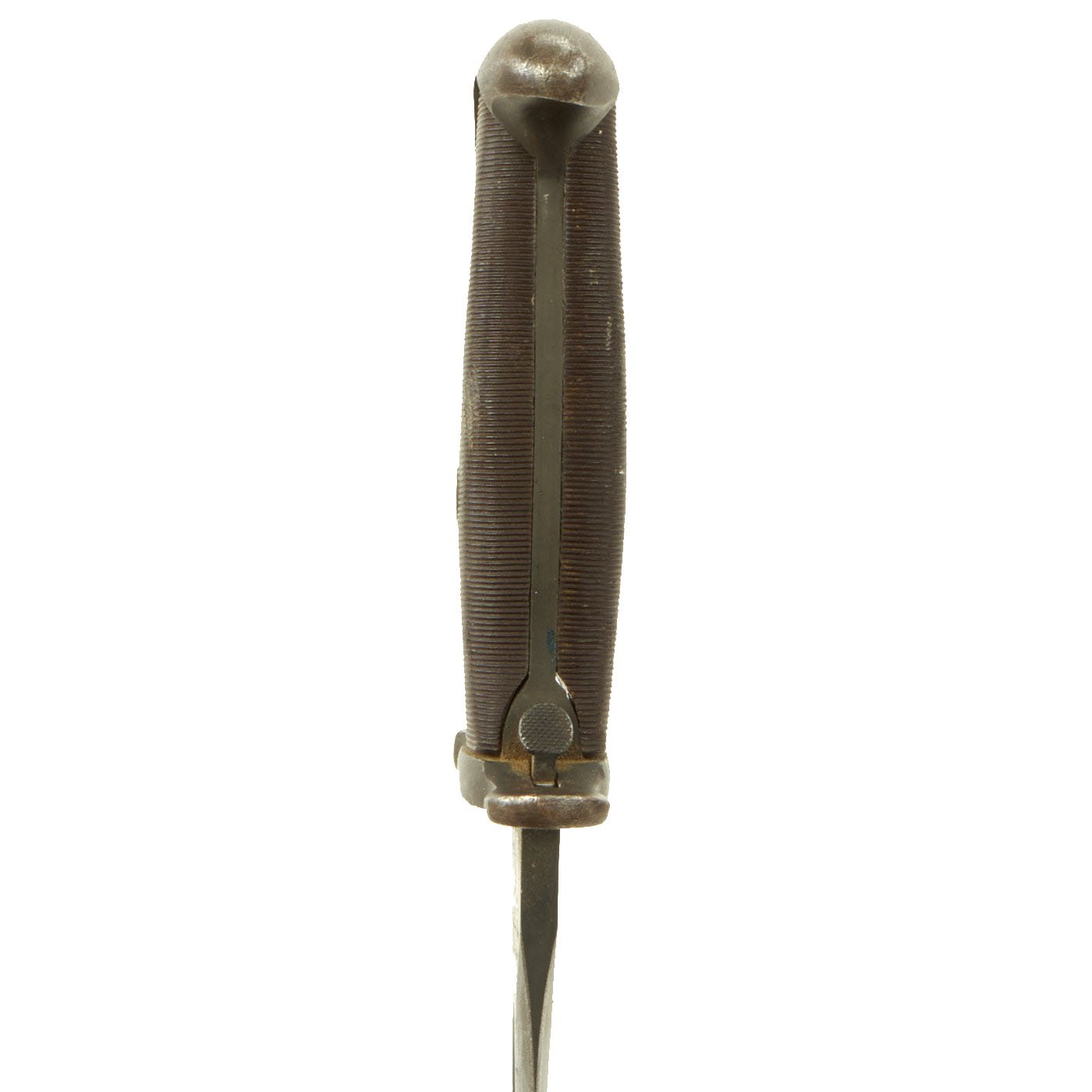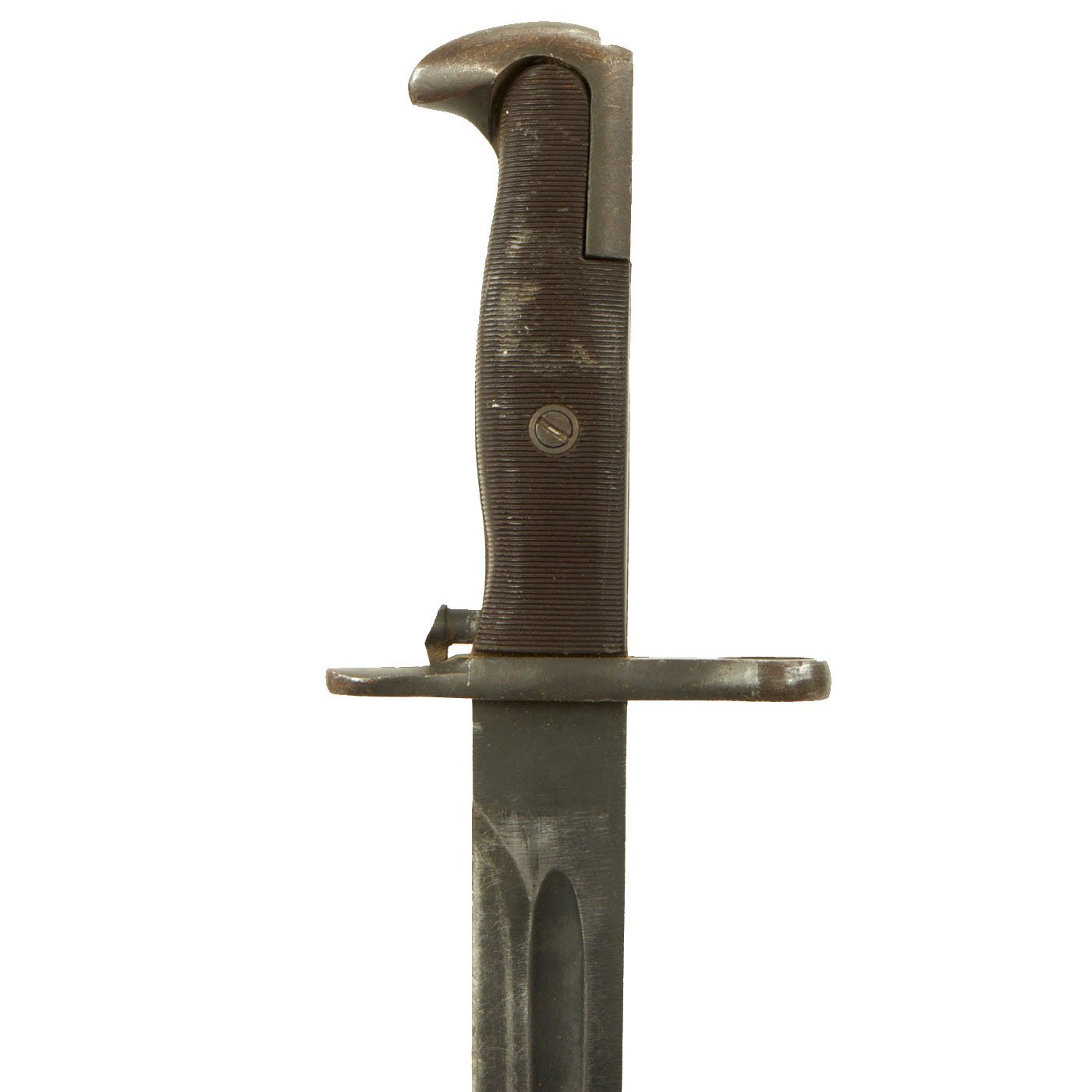 Original Item: Only One Available. This is a very nice condition M1905/1942 U.S. bayonet with a 10 inch cut-down blade for the M1 Garand Rifle, complete with the correct WWII Issue M7 scabbard. In 1943, the U.S. Army made the decision to shorten the M1905 bayonet's blade to 10 inches (25.4 cm) and as many of the M1905 and M1942 bayonets as possible were recalled, their blades were cut down to size, and were reissued. These shortened M1905 bayonets were re-designated as M1905E1.