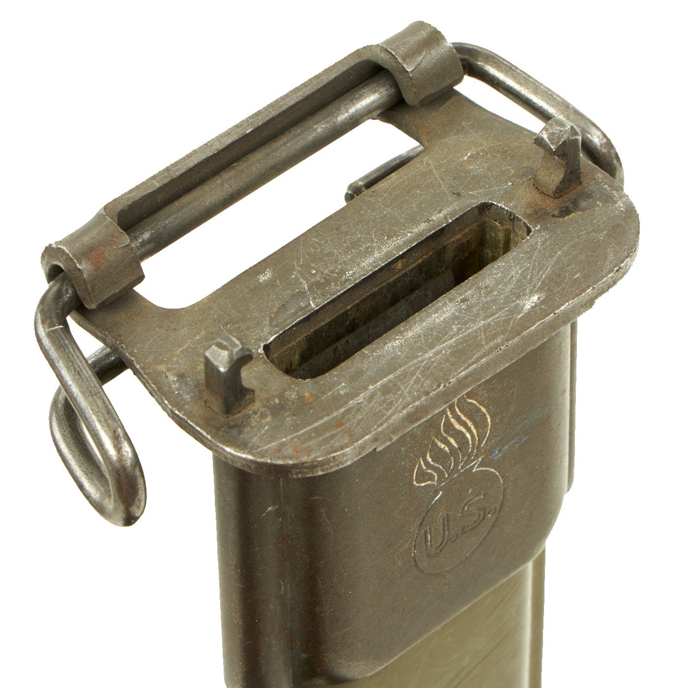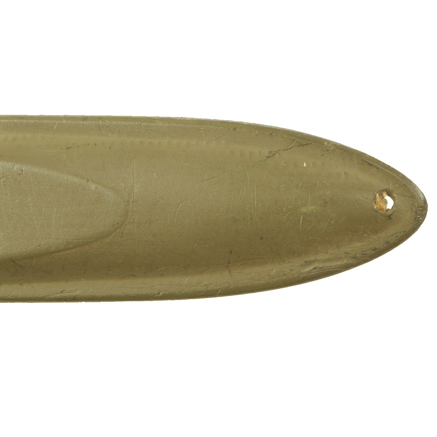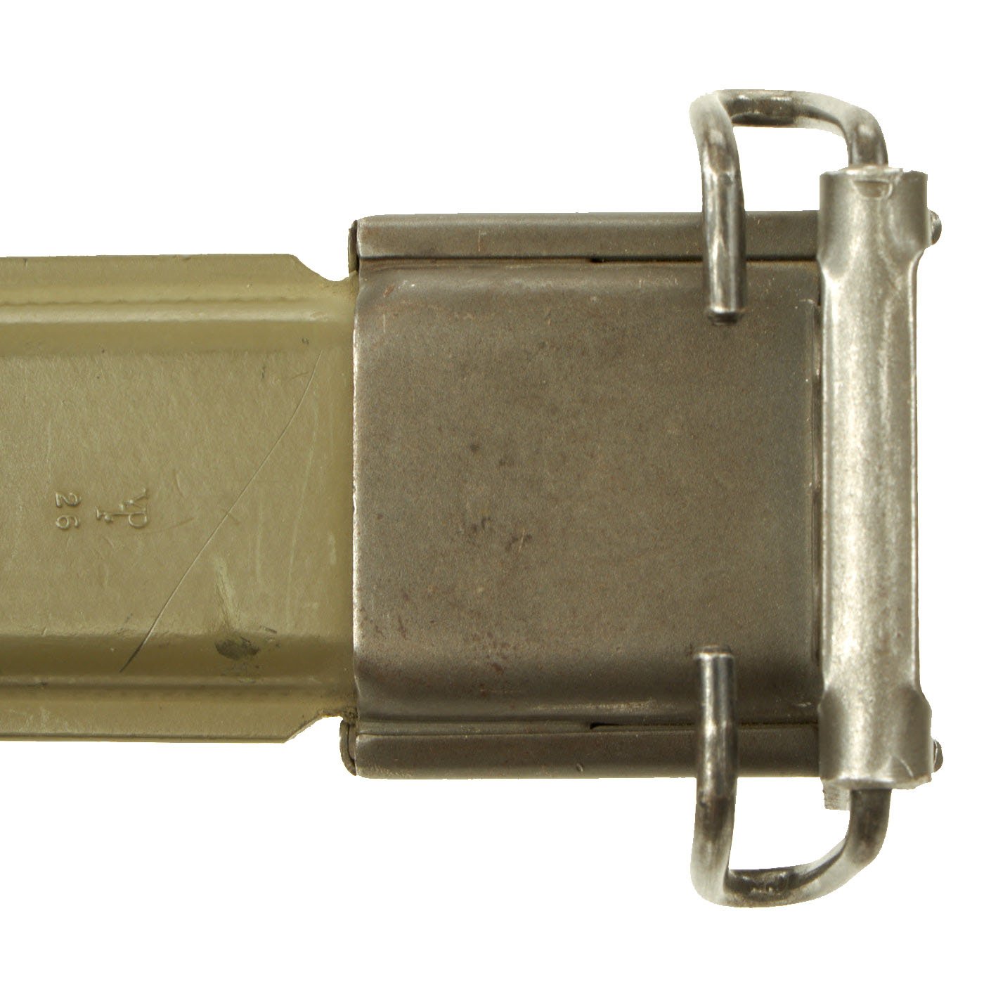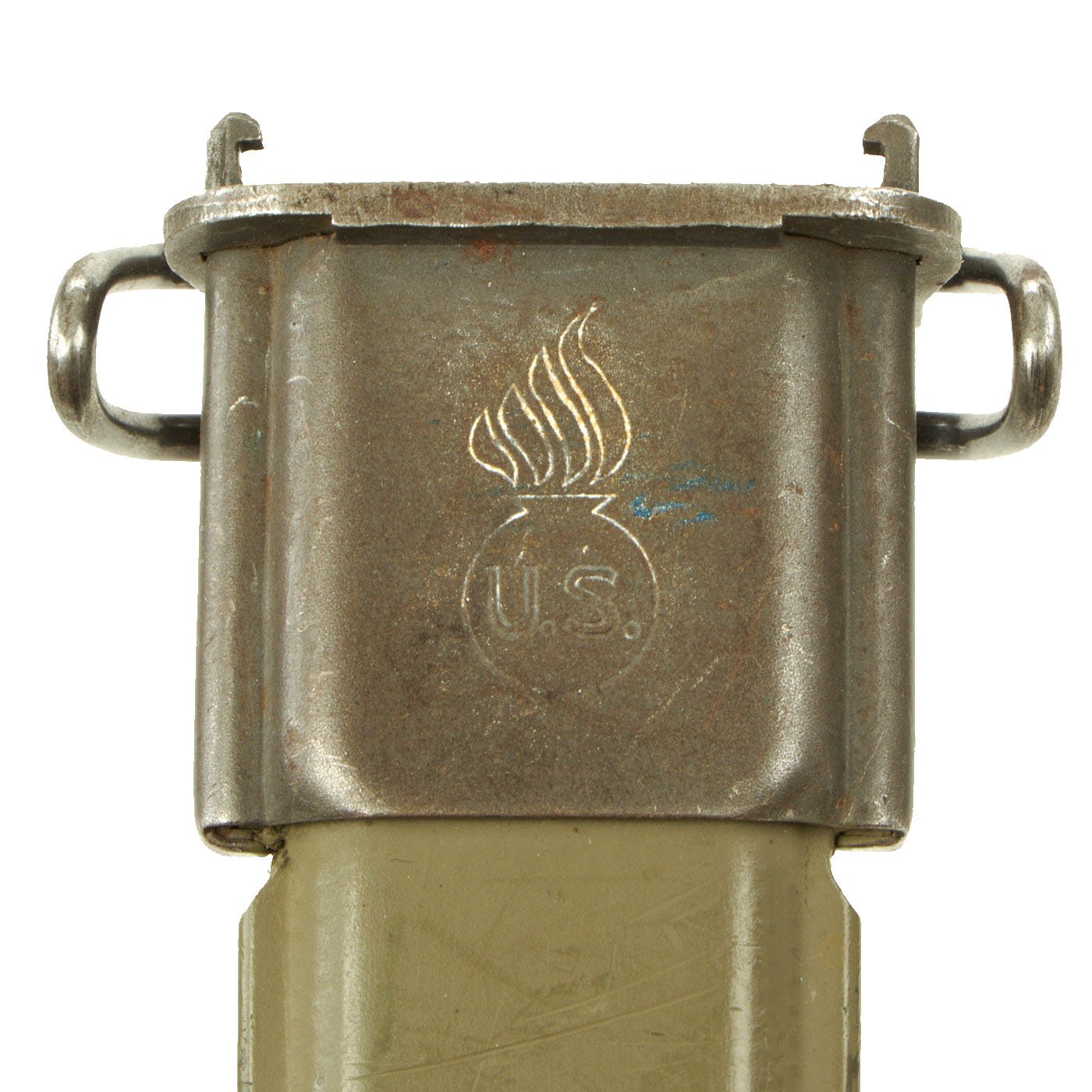 The original M7 scabbard is marked U.S. on the parkerized steel throat over the "Flaming Bomb", and is in good condition. The VP marking on the underside of the metal throat lip indicates manufacture by Victory Plastics, who produced a variety of thermoplastic impregnated cotton fabric scabbards during the war. The scabbard body has no cracks or major chips, and looks to have a late or post war refinished body. There is just a bit of wear through to the original finish, and no sign of major damage.