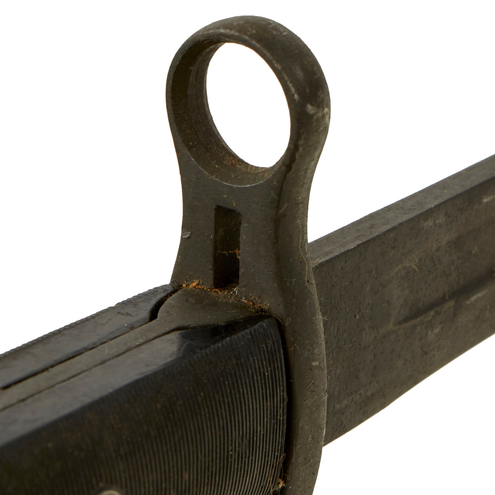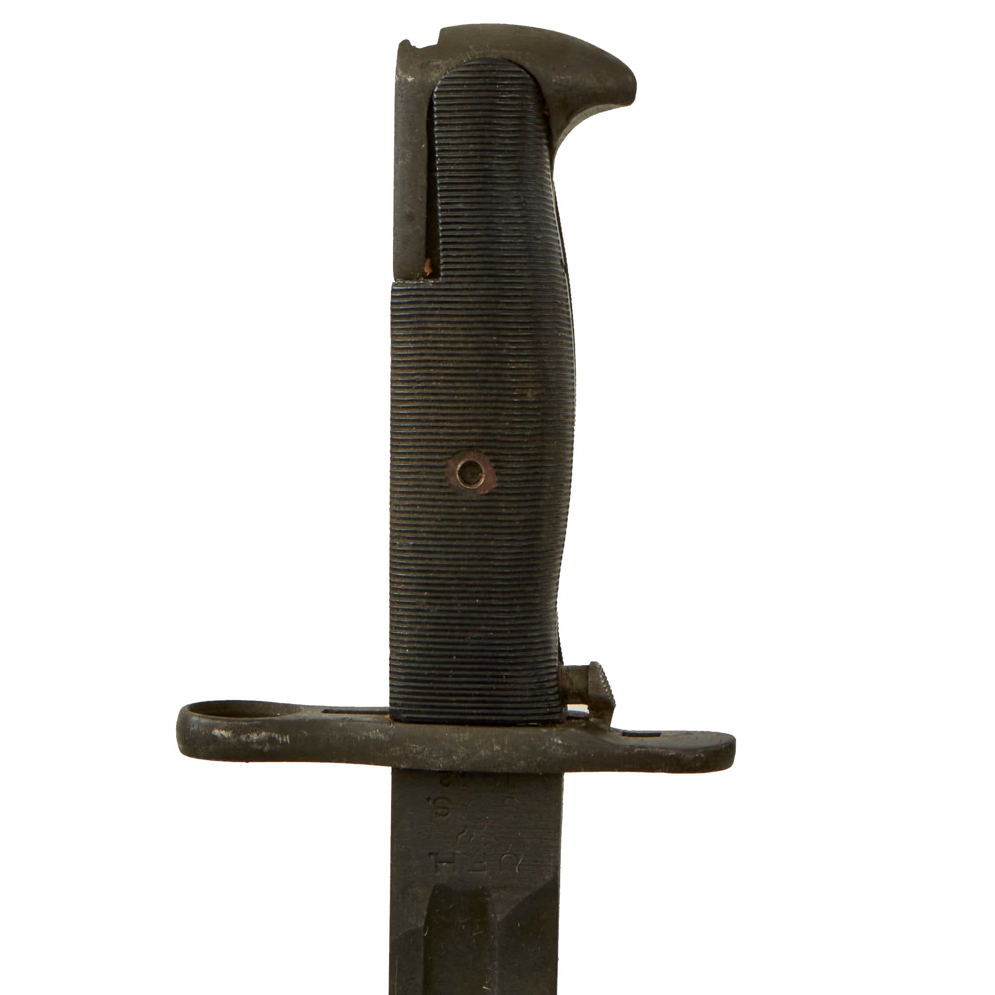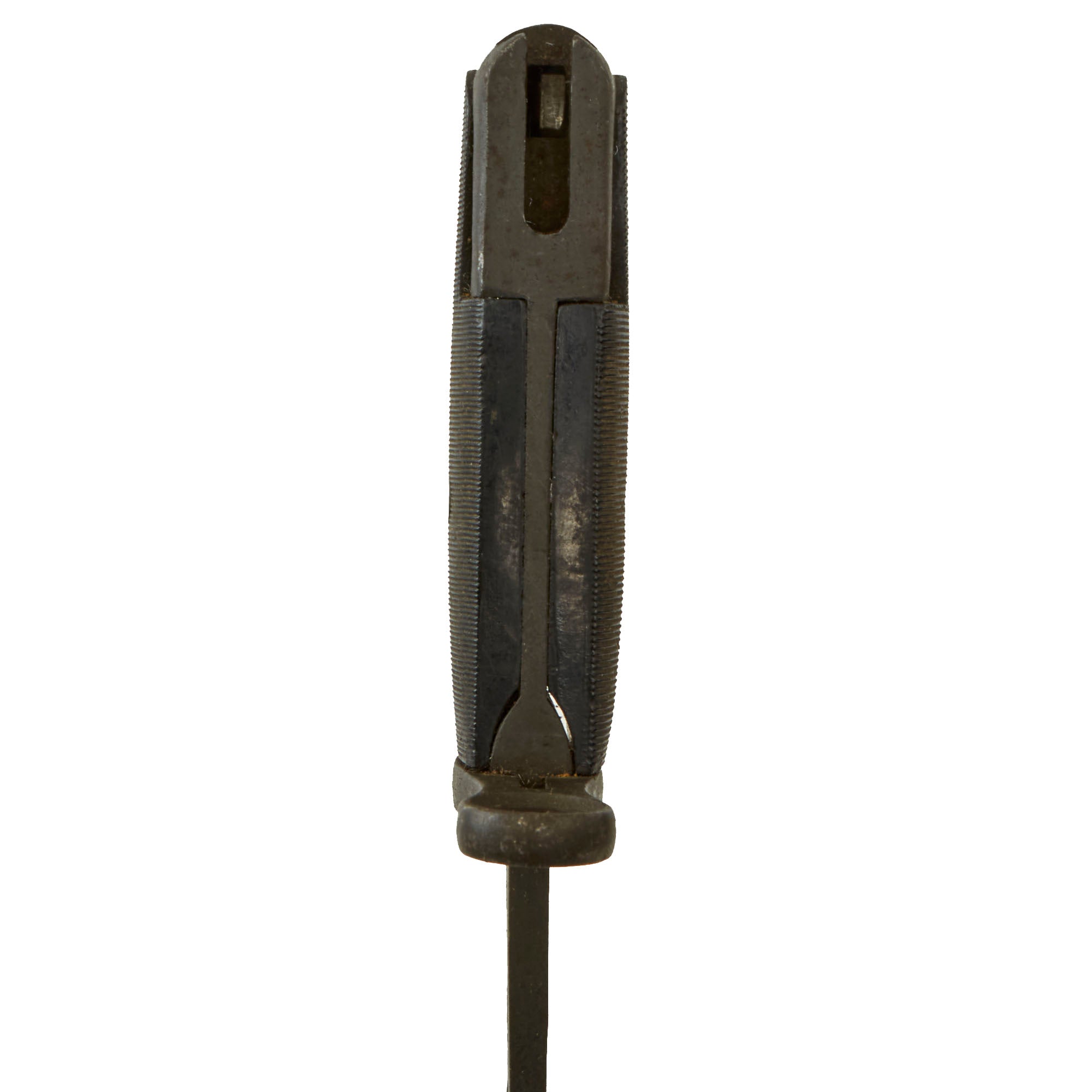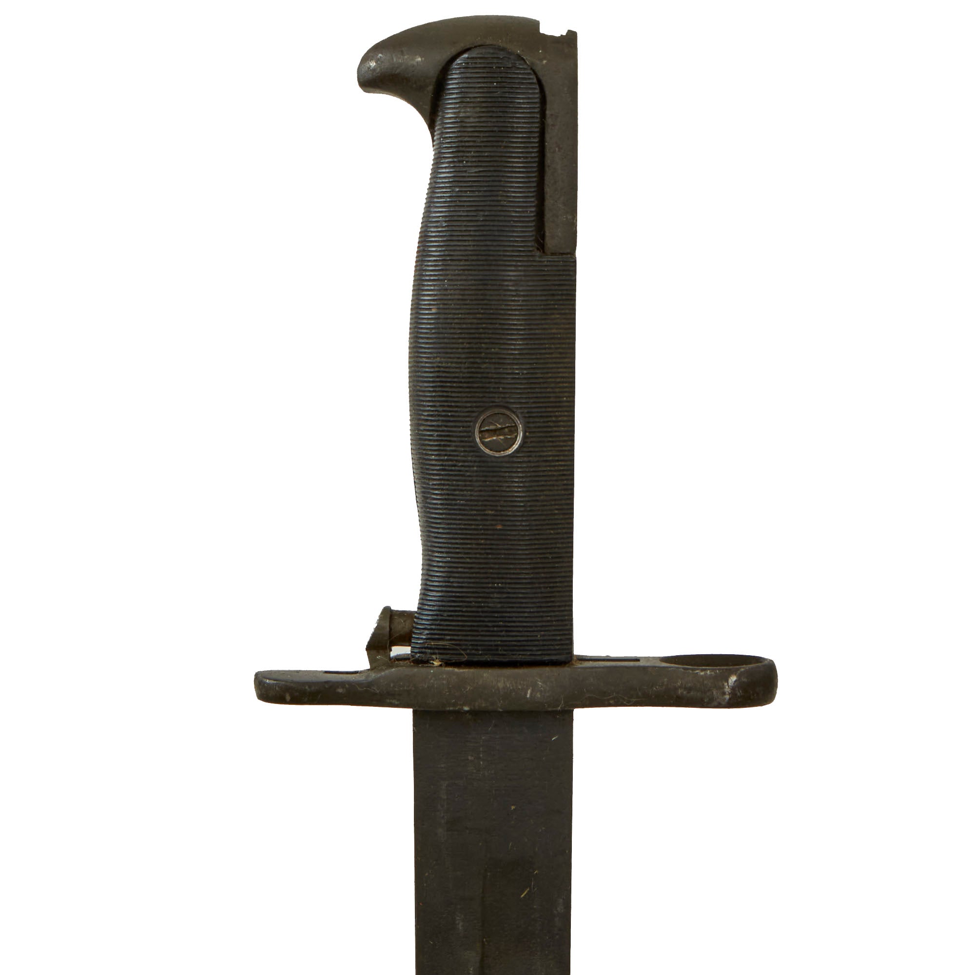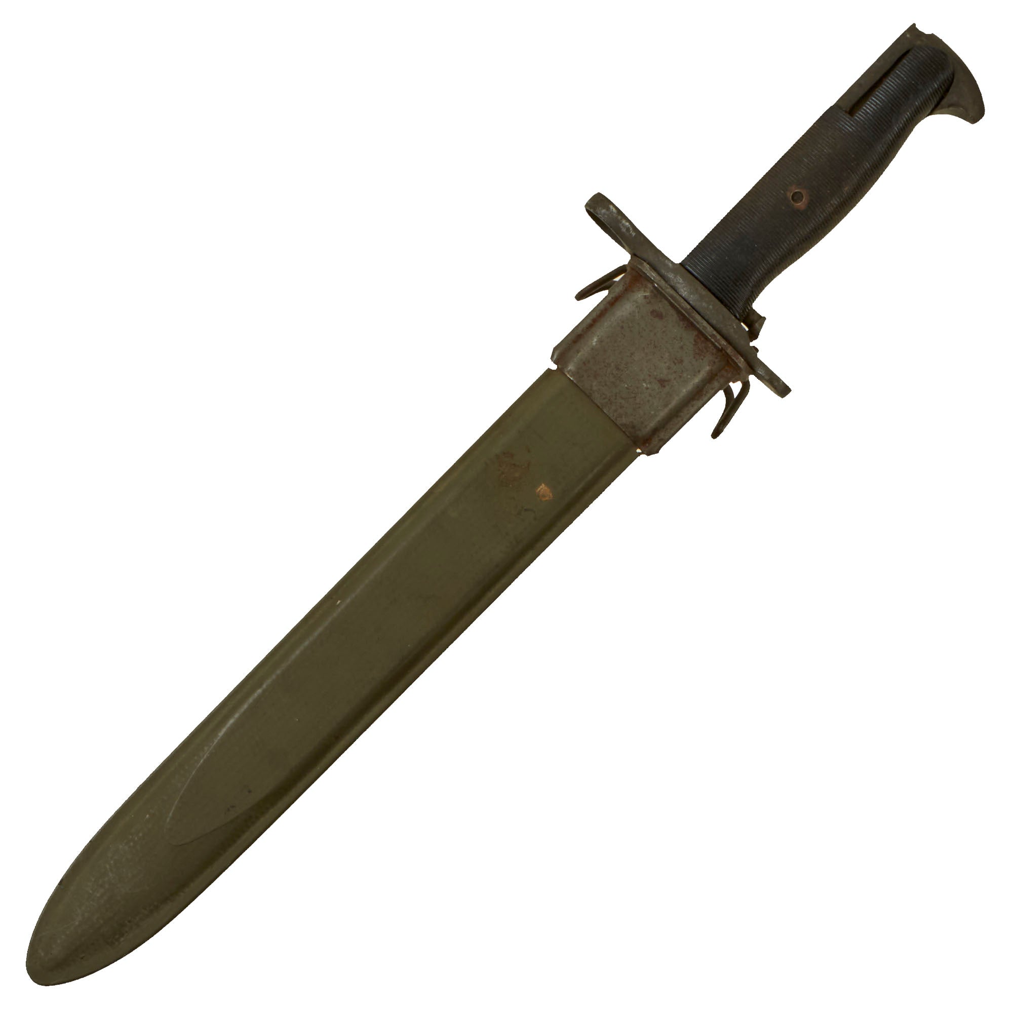 Original Item: Only One Available. This is a very nice service used M1905/1942 U.S. bayonet with a 10 inch cut-down blade for the M1 Garand Rifle, complete with the correct WWII Issue M7 scabbard. In 1943, the U.S. Army made the decision to shorten the M1905 bayonet's blade to 10 inches (25.4 cm) and as many of the M1905 and M1942 bayonets were recalled, their blades were cut down to size, and were reissued. These shortened M1905 bayonets were re-designated as M1905E1.