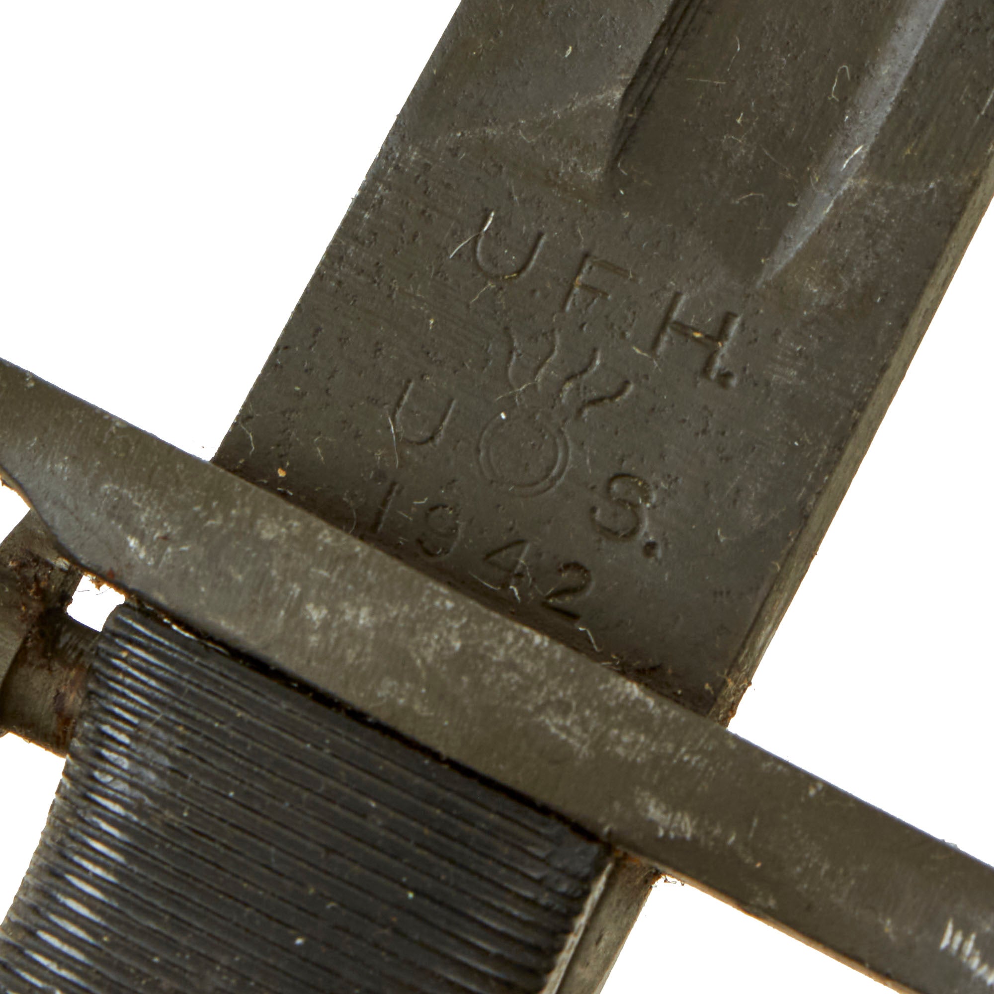 This example is in very good shape, but does show wear from age and use. The blade ricasso is marked by maker U. F. H. (Union Fork & Hoe of Columbus, Ohio) above U.S. around the Ordnance "flaming bomb" and the date 1942. The reverse still has an extremely faint ordnance "Crossed Cannons" cartouche slightly visible. The original parkerized finish on the blade is retained quite well with the expected runner wear. The hilt also has a very nice finish, and the original plastic ribbed grip panels are in lovely condition, with moderate wear.