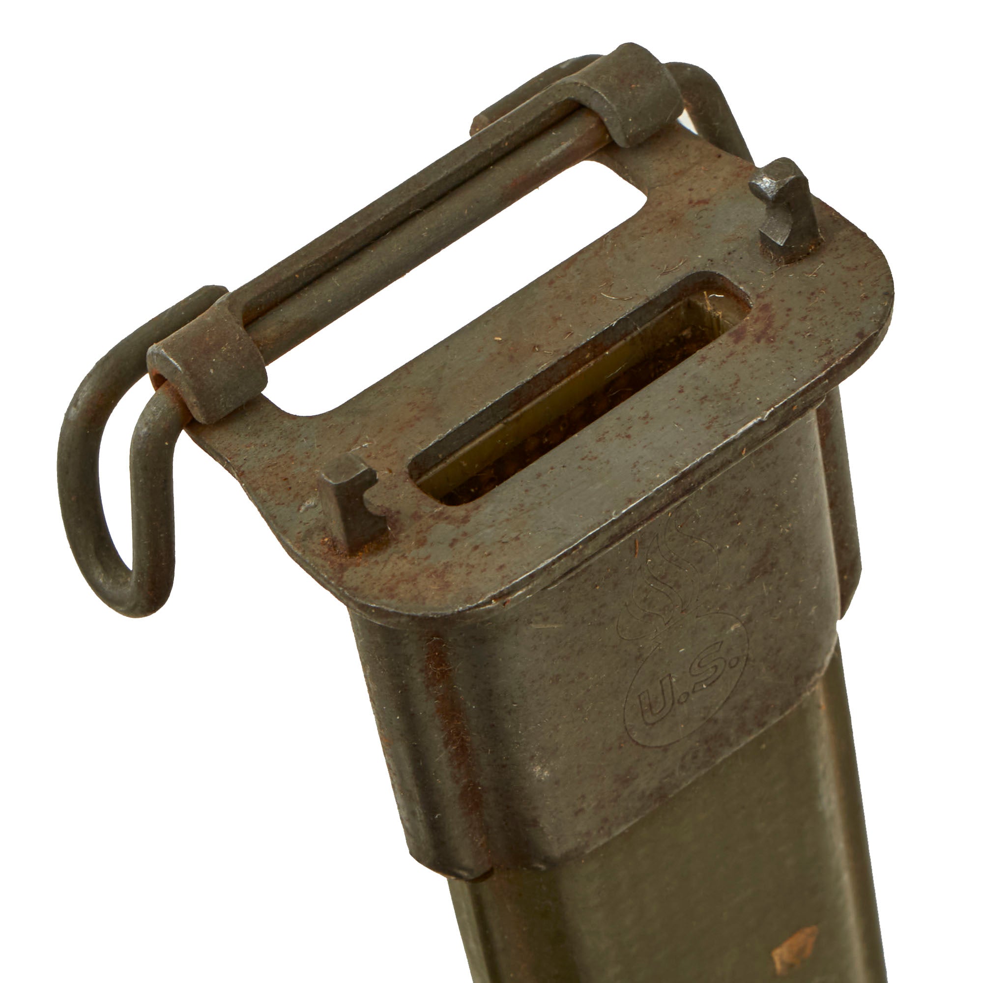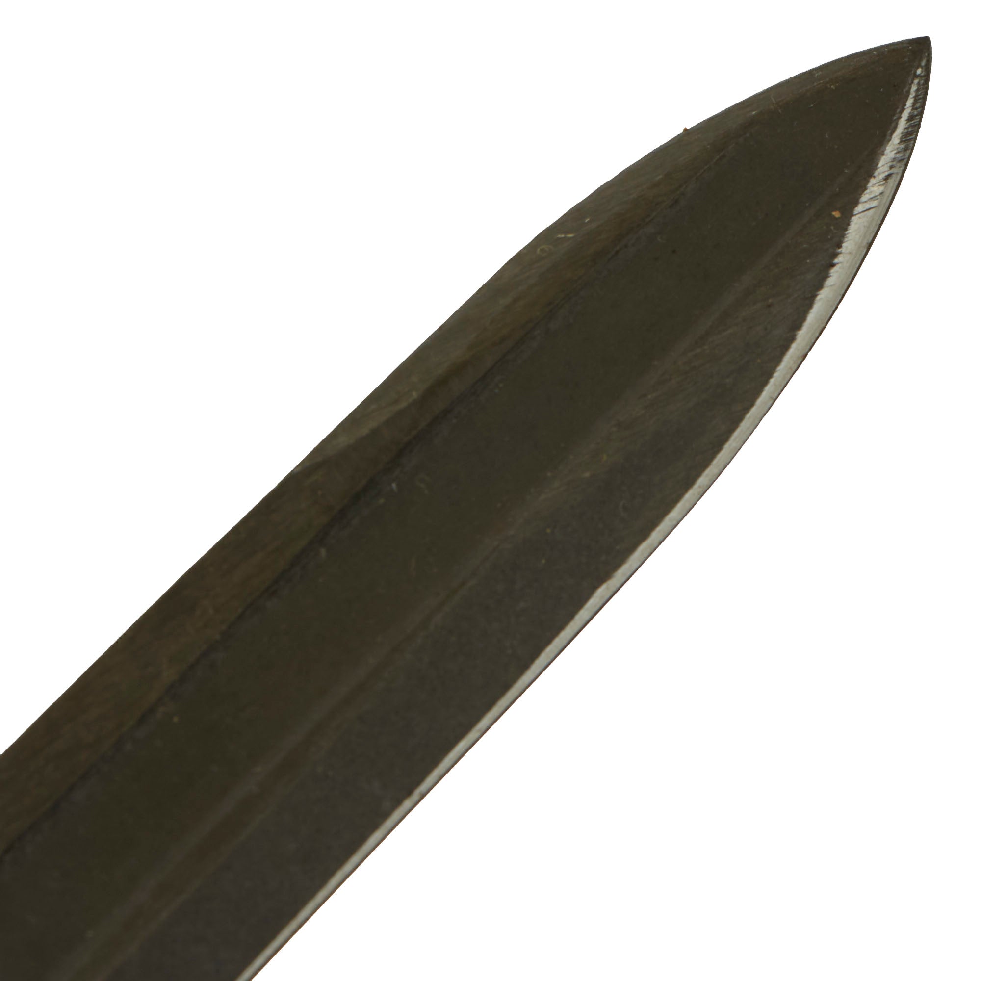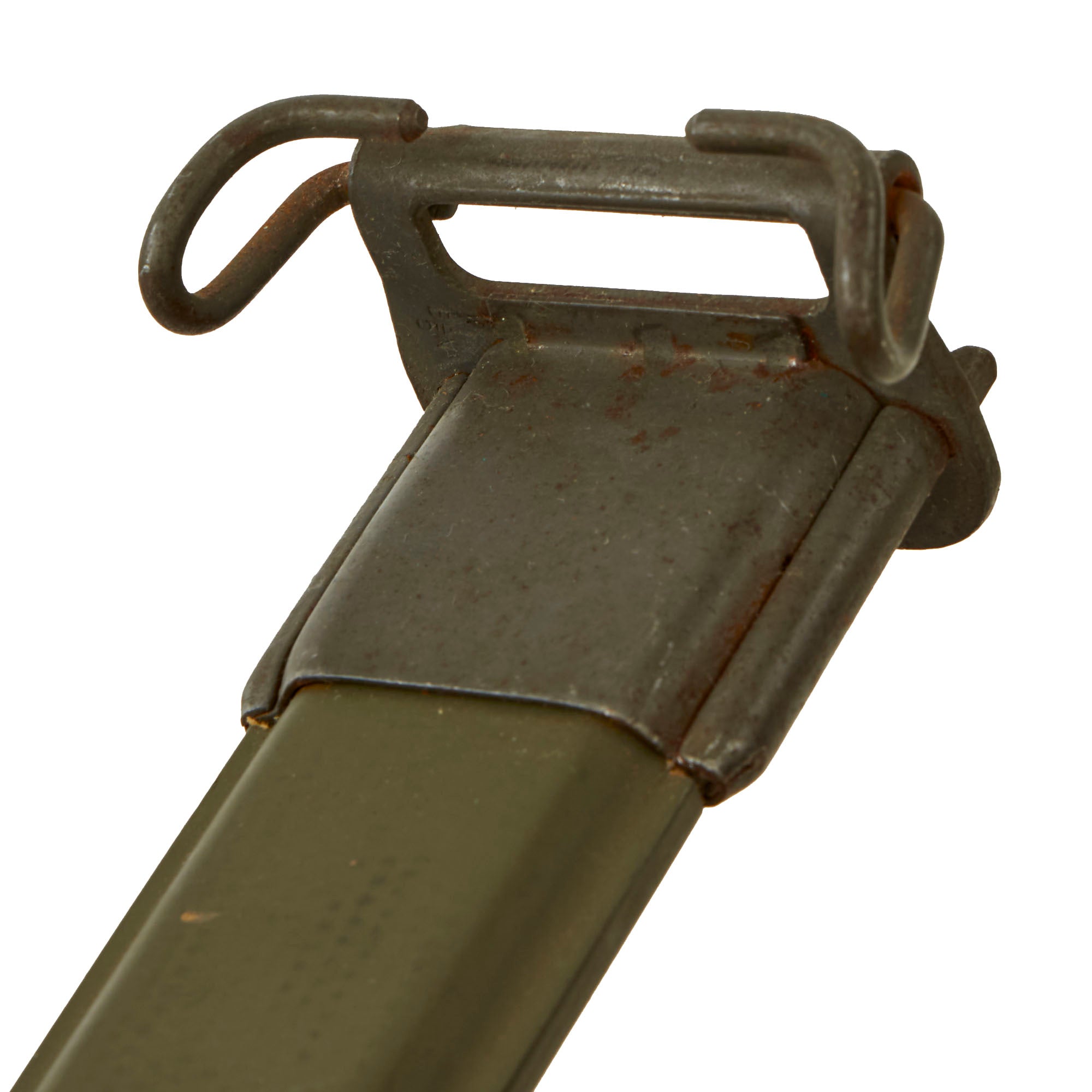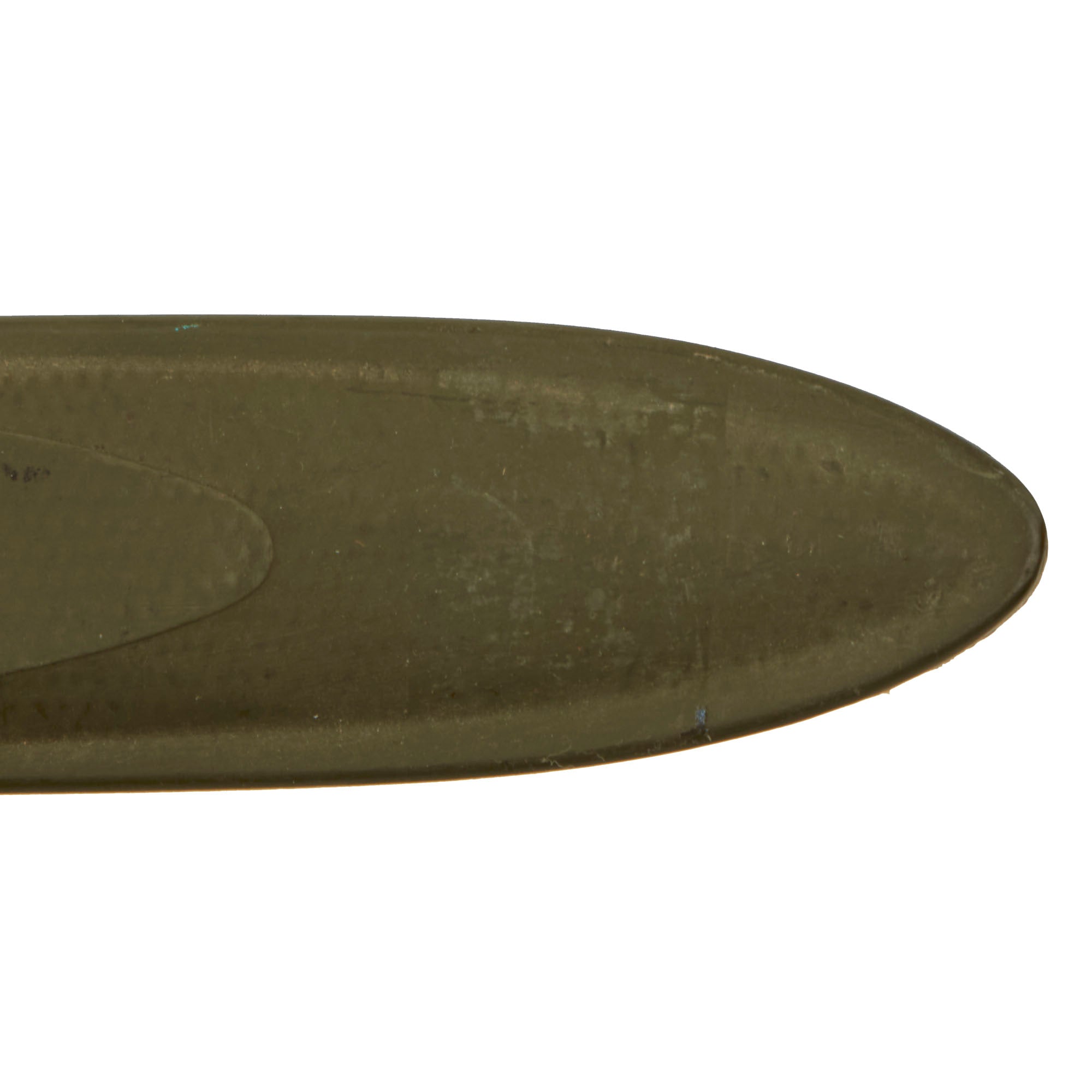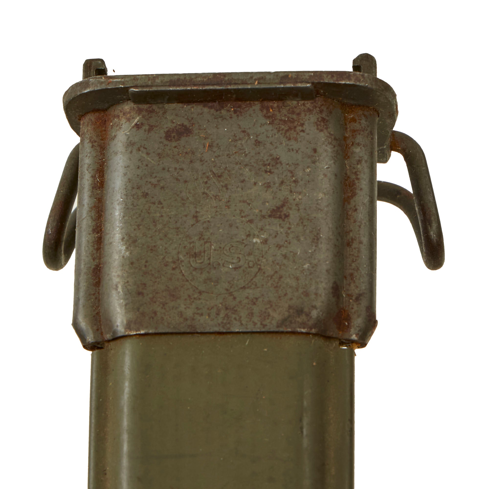 The original M7 scabbard is marked U.S. on the parkerized steel throat over the "Flaming Bomb", and is in good condition. The scabbard body has no cracks or major chips, and looks to have a late or post war refinished body. There is just a bit of wear through to the original finish, and no sign of major damage.