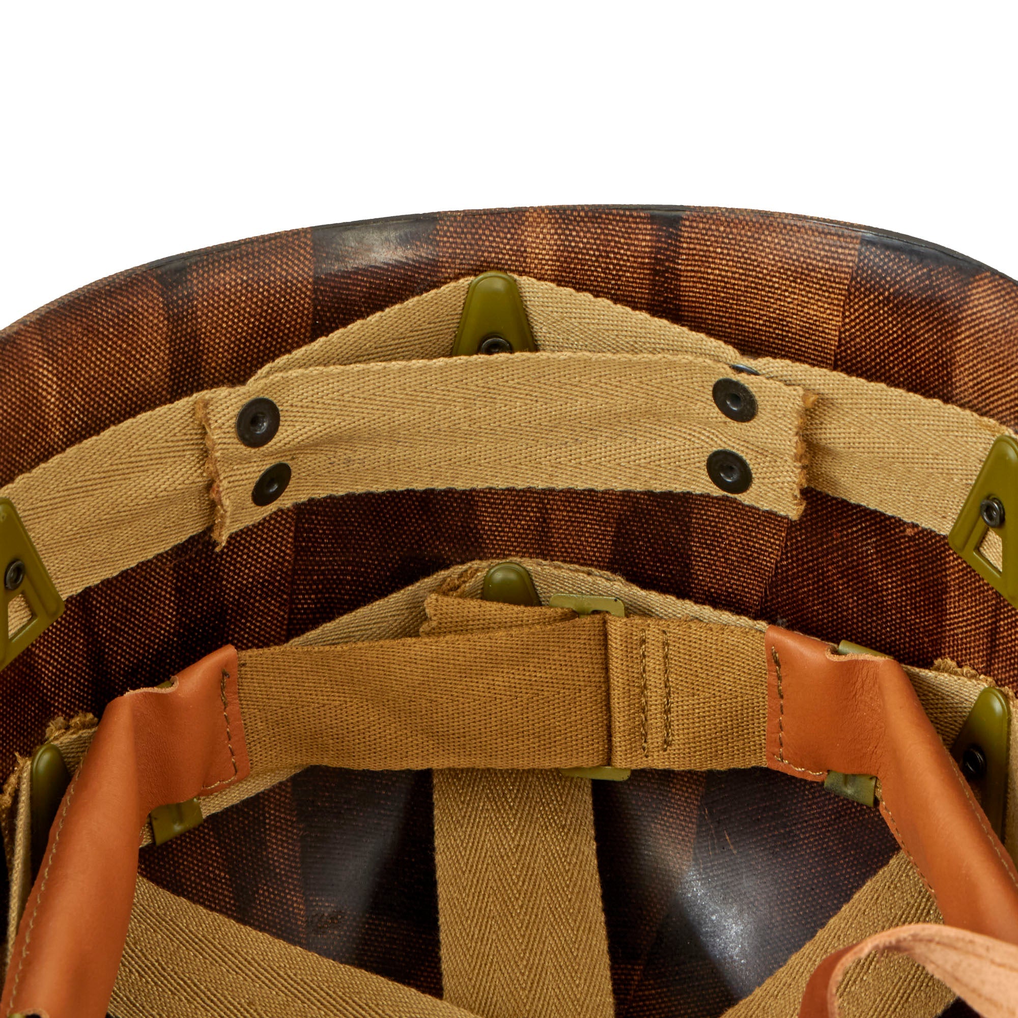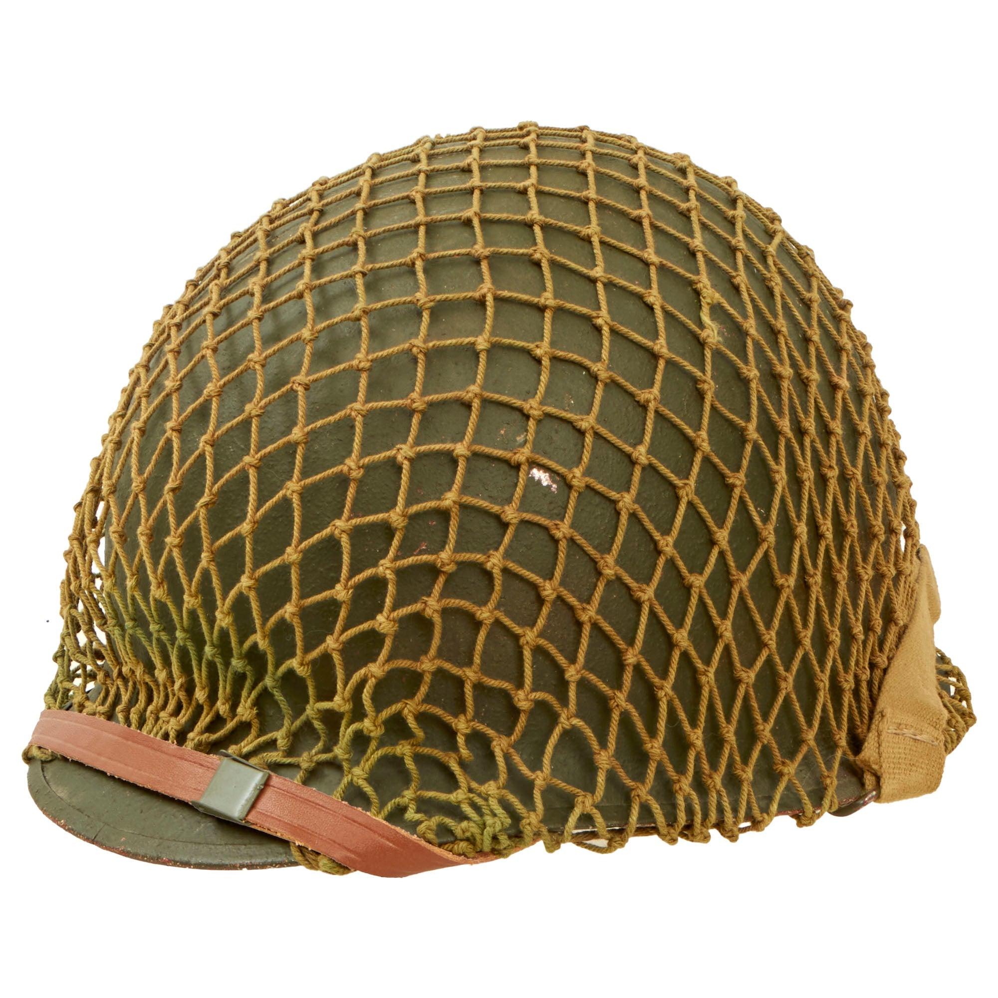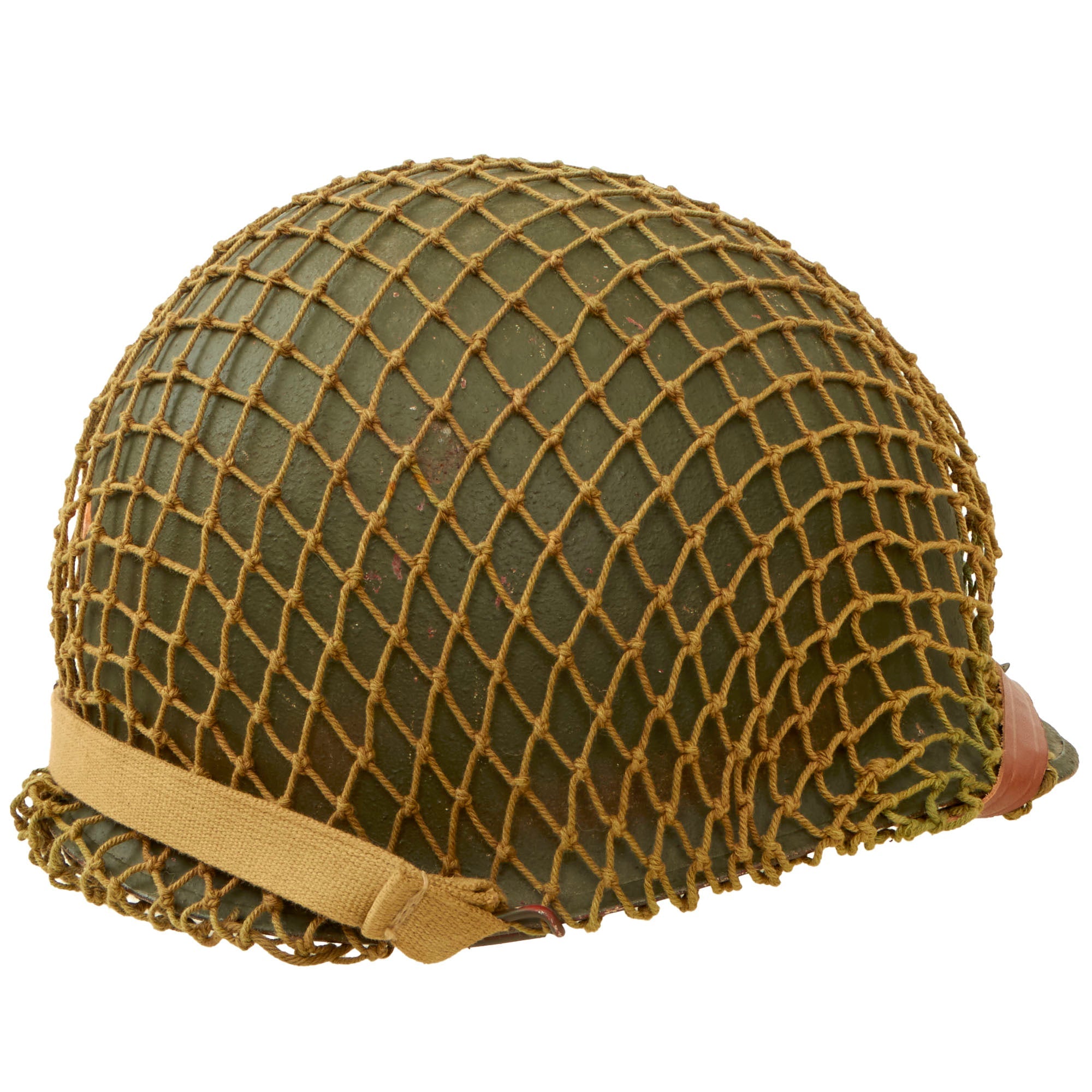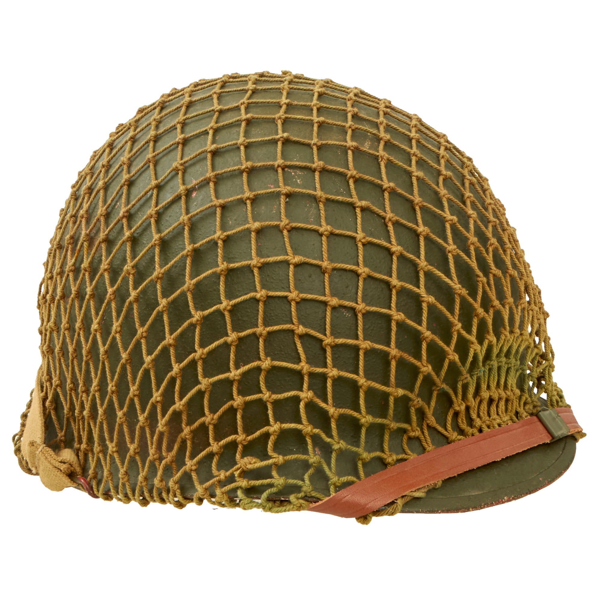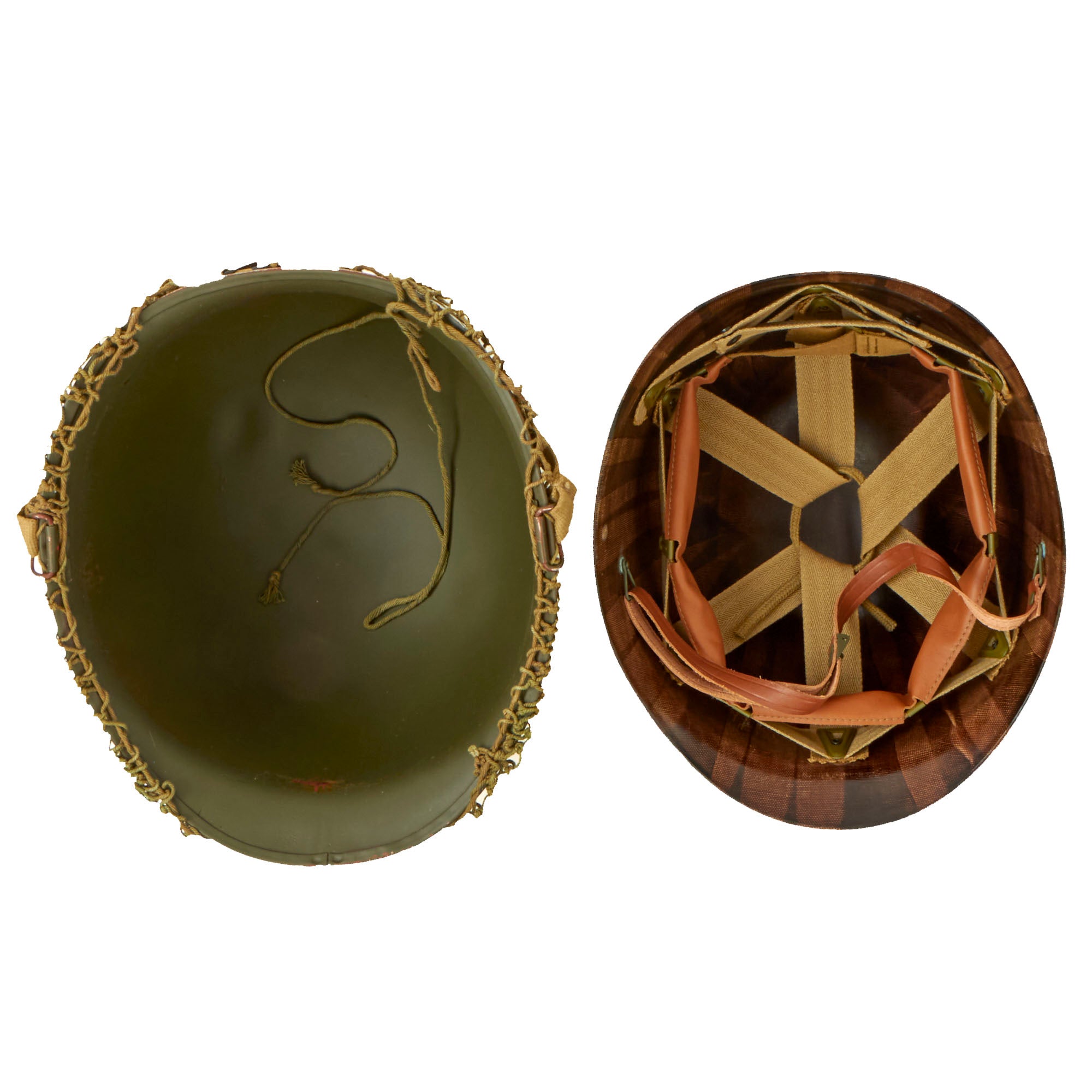 The helmet shell is a World War Two produced Helmet shell bearing a partial heat lot code 88. The rest of the heat stamp has worn away. The base paint of the helmet is the original factory paint, which gives the helmet an overall original appearance and aged patina. The chinstraps are high quality reproductions.
