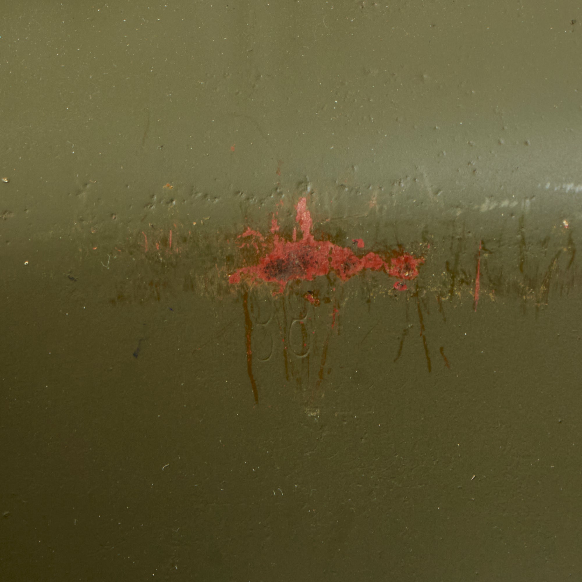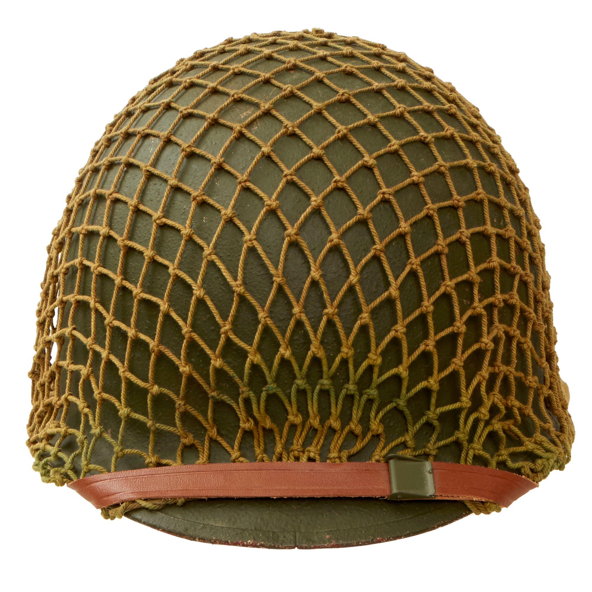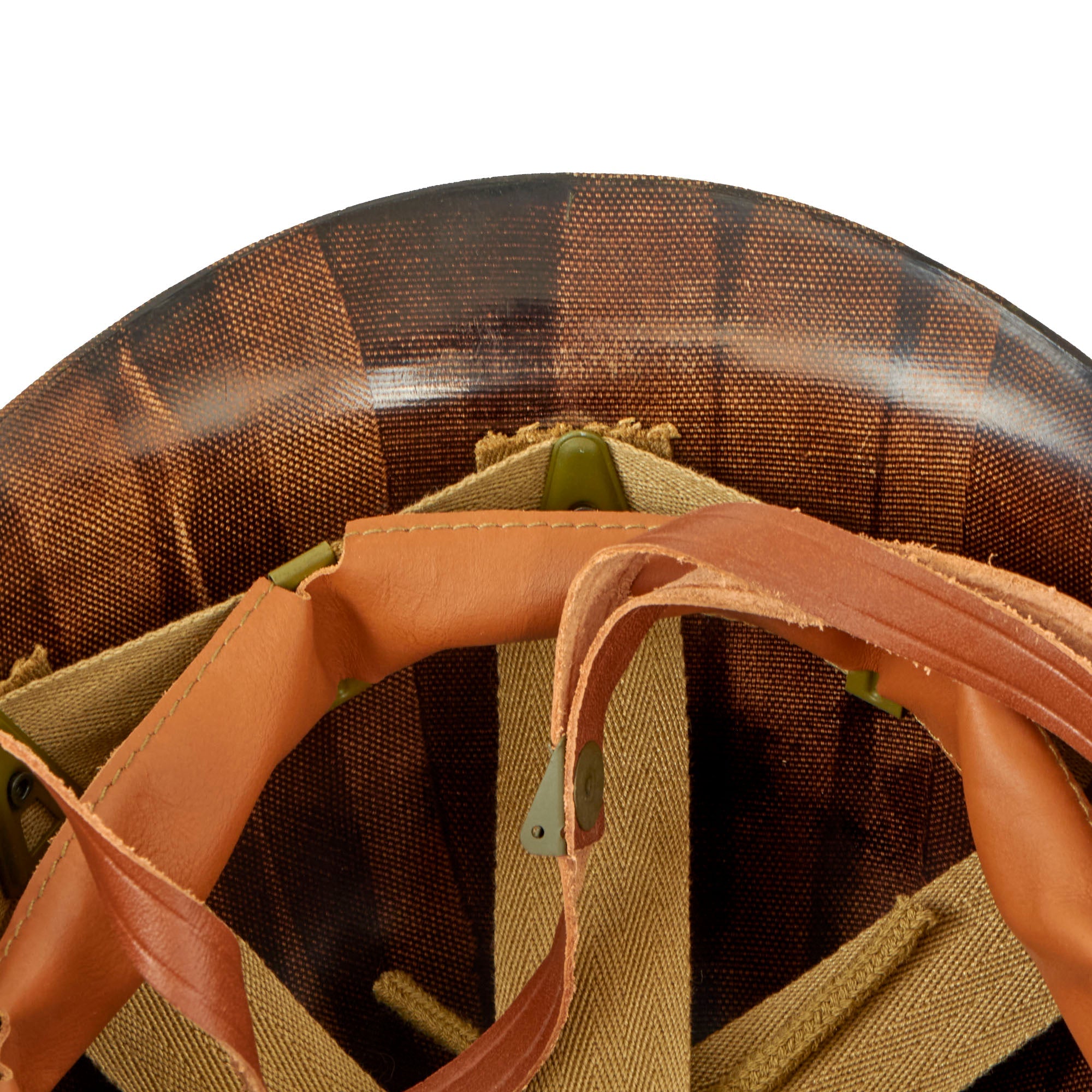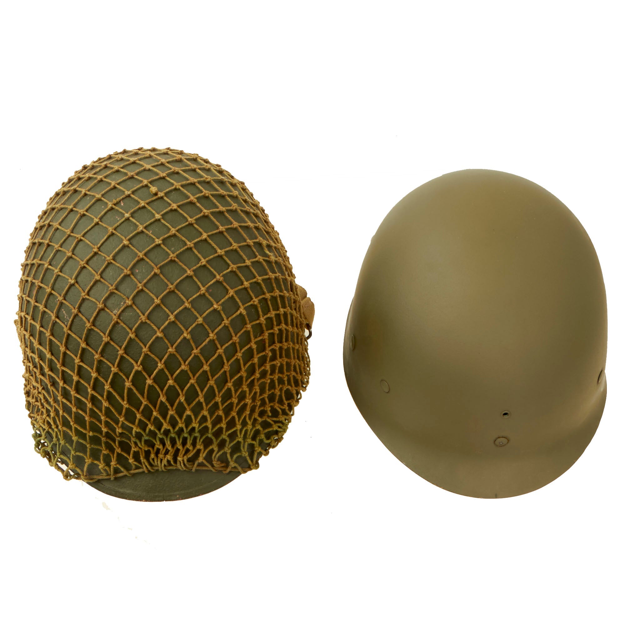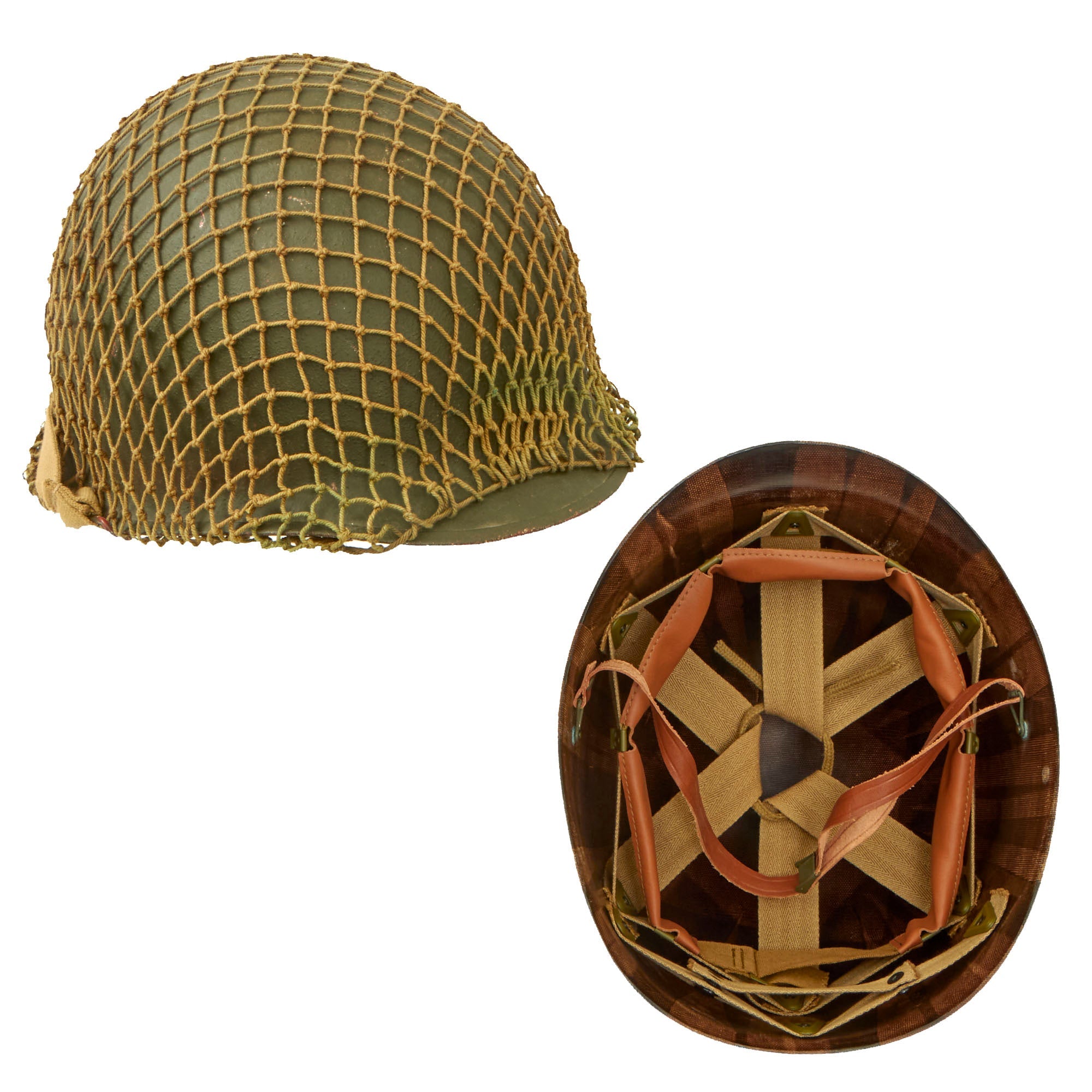 The helmet shell is a World War Two produced Helmet shell bearing a partial heat lot code 88. The rest of the heat stamp has worn away. The base paint of the helmet is the original factory paint, which gives the helmet an overall original appearance and aged patina. The chinstraps are high quality reproductions.