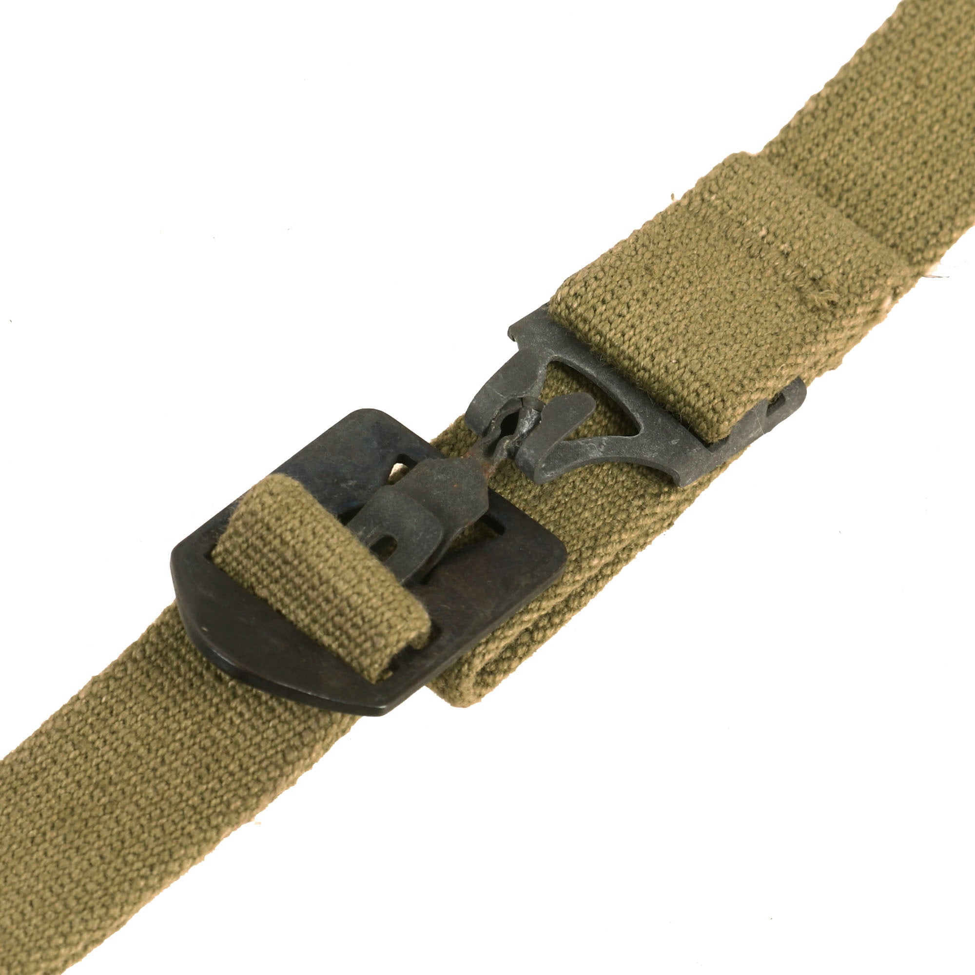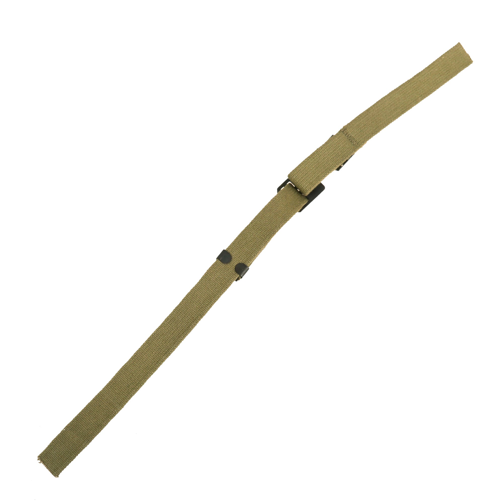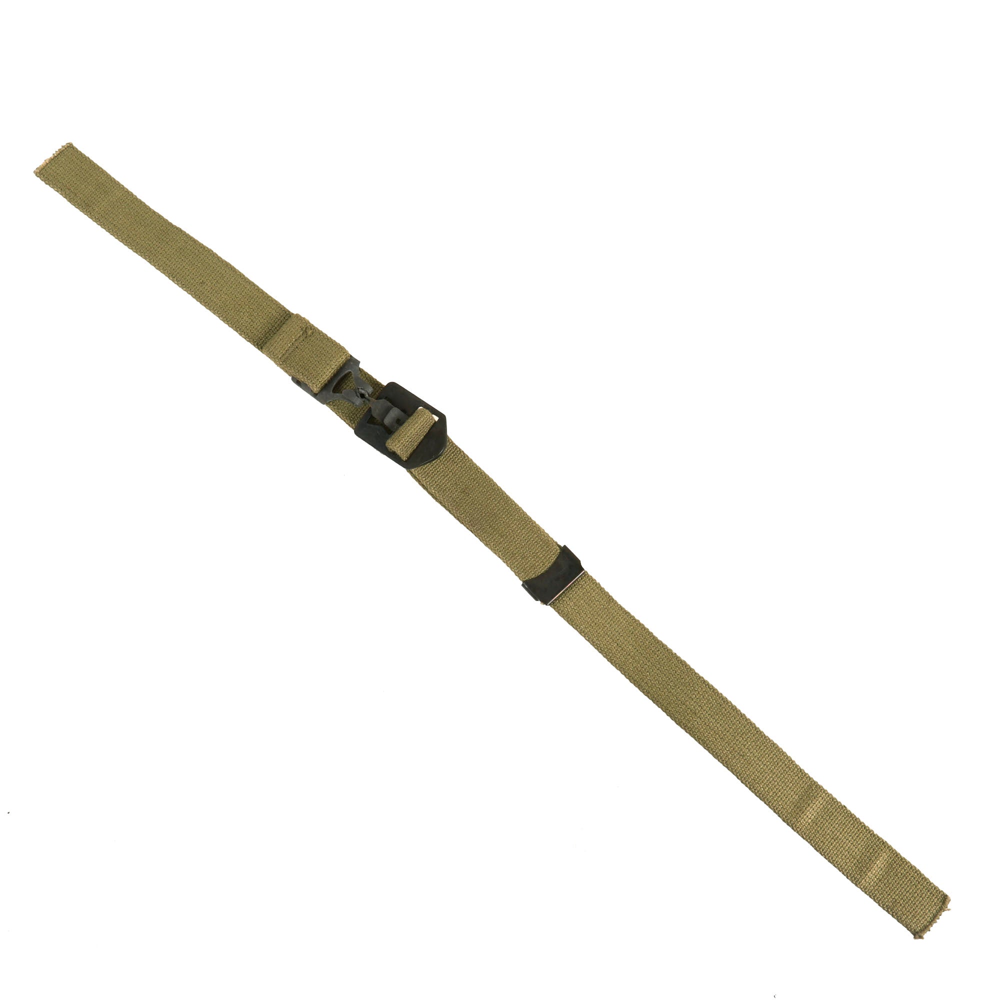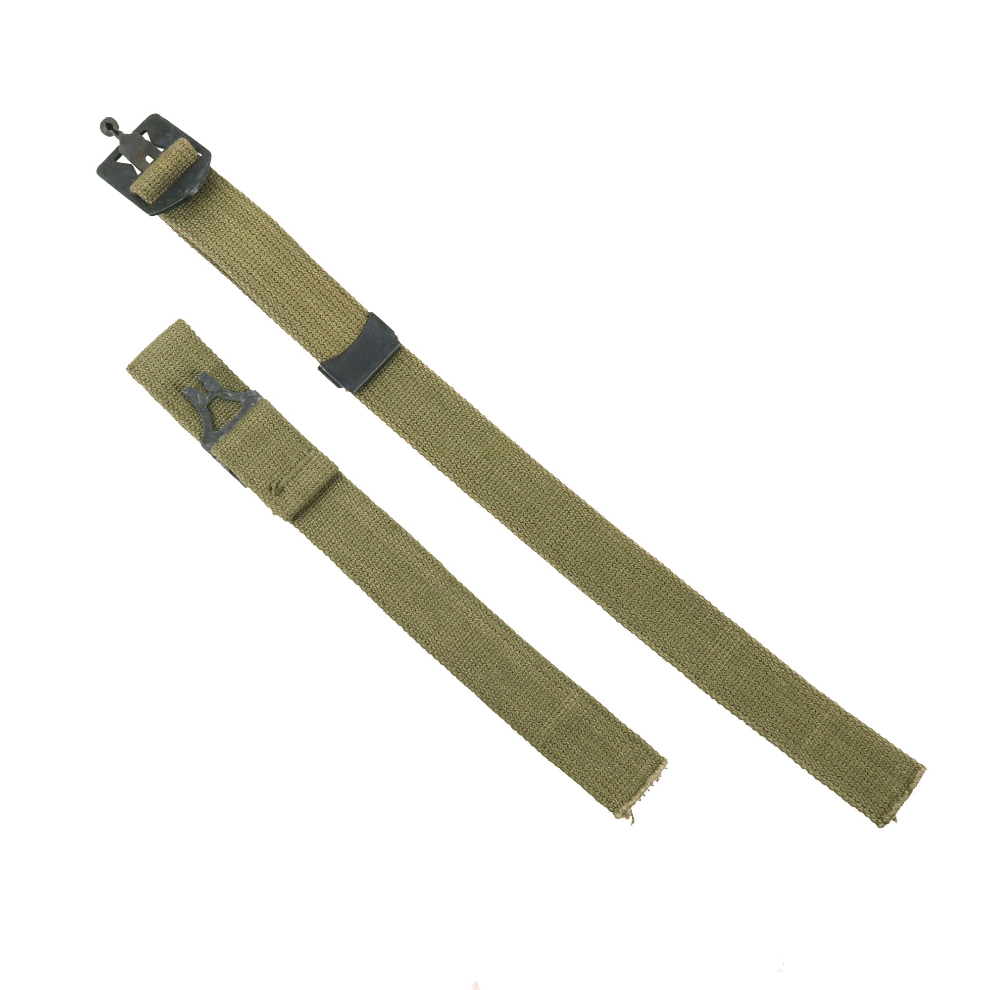 The chinstraps come in two pieces and connect as shown. All examples connect well and the only staining present is a small bit from oxidation of the fittings. These chinstraps are near impossible to find on their own in original condition like this, making it a perfect example for your WWII M1 helmet missing a strap.