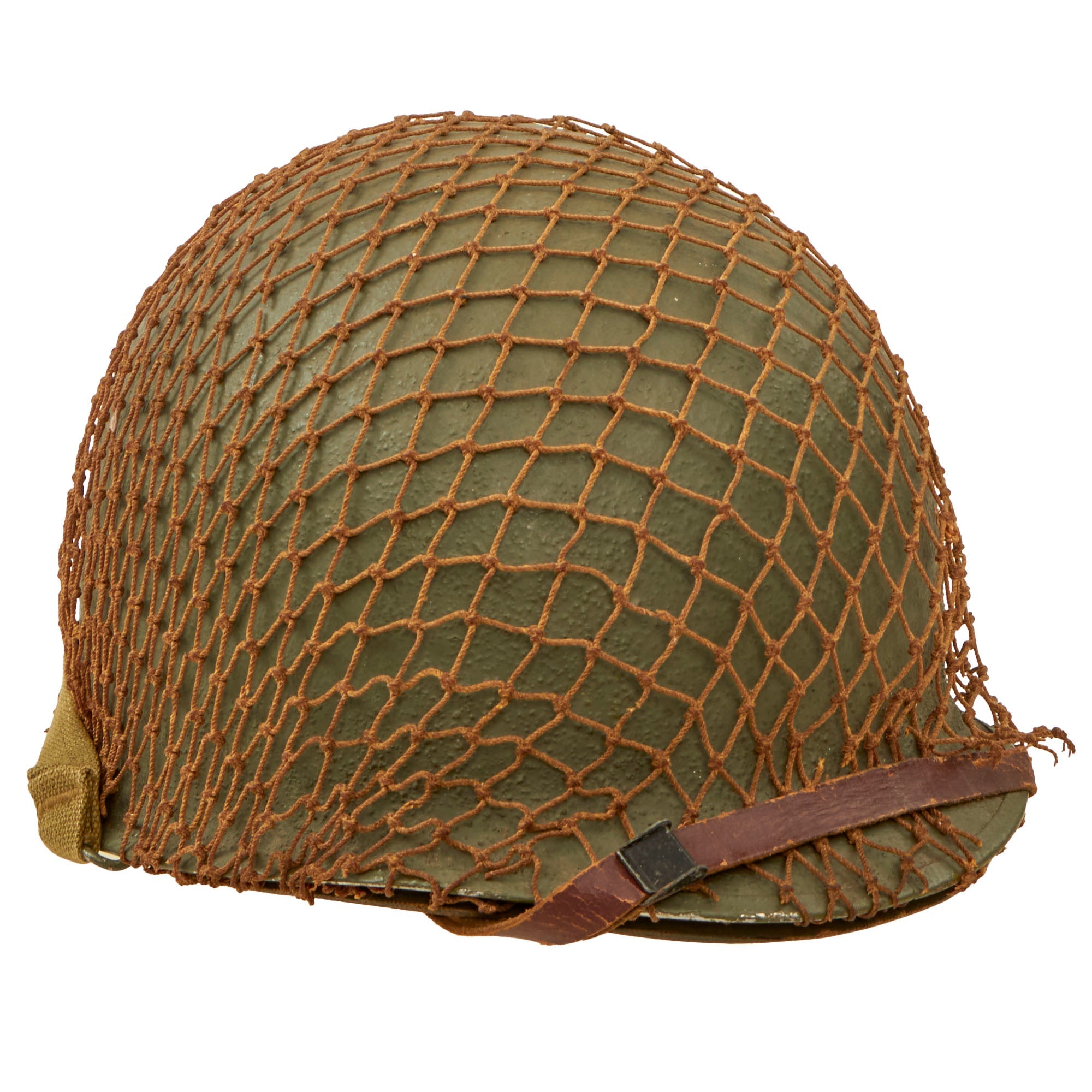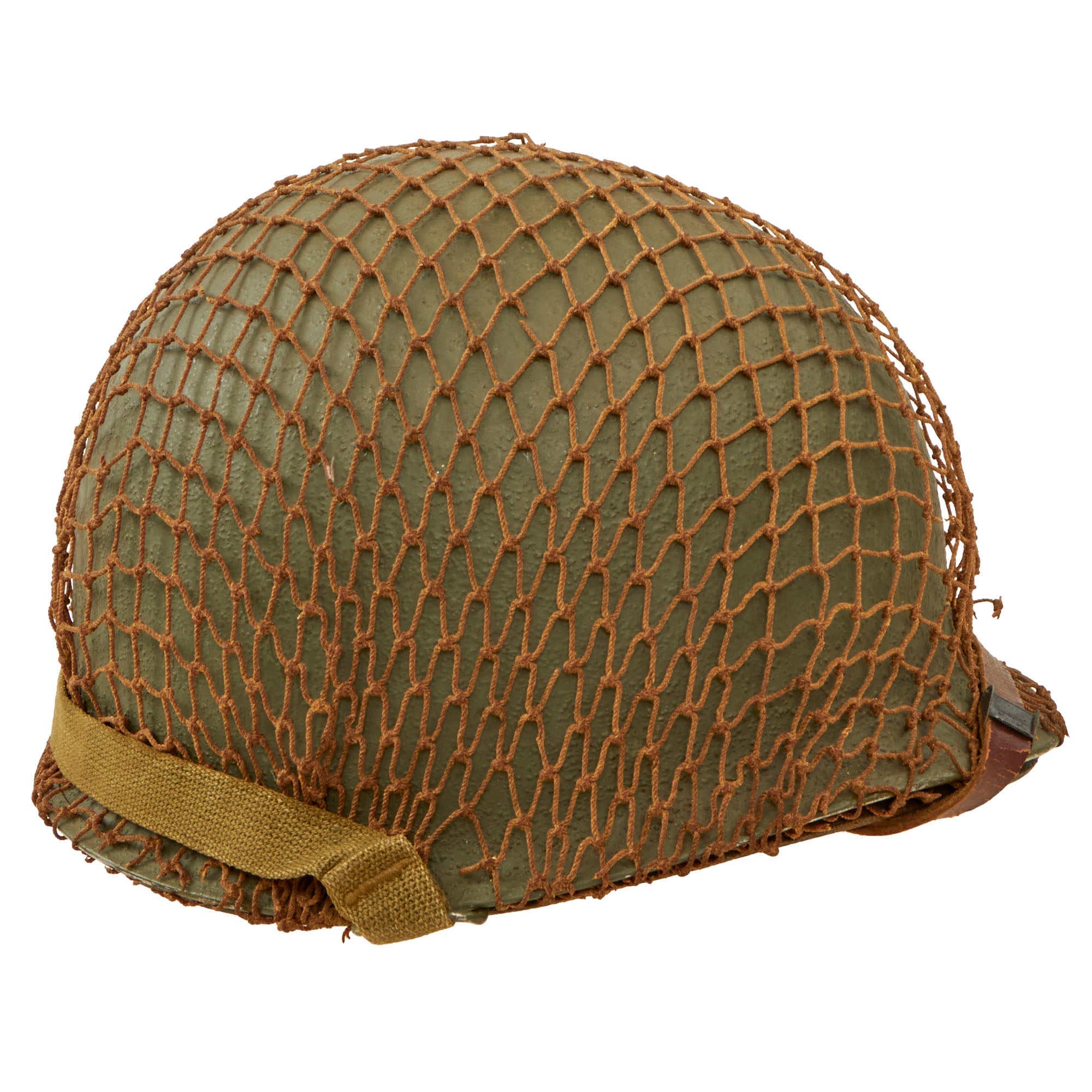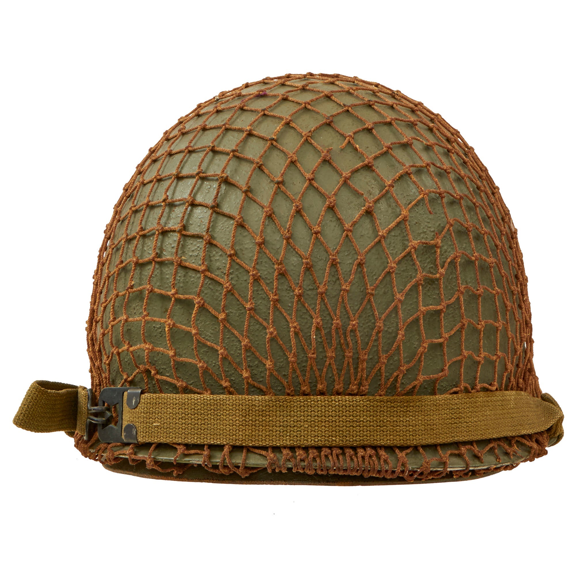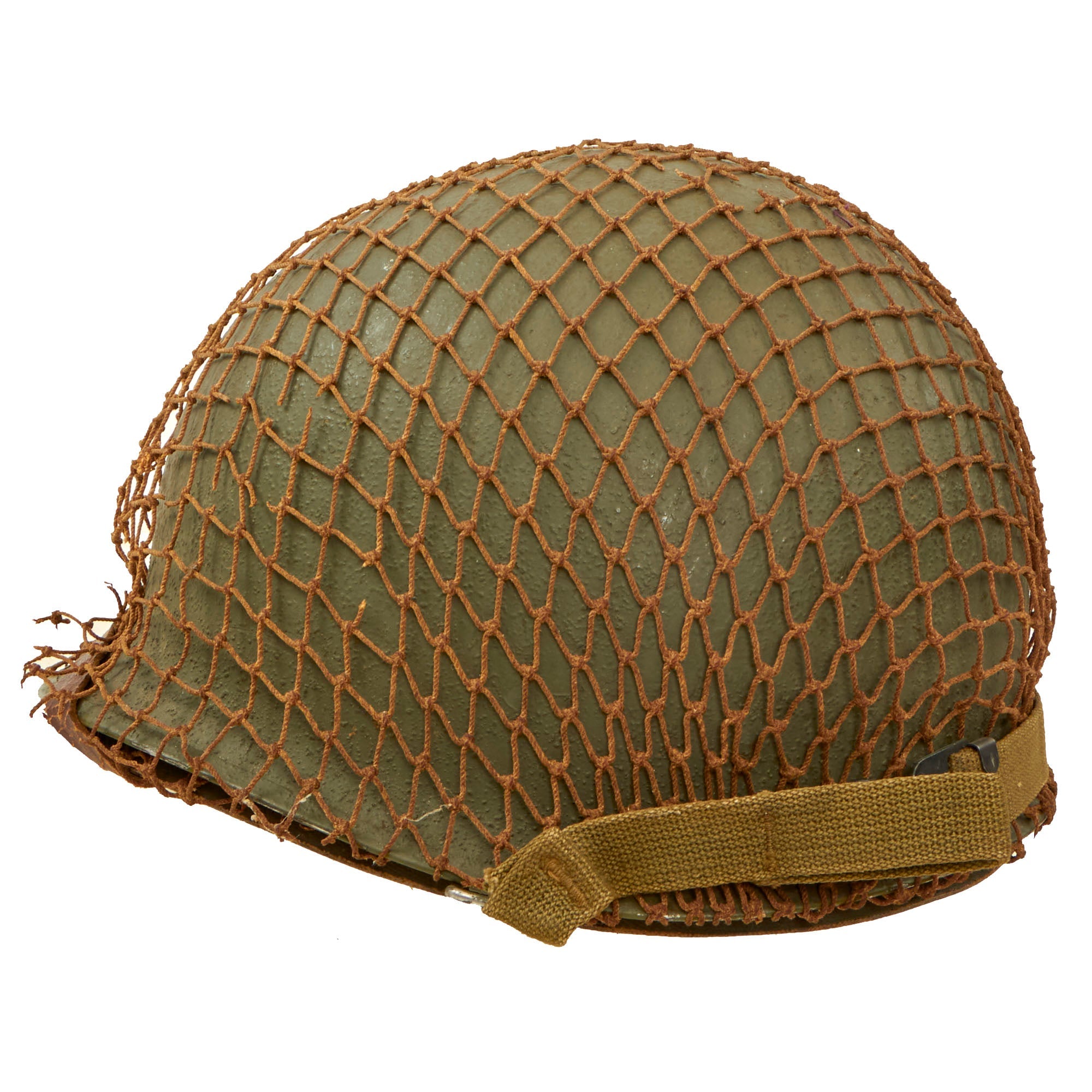 The U.S. WWII M-1 helmet was only produced from 1941 to 1945. The first production batch resulted with over 323,510 M-1 helmets before the start of the American involvement in the war. This helmet is heat-lot stamped 813?, which indicates a mid-war manufacture date.