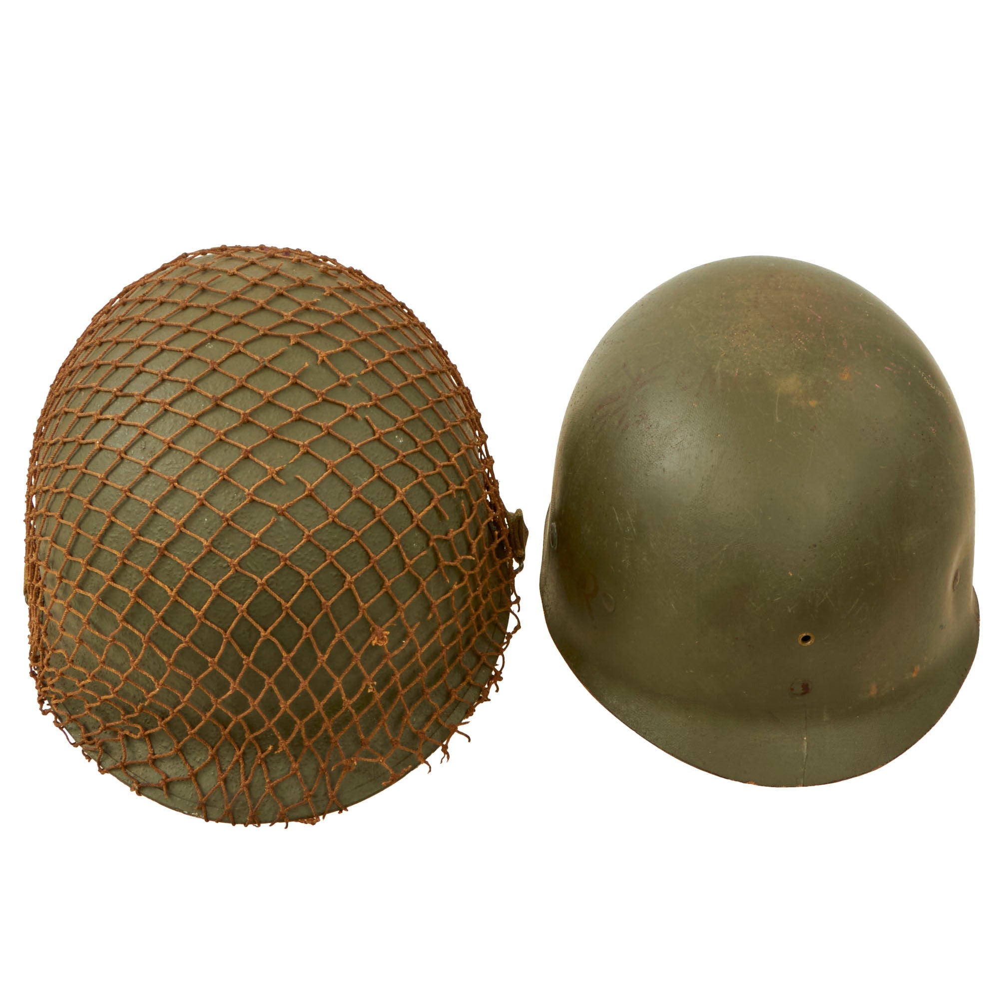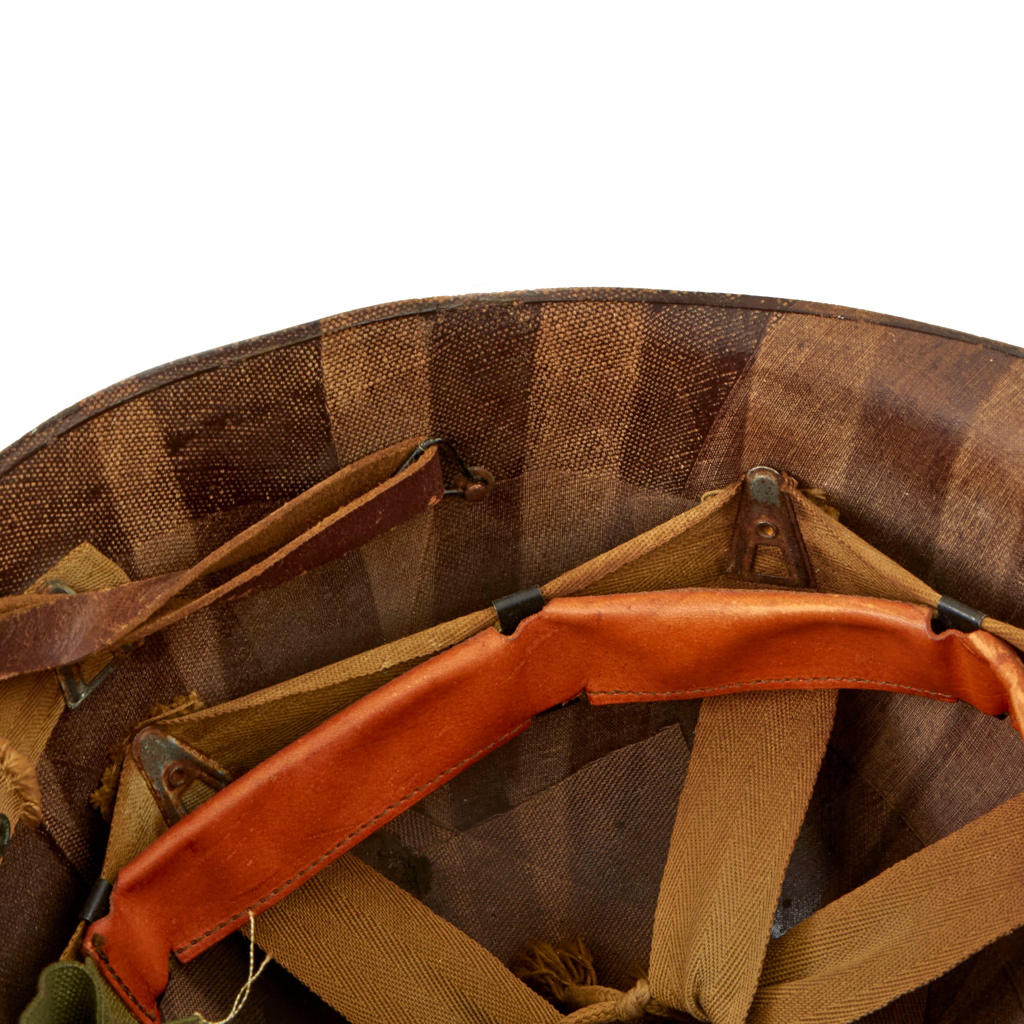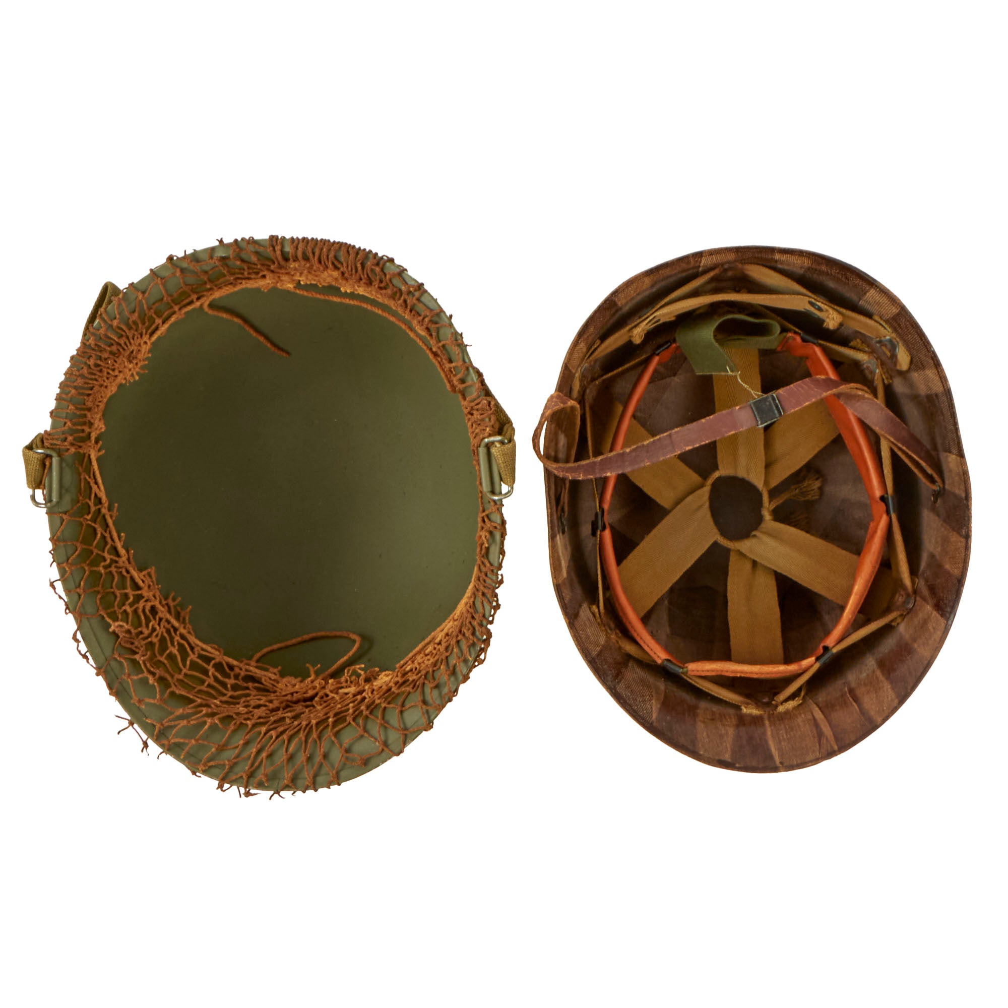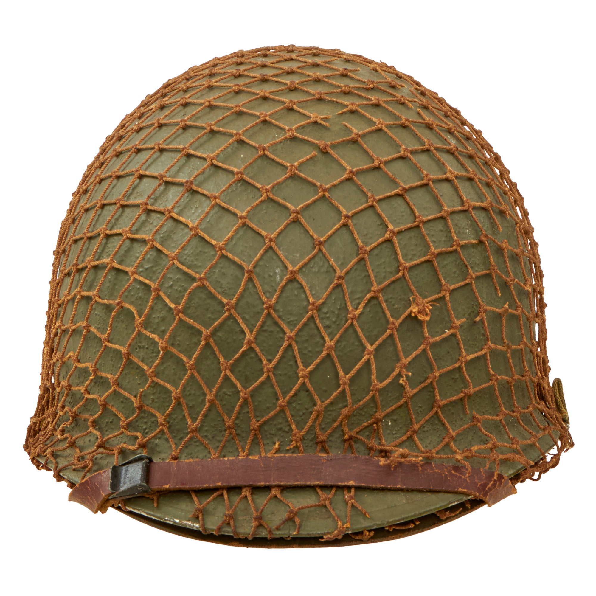 The U.S. WWII M-1 helmet was only produced from 1941 to 1945. The first production batch resulted with over 323,510 M-1 helmets before the start of the American involvement in the war. This helmet is heat-lot stamped 813?, which indicates a mid-war manufacture date.