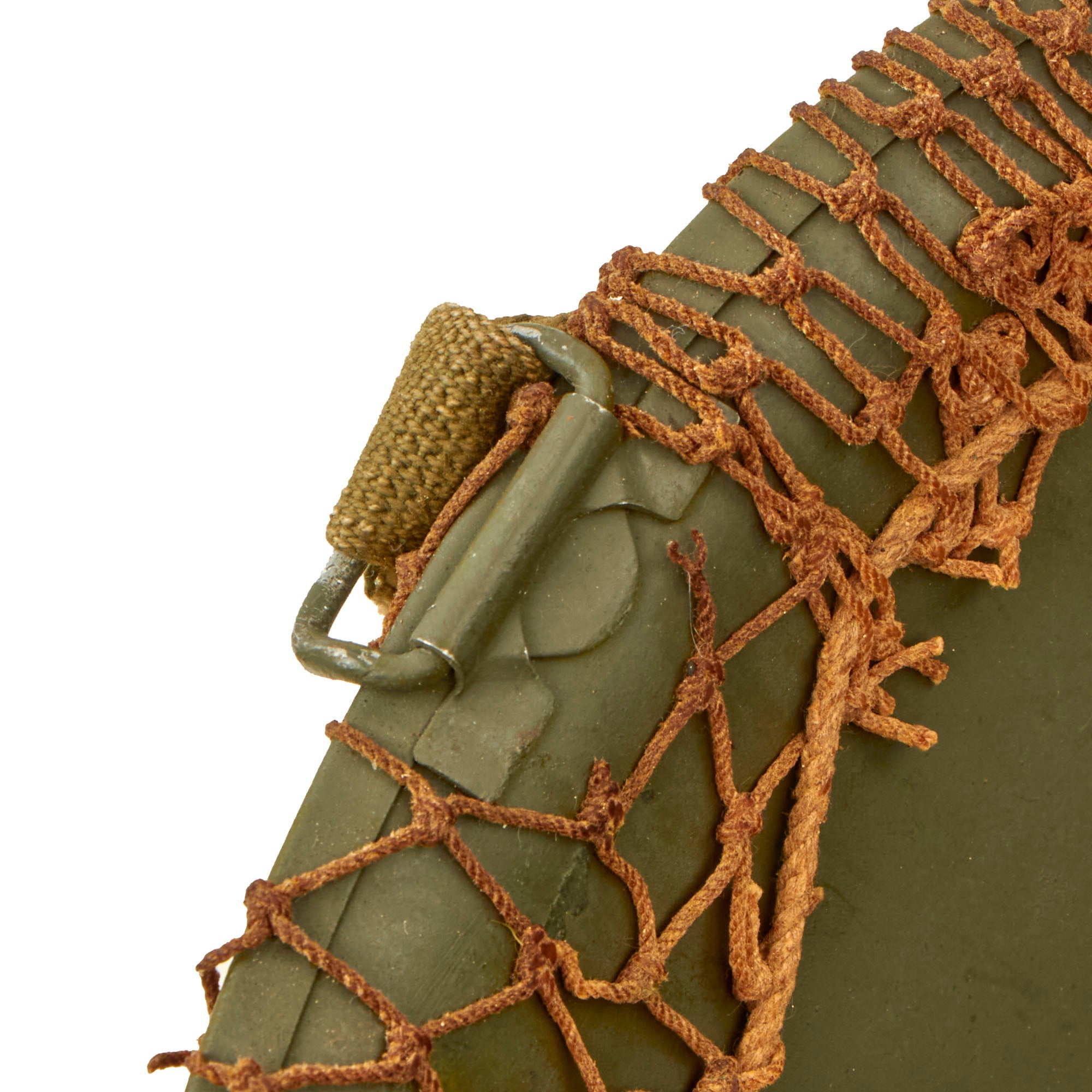 This true US WWII M-1 helmet liner can be identified through the frontal eyelet hole. Other correct WWII features include OD Green #3 cotton herringbone twill (HBT) cloth suspension liner, with the webbing in good condition. This HBT suspension is held tightly within the M-1 helmet liner by rivets and a series of triangular "A" washers. The three upper suspension bands are joined together with the correct OD green string. This way the wearer could adjust the fit. The sweatband is a later replacement with green fabric. The liner chinstrap is original and shows heavy cracking.