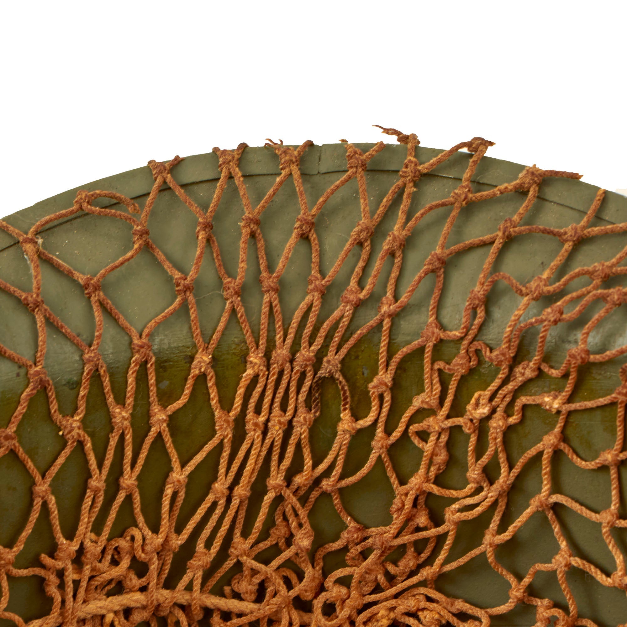 The original helmet net is in heavily sticky and stiffened condition, with the netting breaking to the touch. There are breaks in the netting in several spots. It has certainly been with this helmet for a very long time and should be properly cared for.
