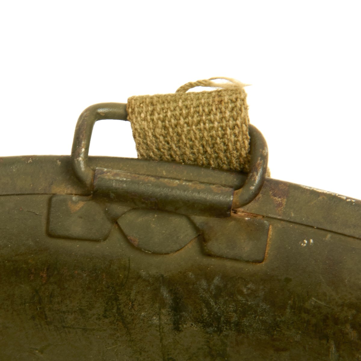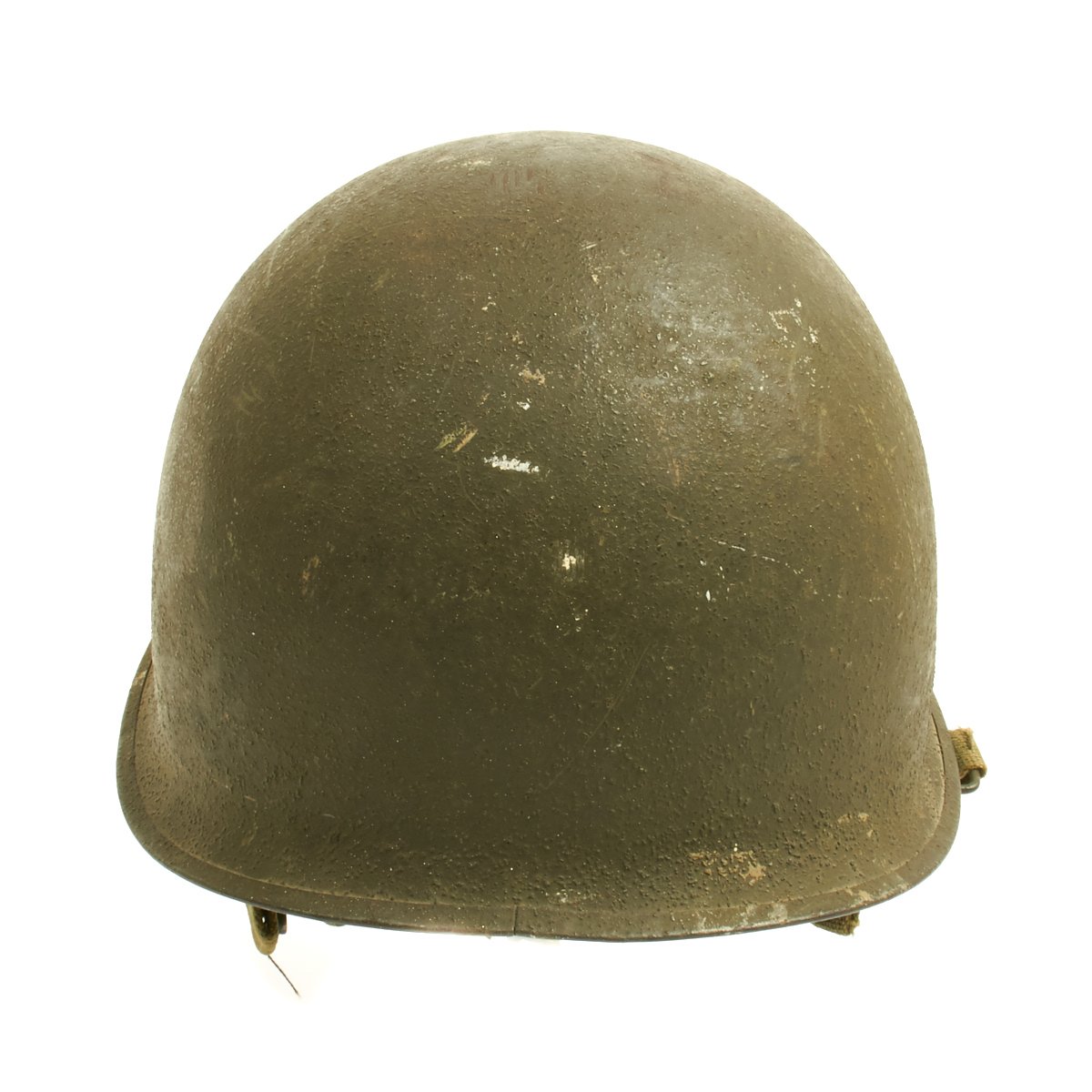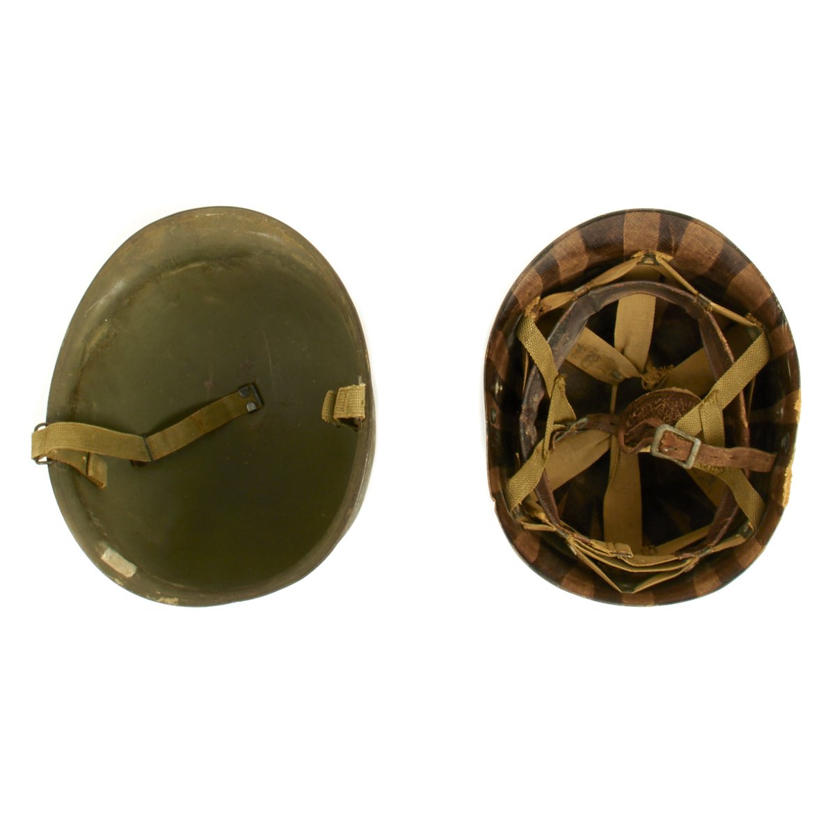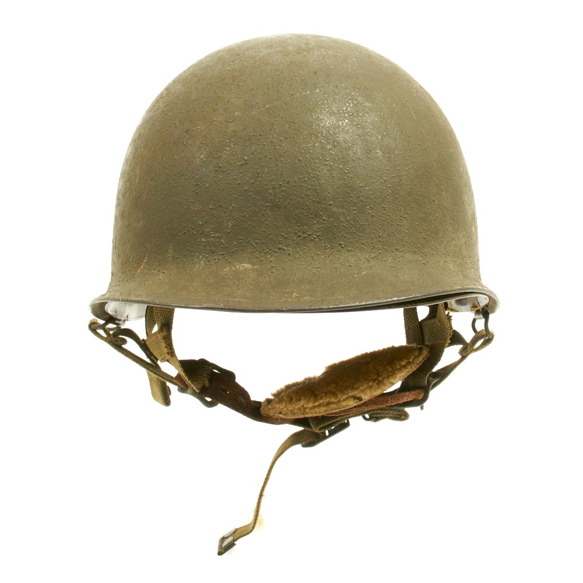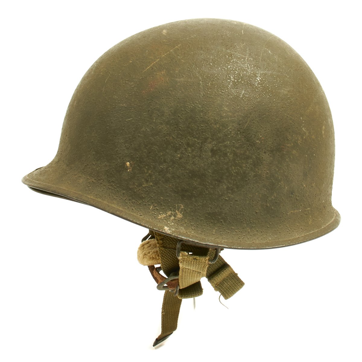 The M-1 helmet retains it's original cork grain paint and swivel bale chinstrap loops. It also has original shuttle loom sewn chinstraps set with original hardware and snaps. The shell is marked 1179A indicating it was manufactured by the McCord Radiator and Manufacturing Company of Detroit Michigan in September, 1944.