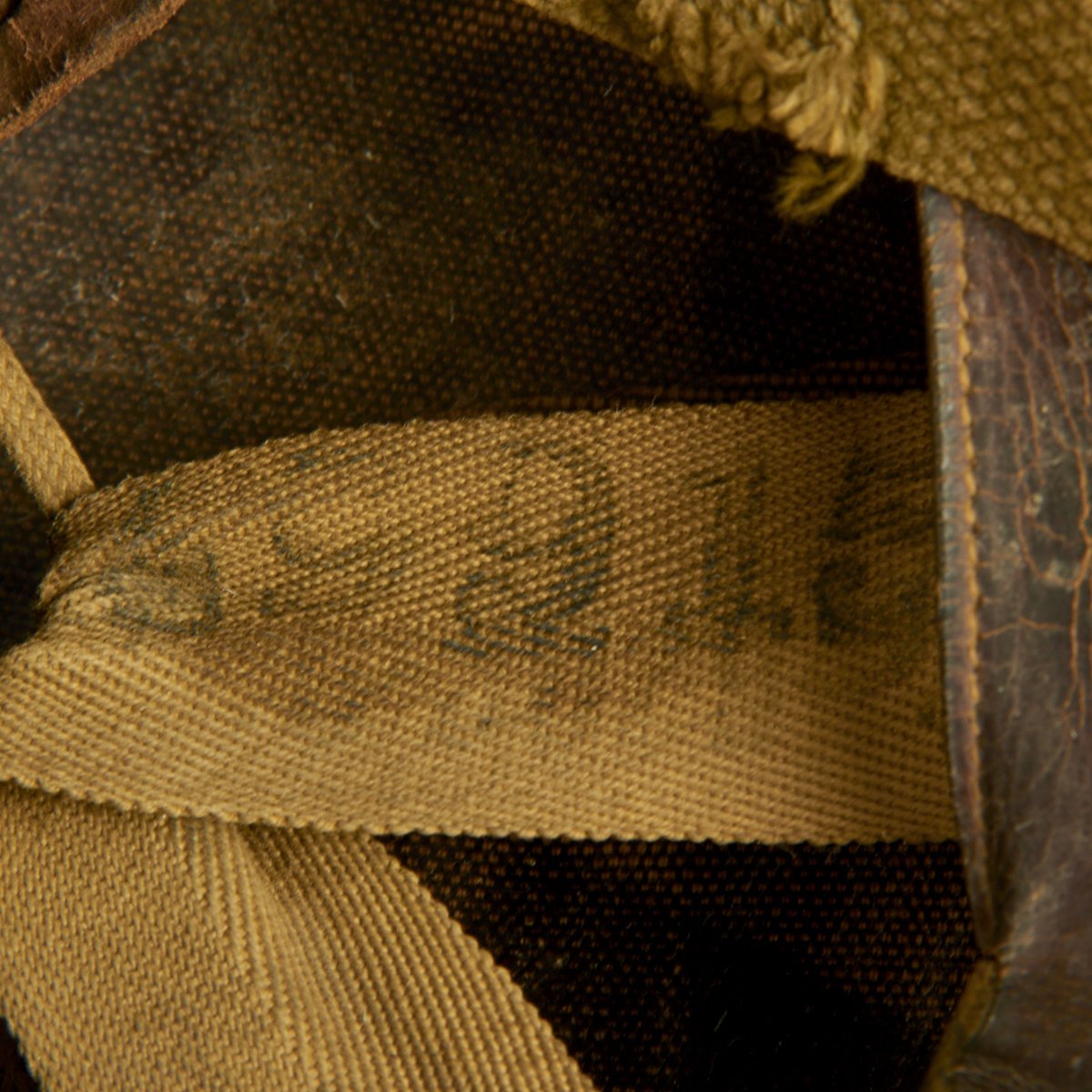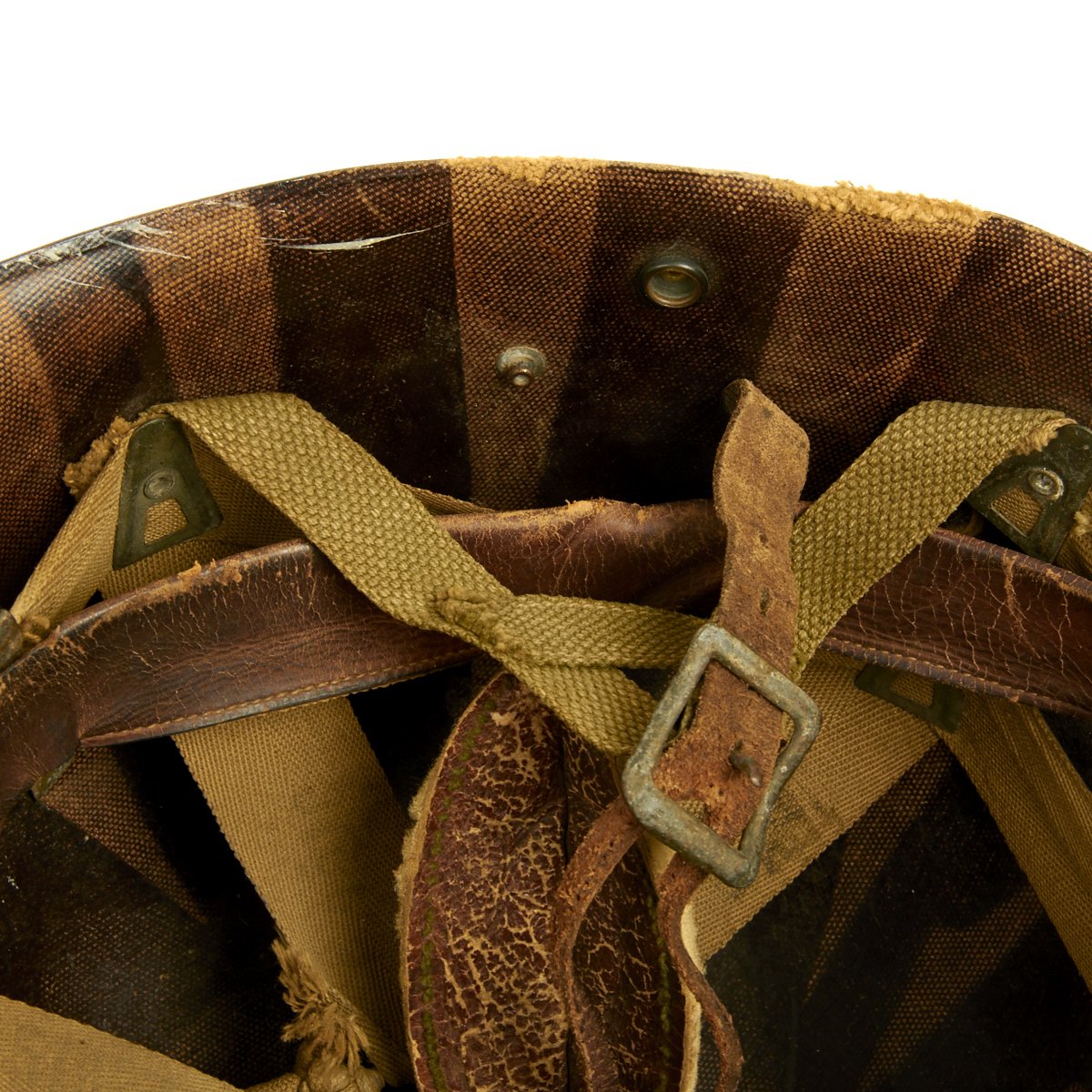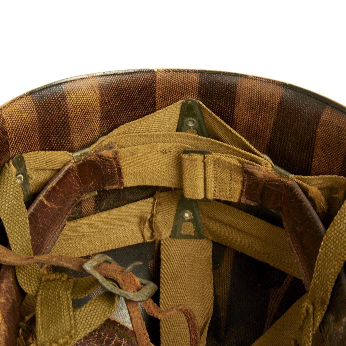 The M-1 liner provided with this helmet has an original suspension liner made to airborne specifications. It has original HBT cloth suspension (which includes): upper suspension, lace cord, back-strap, nape strap, sweatband, internal airborne snaps, leather liner chinstrap, shuttle loomed A straps with with original brass wire buckles. The chin cup is a fleece lined variation and while and solid, some stitching has popped.
