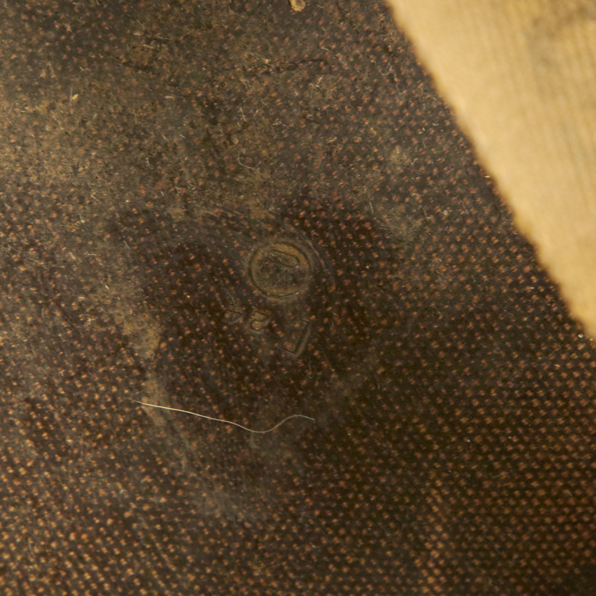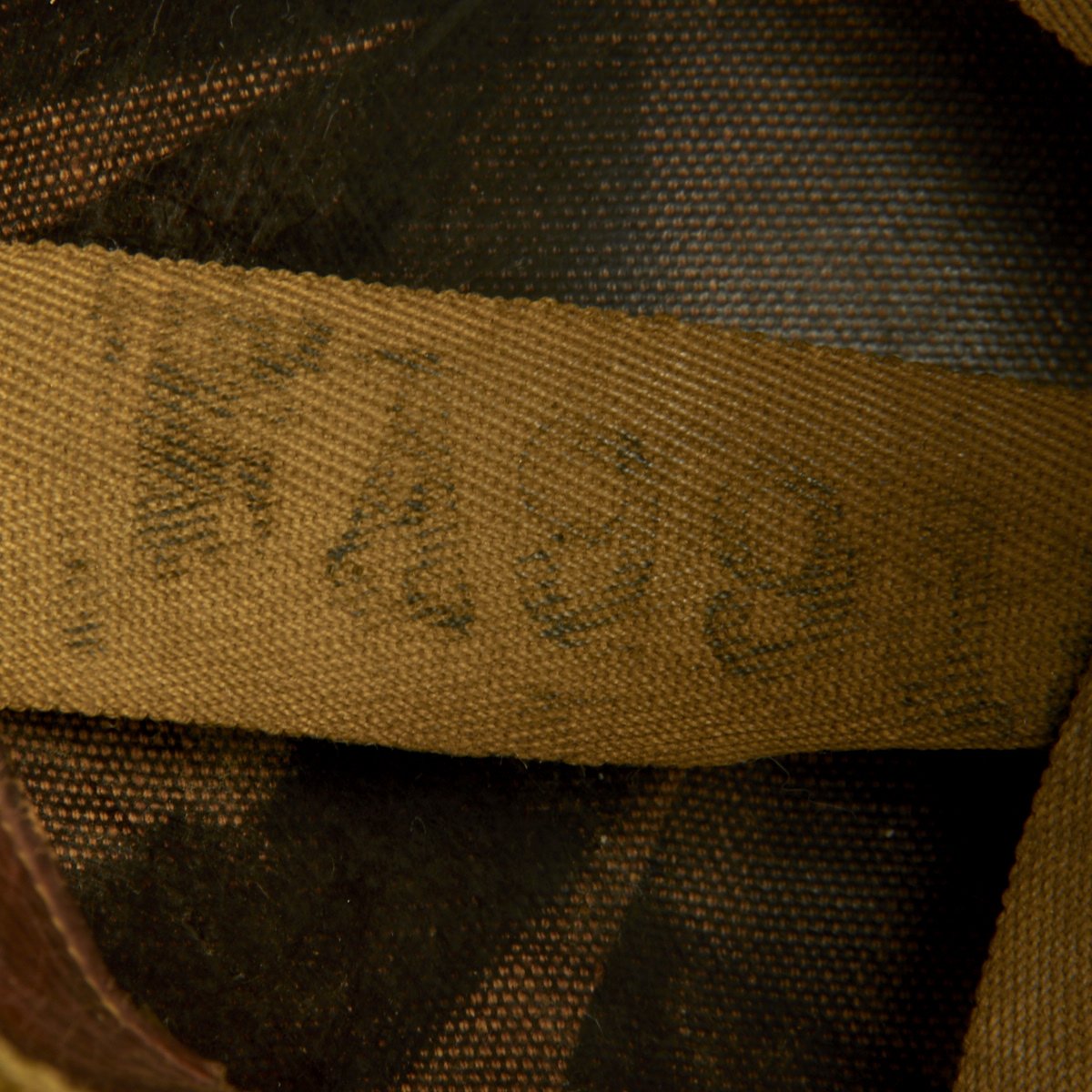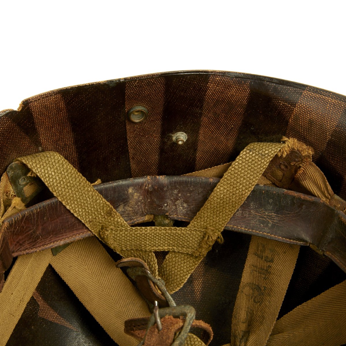 The M-1 liner provided with this helmet has an original suspension liner made to airborne specifications. It has original HBT cloth suspension (which includes): upper suspension, lace cord, back-strap, nape strap, sweatband, internal airborne snaps, leather liner chinstrap, shuttle loomed A straps with with original brass wire buckles. The chin cup is a fleece lined variation and while and solid, some stitching has popped.