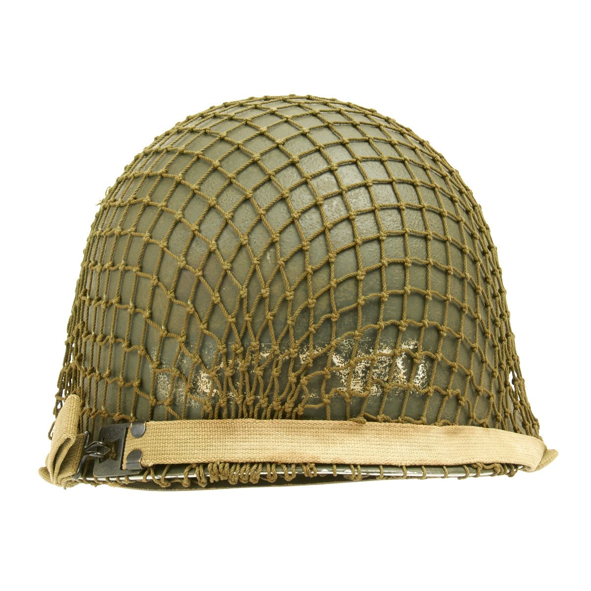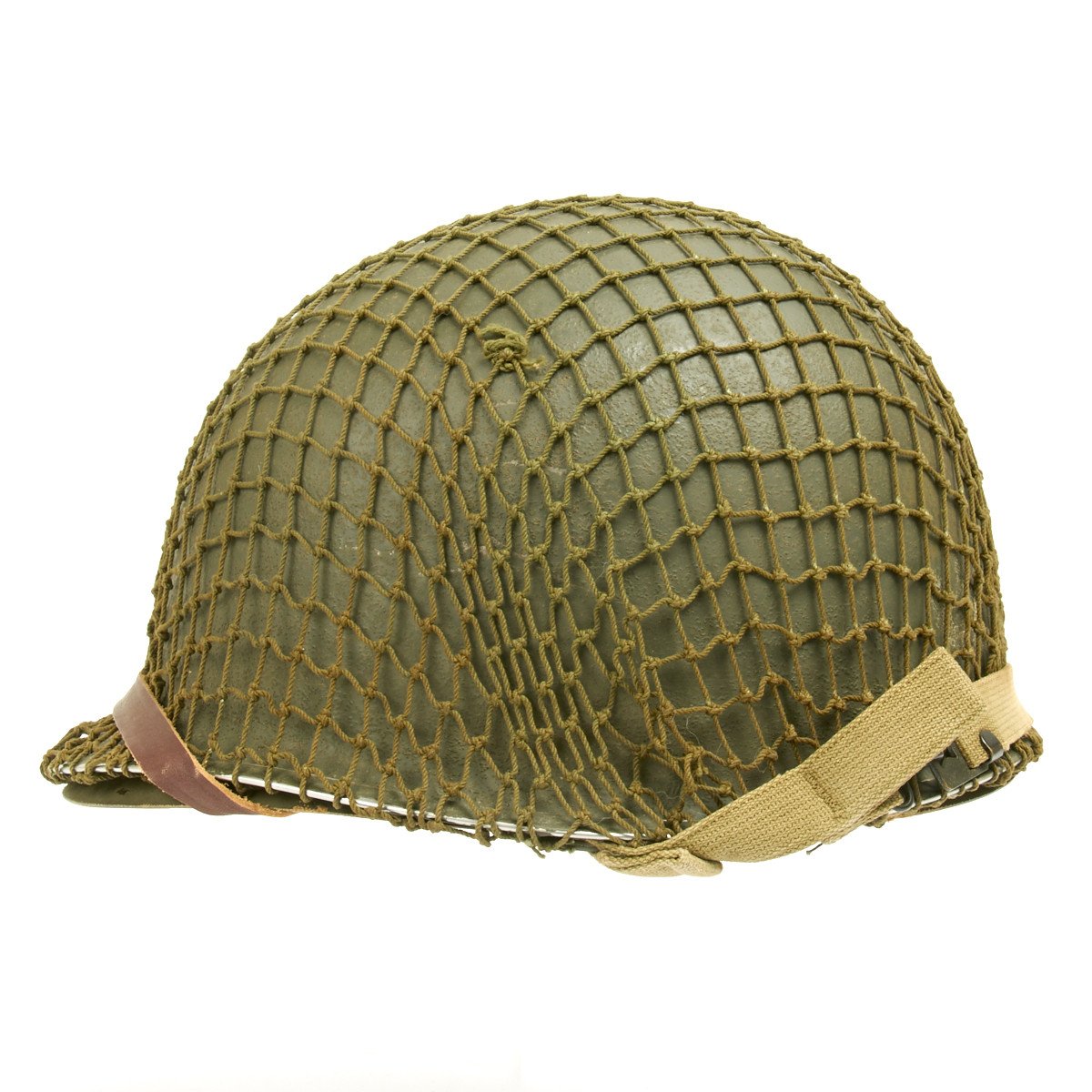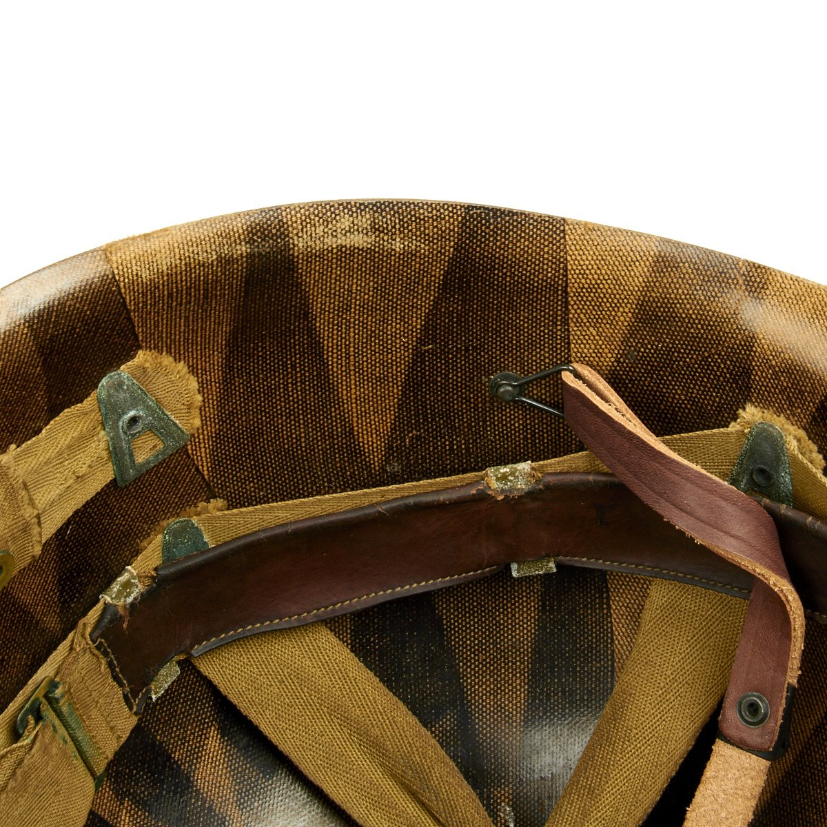 This rare early production helmet is a fine example and still retains all of its original WW2 parts and paint (with exception of shell chinstrap). The steel shell is stamped 43A alomg with a large S indicating Schlueter manufacture and dating from 1943. M-1 helmet shell has an stainless steel rim with seam in the front. Stainless steel rims were both rust resistant and had "non-magnetic qualities" that reduced the chance of error readings when placed around certain sensitive equipment (such as a compass). This helmet features the correct front seam rim and early production swivel bales.