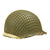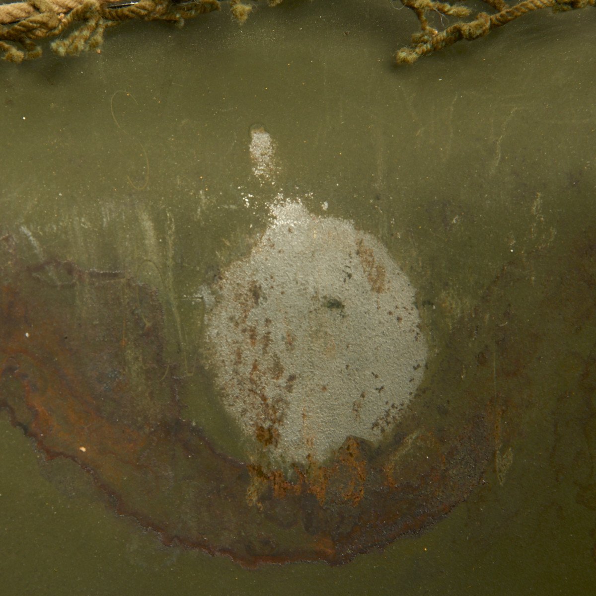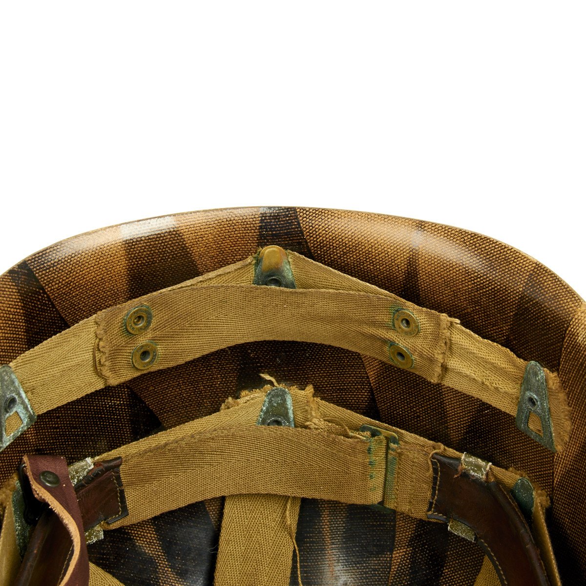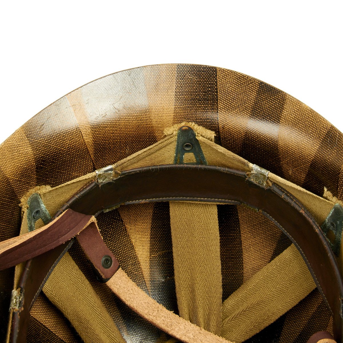 This rare early production helmet is a fine example and still retains all of its original WW2 parts and paint (with exception of shell chinstrap). The steel shell is stamped 43A alomg with a large S indicating Schlueter manufacture and dating from 1943. M-1 helmet shell has an stainless steel rim with seam in the front. Stainless steel rims were both rust resistant and had "non-magnetic qualities" that reduced the chance of error readings when placed around certain sensitive equipment (such as a compass). This helmet features the correct front seam rim and early production swivel bales.