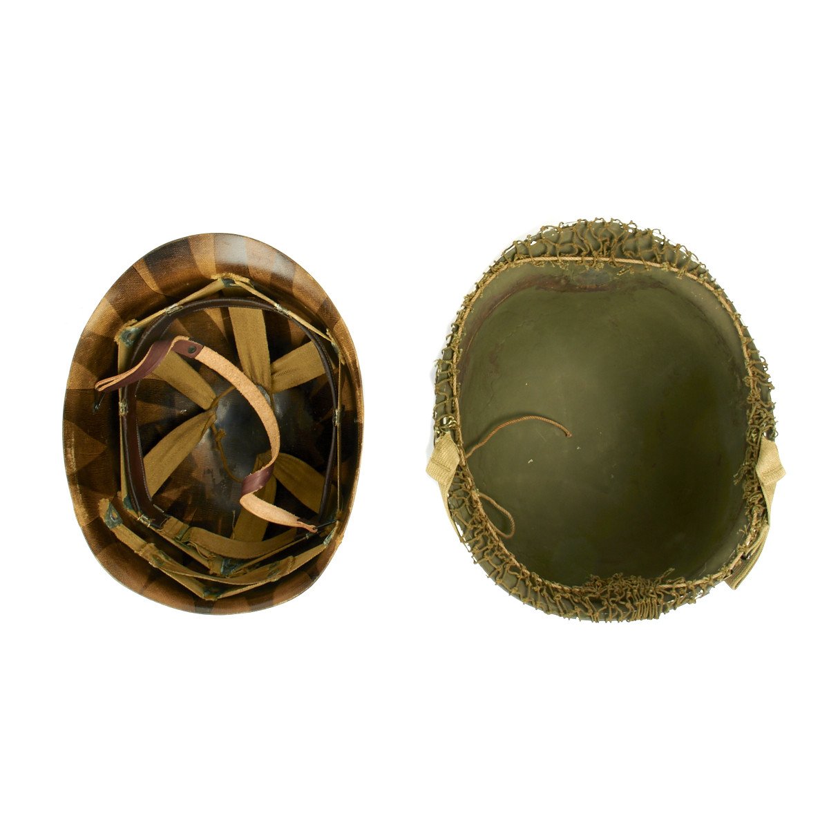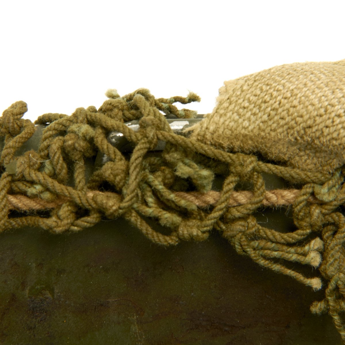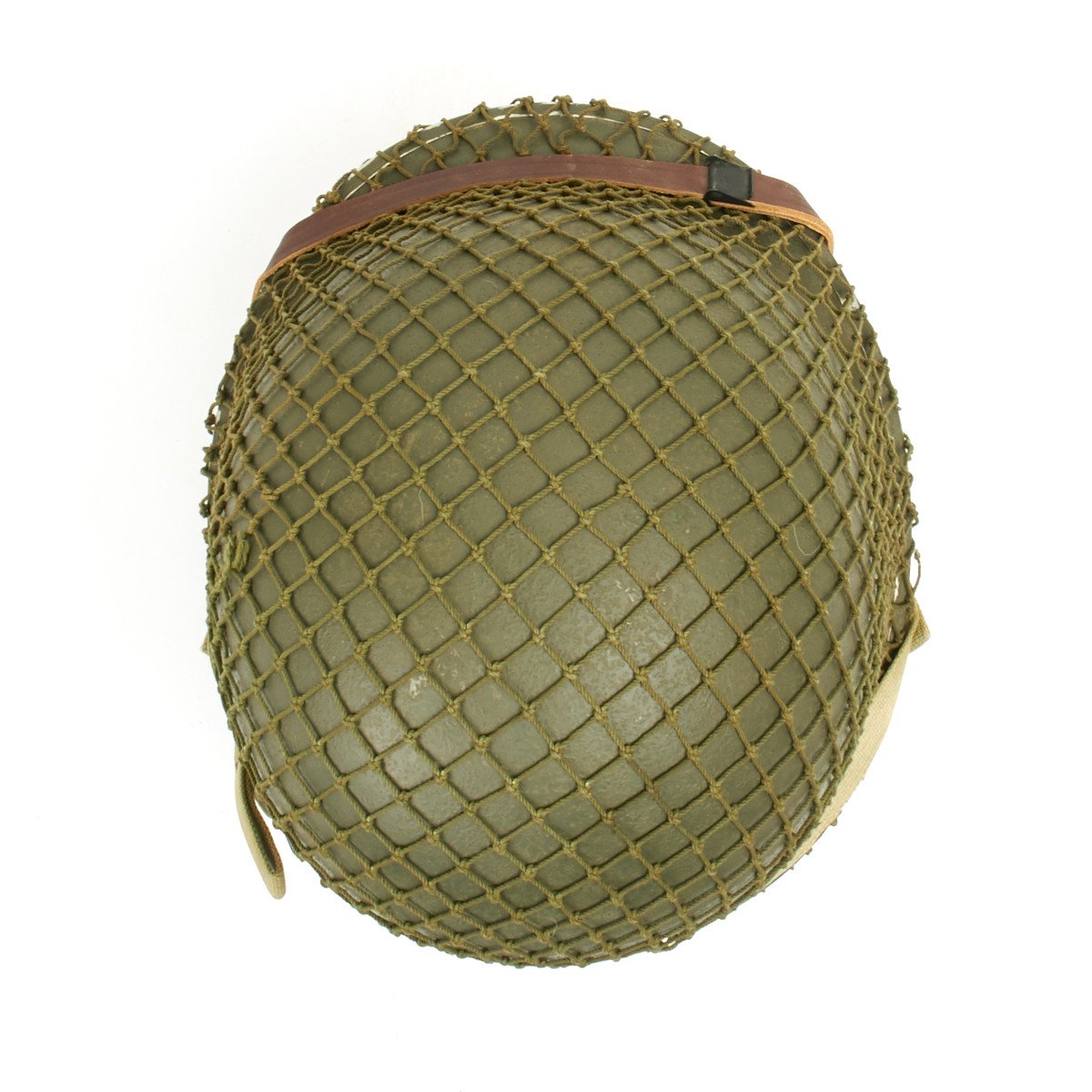 A true US WWII M-1 helmet liner can usually be identified through the frontal eyelet hole. Other correct WW2 features include cotton herringbone twill (HBT) cloth suspension. This HBT suspension is held tightly within the M-1 helmet liner by rivets and a series of triangular "A" washers. The three upper suspension bands are joined together with a shoestring. This way the wearer could adjust the fit. All parts of this liner are original WWII manufacture and appear to be NOS! Also included is a genruine WW2 helemnt net.