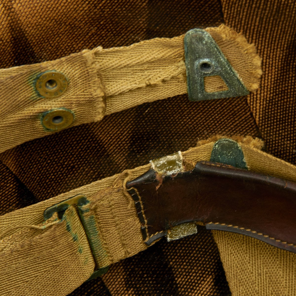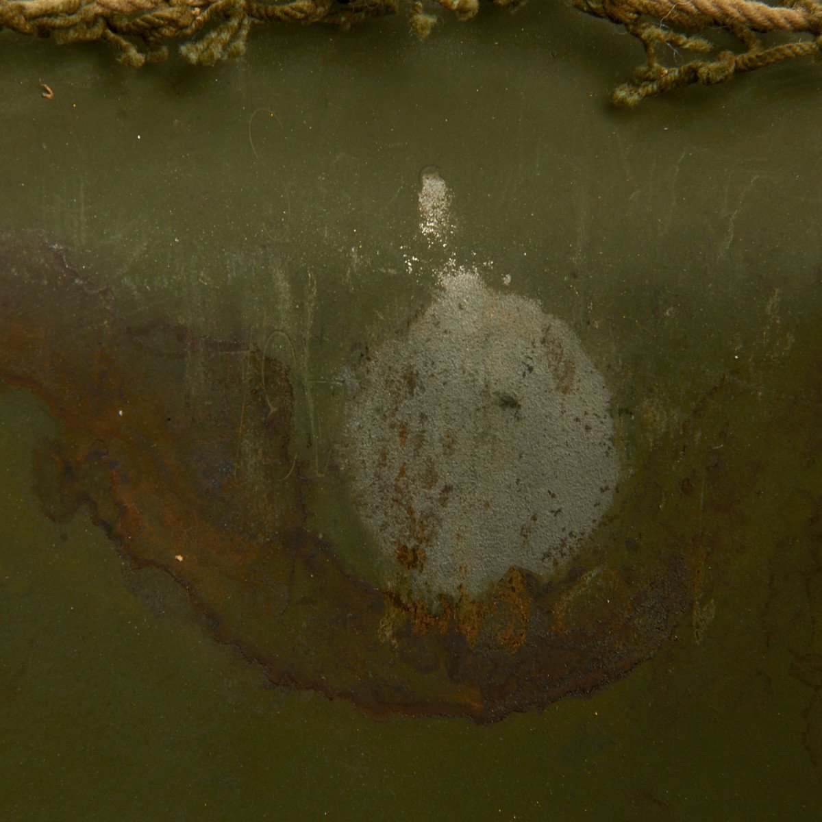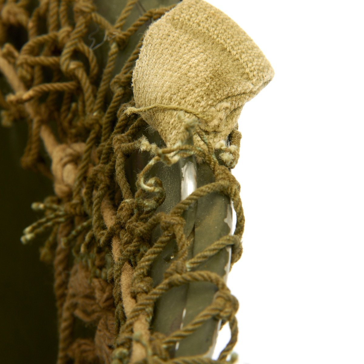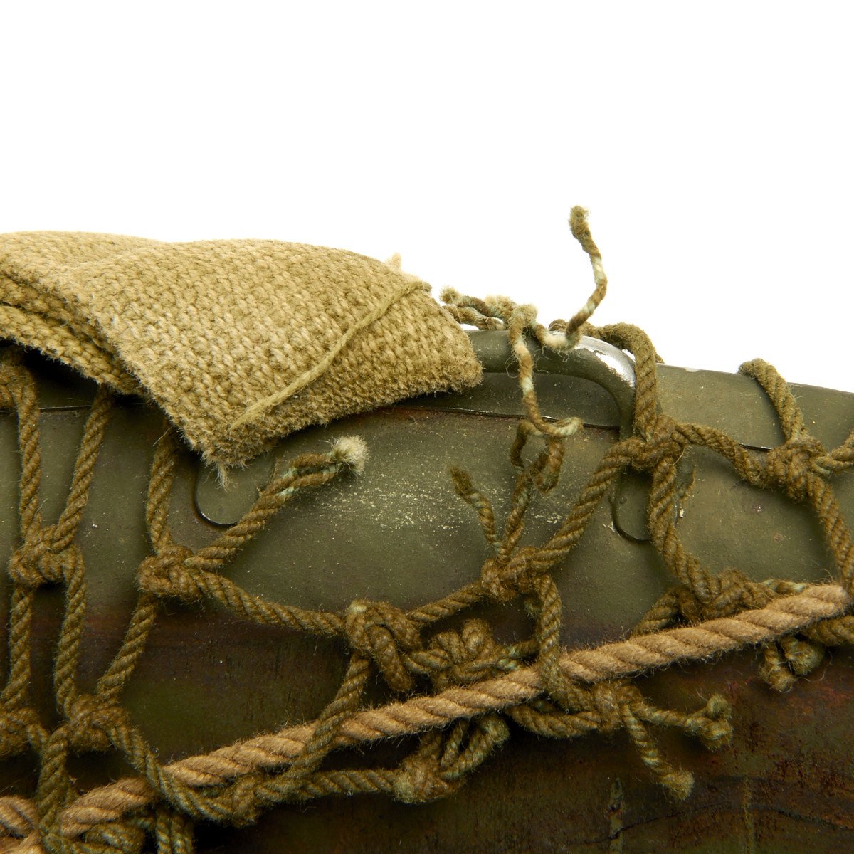 A true US WWII M-1 helmet liner can usually be identified through the frontal eyelet hole. Other correct WW2 features include cotton herringbone twill (HBT) cloth suspension. This HBT suspension is held tightly within the M-1 helmet liner by rivets and a series of triangular "A" washers. The three upper suspension bands are joined together with a shoestring. This way the wearer could adjust the fit. All parts of this liner are original WWII manufacture and appear to be NOS! Also included is a genruine WW2 helemnt net.