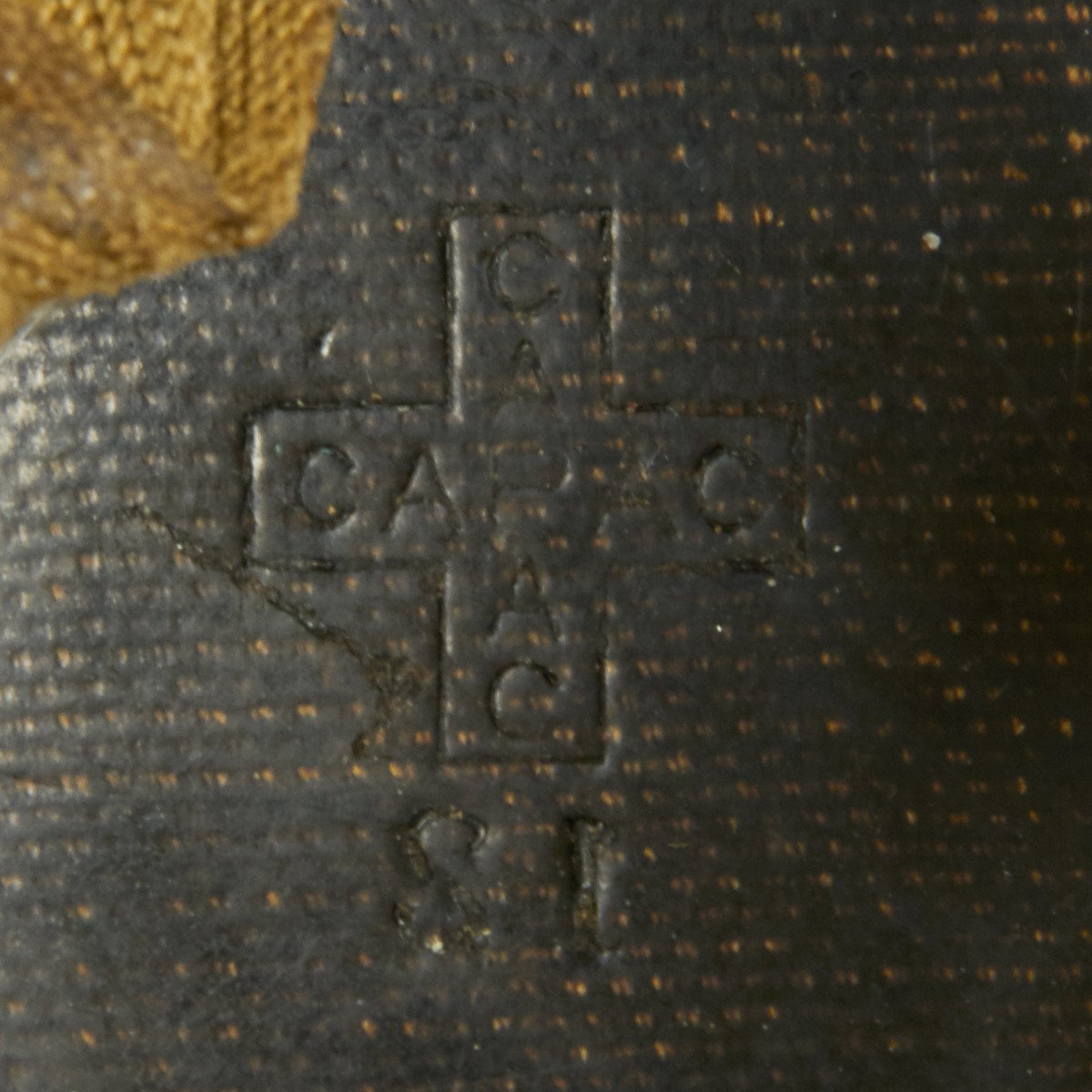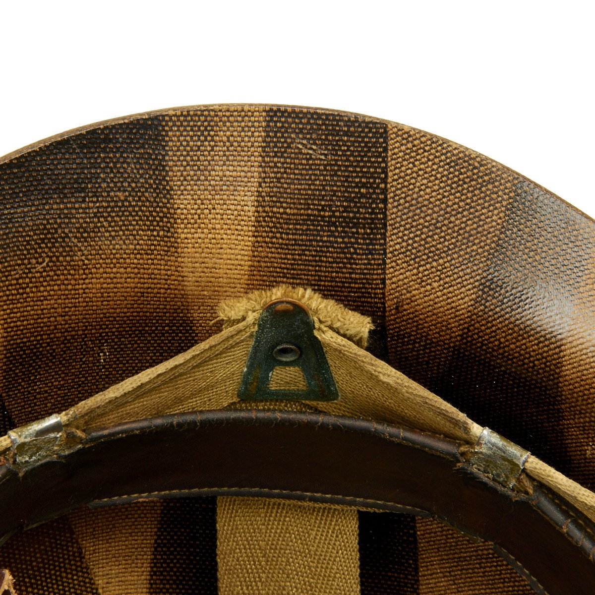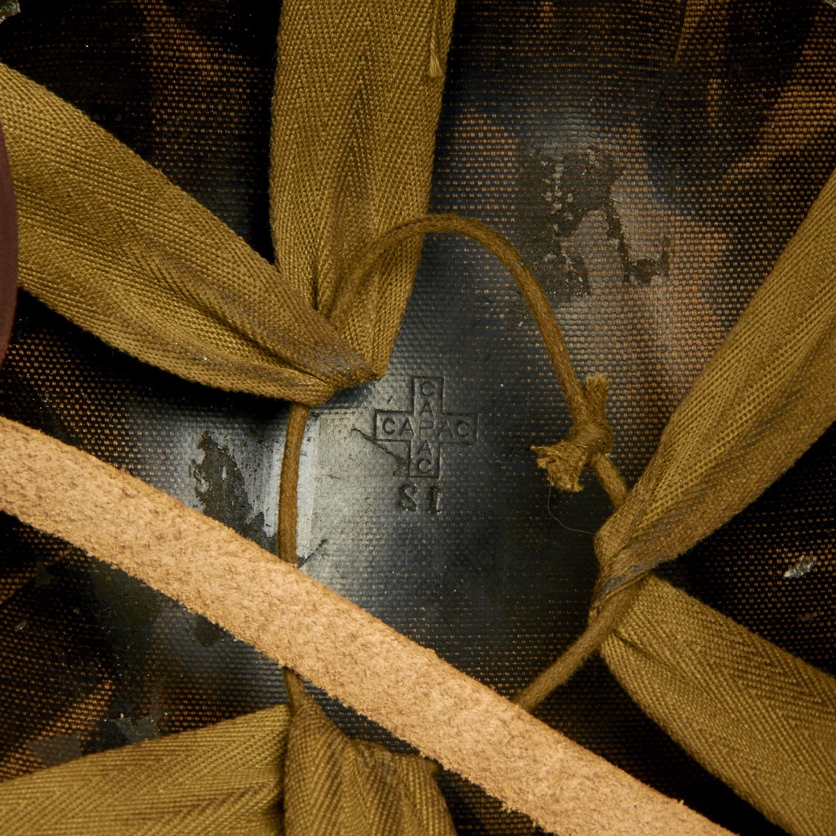 The liner is correct high pressure WWII issue and stamped with the Capac Manufacturing Company logo with frontal eyelet. Manufactured in Capac, Michigan this high pressure manufactured M-1 helmet liner is identified by an embossed cross with the words Capac in the crown. Capac Manufacturing Company started M-1 helmet liner delivery to the US Army in September 1942. They produced approximately between 2,000,000 4,000,000 M-1 helmet liners and discontinued production around August 17 1945 when the war ended.