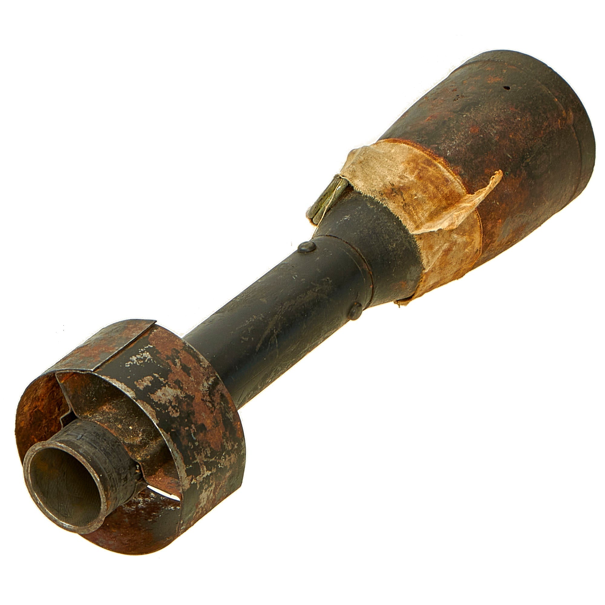 This is a nice WWII M11 Practice Rifle Grenade, which was the practice version of the M9 anti-tank grenade. It consists of a cast iron head and a sheet metal tail assembly. The M9 was the first U.S. anti-tank grenade. Although it used a shape charge warhead, the nose mounted impact fuze reduced its effectiveness. This also had problems with reliable detonation. These were only produced for about two years after its introduction in 1940. Measures approximately 9.2" long and 2" in diameter.