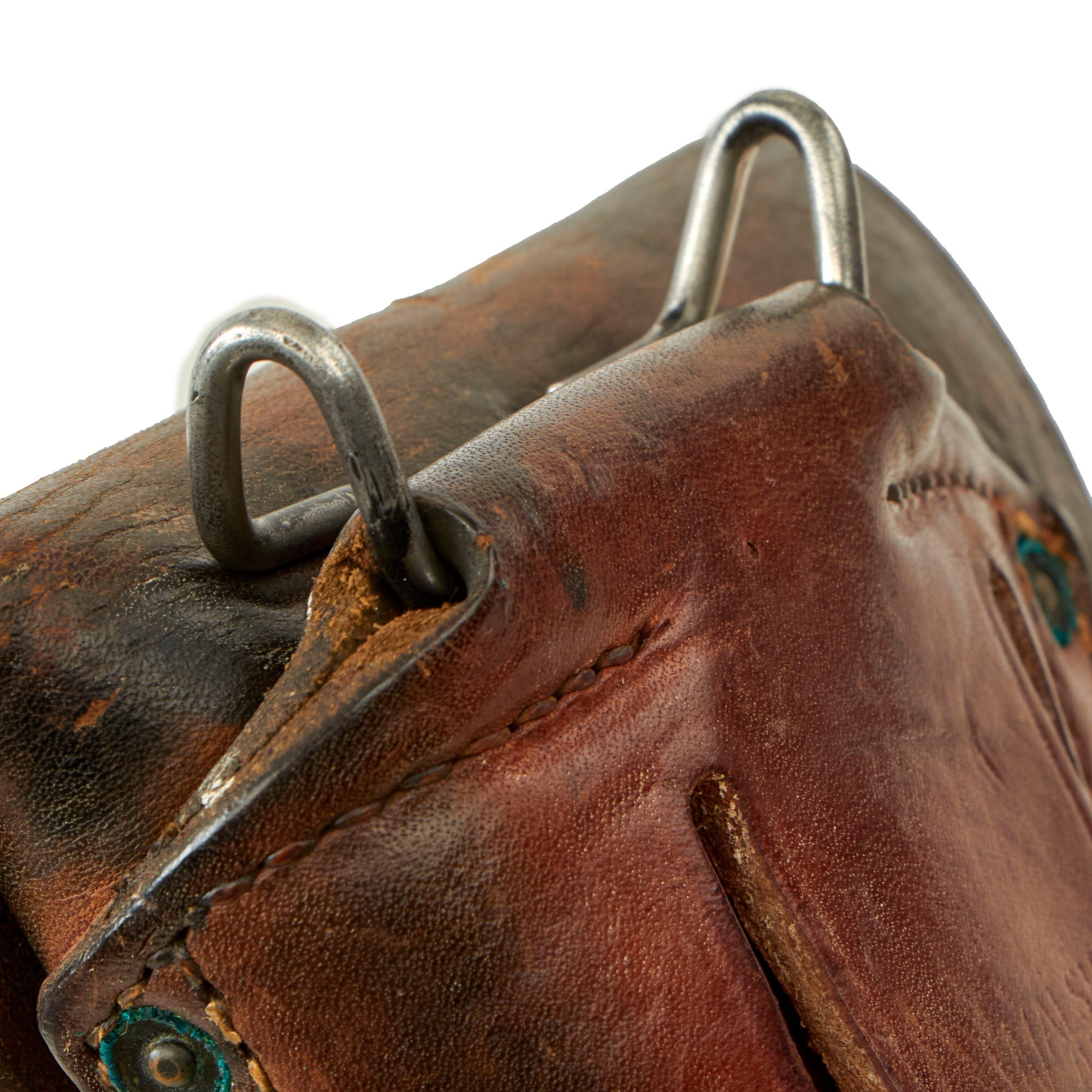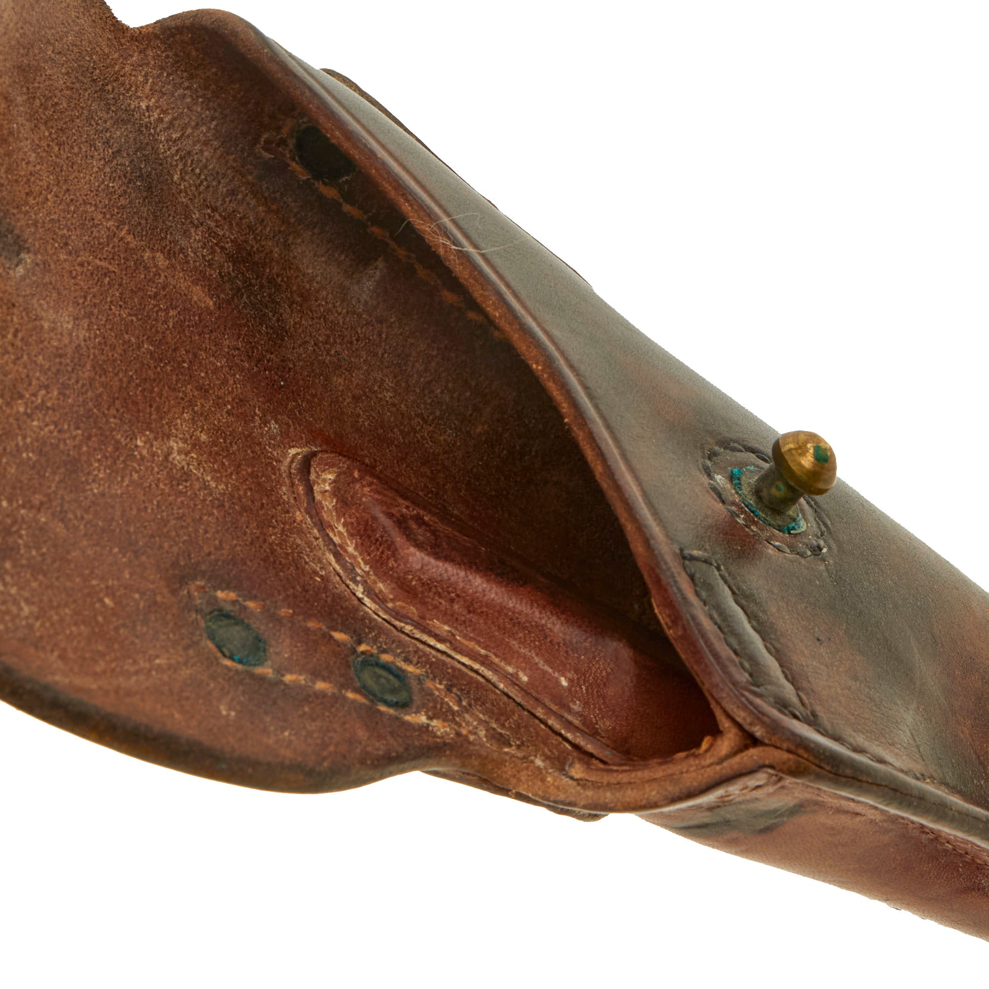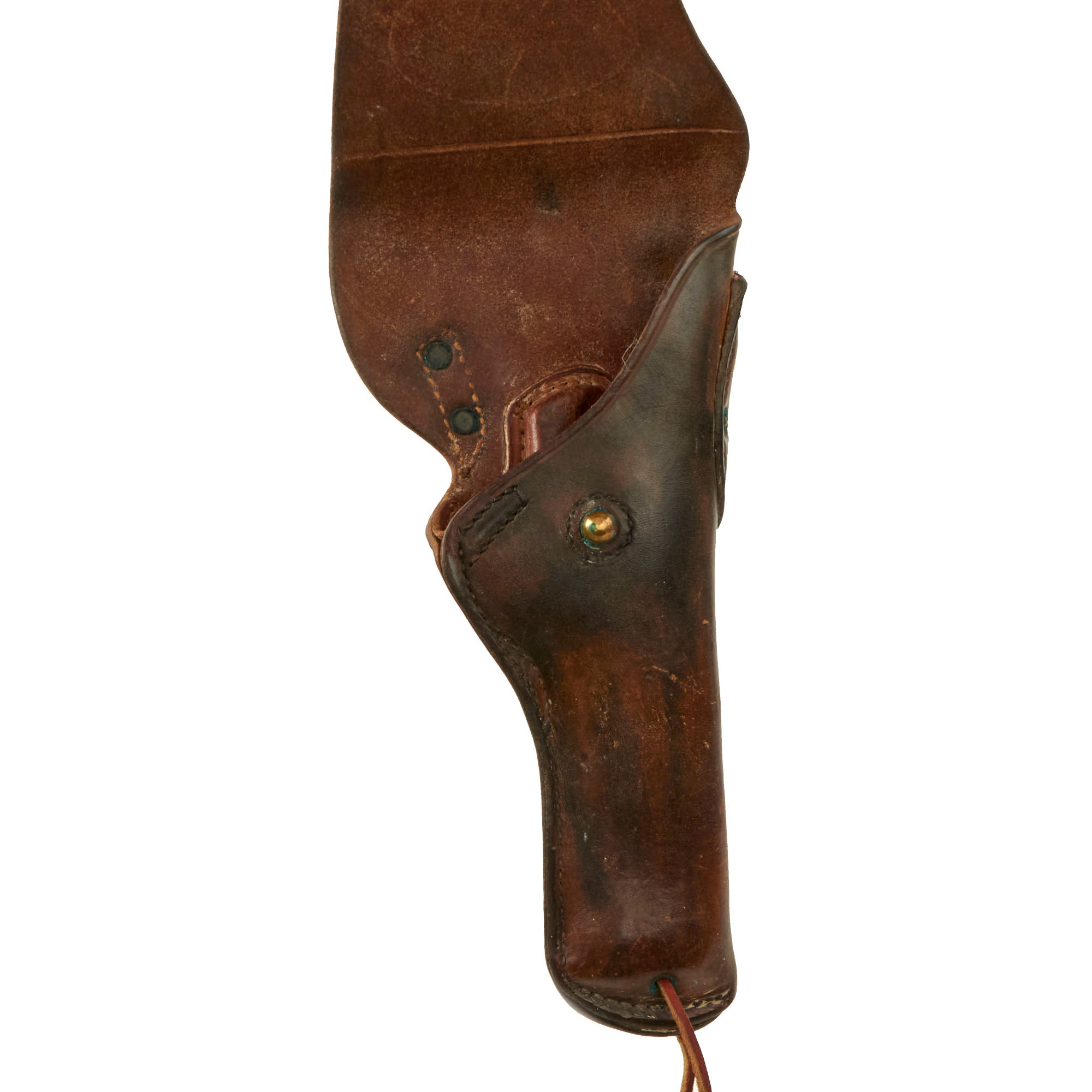 The leather is very dark brown. No major damage to the leather, all stitches still intact, all brass parts still present with a bit of verdigris, and a steel WW2 style belt clip. The leather is still supple as well. There is a small fragment of the leg tie down retained. Just perfect for a high grade WWII issue 1911 .45 pistol.