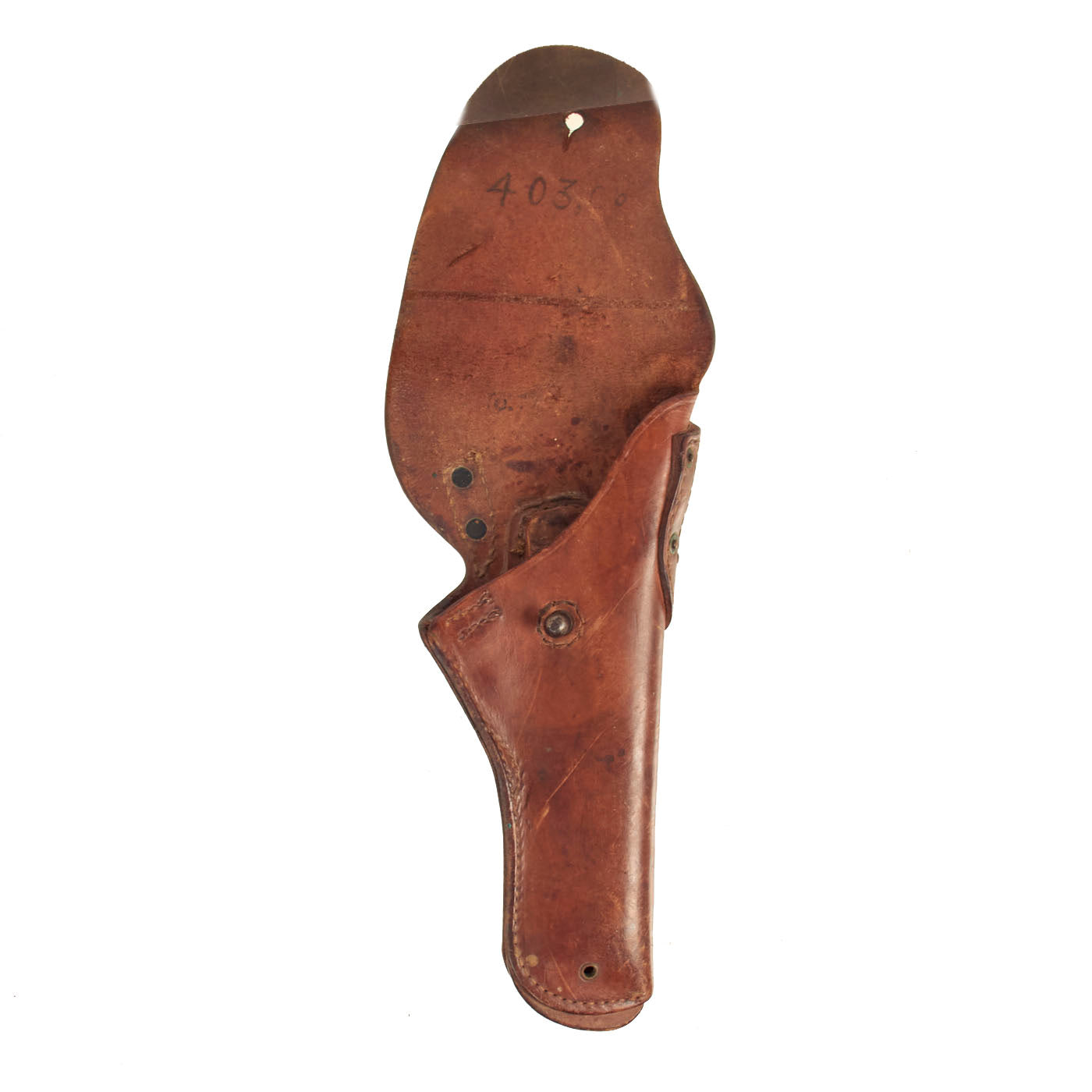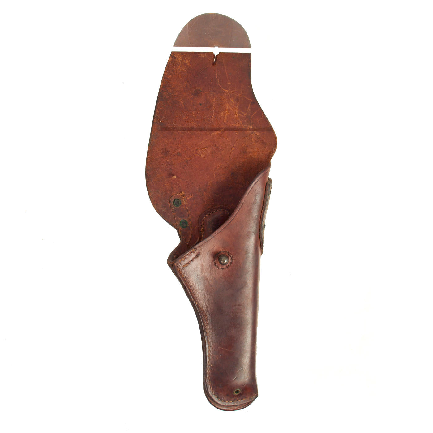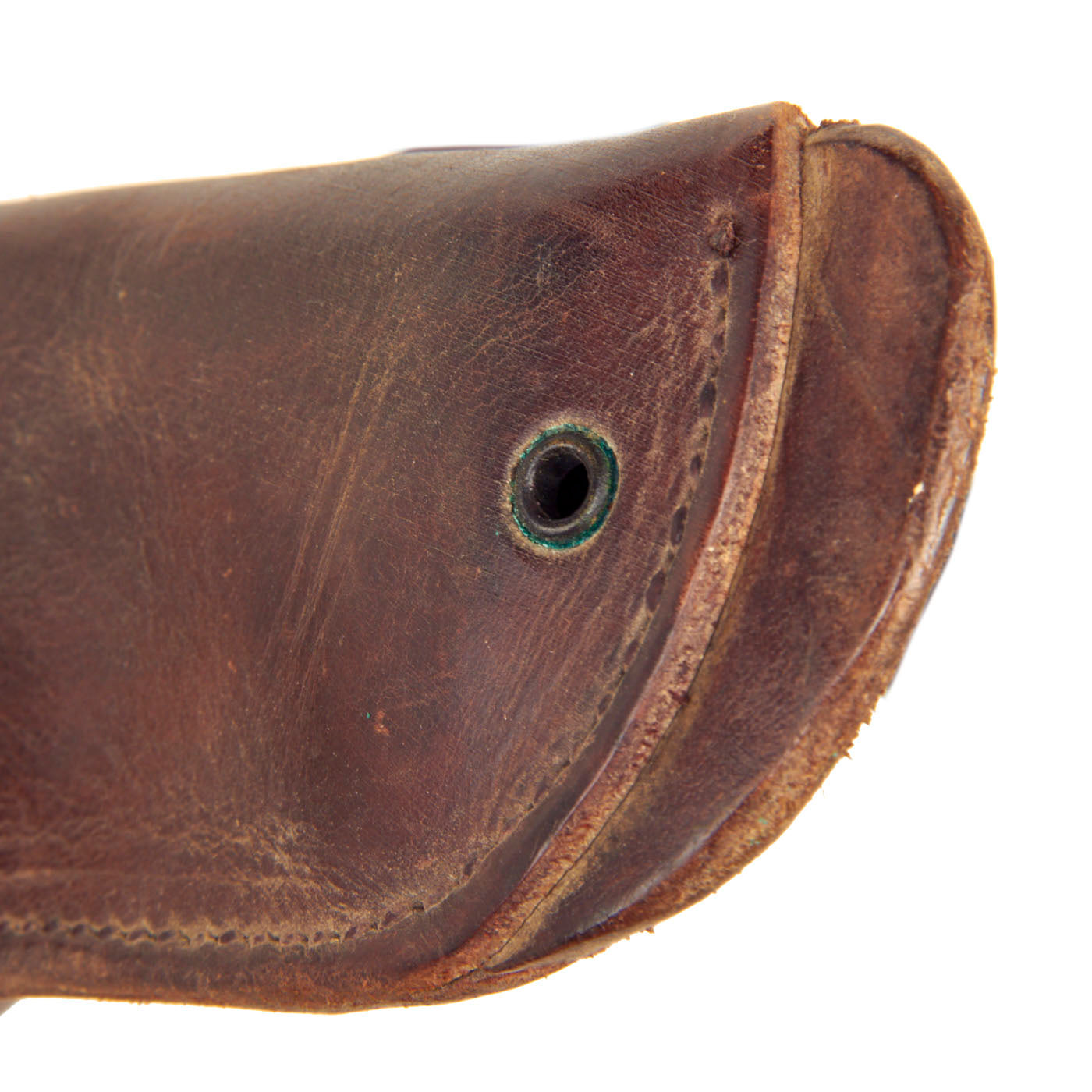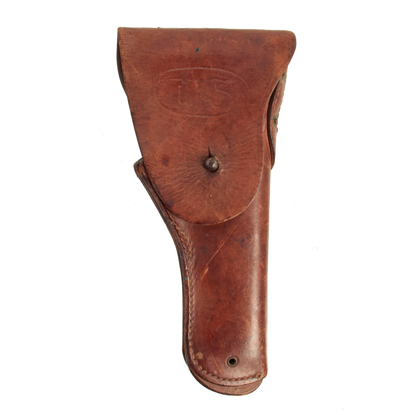 Original Items: Only One Lot of 3 Available. A leather hip holster, the Model 1912, was standardized soon after the M1911’s adoption. This holster had a swivel attachment to make it better adapted to cavalry use. Just before America’s entry into World War I, the Model 1916 holster was adopted, which differed from the M1912 primarily in the deletion of the swivel feature. Both were fitted with wire hooks that attached to the grommets on the bottom of the standard webbed pistol belt or cartridge belt. There were sufficient numbers of World War I M1916 holsters to meet the demand until the U.S. became actively involved in World War II. The M1916 holster was put back into production and almost 3 million were made by 18 different commercial firms between 1941 and 1945. These holsters were embossed with a large “U.S.” on the cover flap, with the name of the maker and year of production on back.