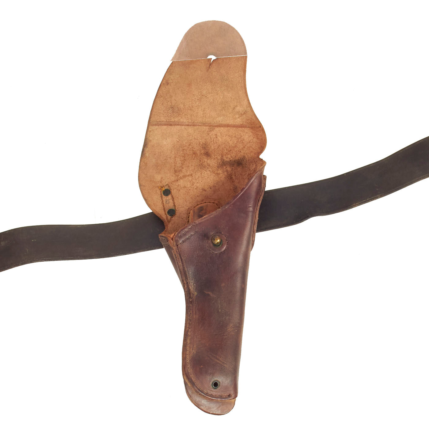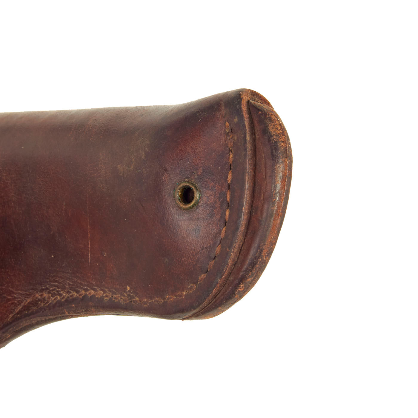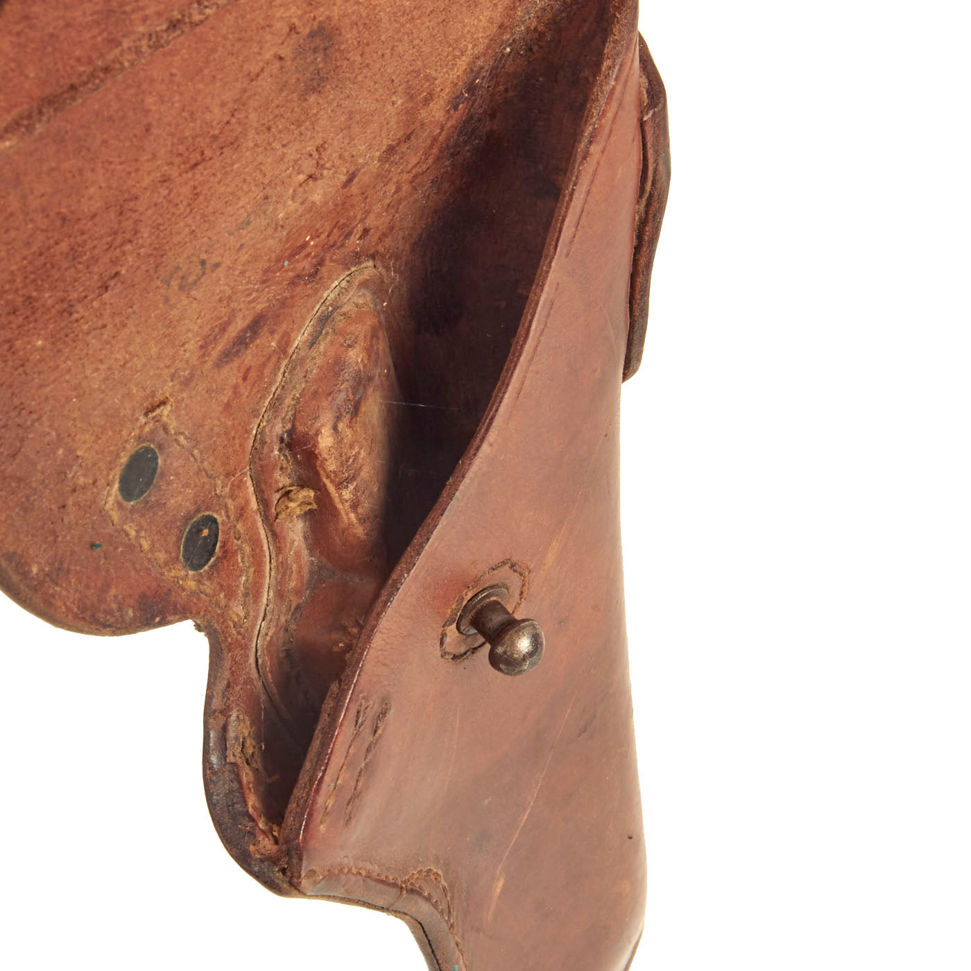 Original Items: Only One Lot of 3 Available. A leather hip holster, the Model 1912, was standardized soon after the M1911’s adoption. This holster had a swivel attachment to make it better adapted to cavalry use. Just before America’s entry into World War I, the Model 1916 holster was adopted, which differed from the M1912 primarily in the deletion of the swivel feature. Both were fitted with wire hooks that attached to the grommets on the bottom of the standard webbed pistol belt or cartridge belt. There were sufficient numbers of World War I M1916 holsters to meet the demand until the U.S. became actively involved in World War II. The M1916 holster was put back into production and almost 3 million were made by 18 different commercial firms between 1941 and 1945. These holsters were embossed with a large “U.S.” on the cover flap, with the name of the maker and year of production on back.